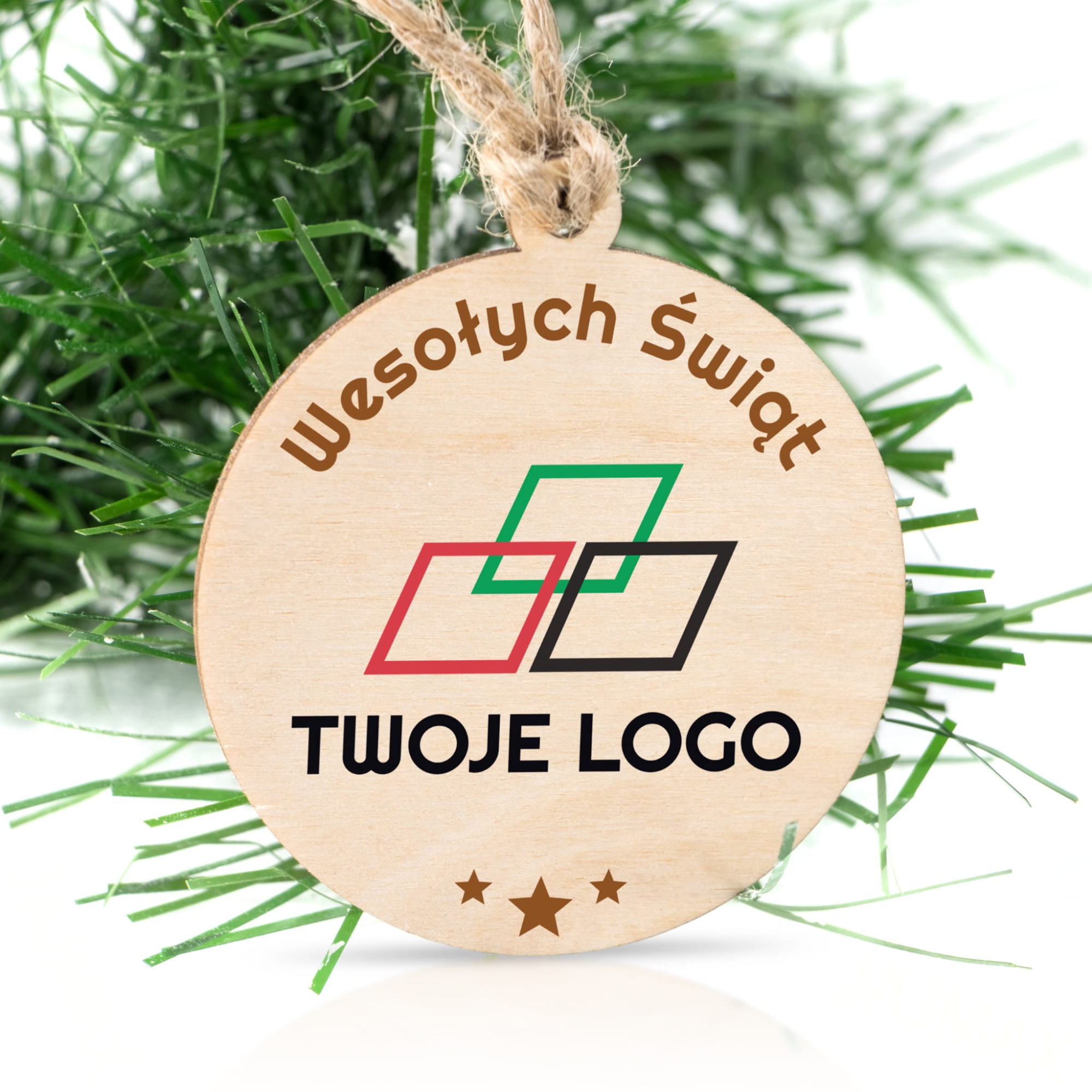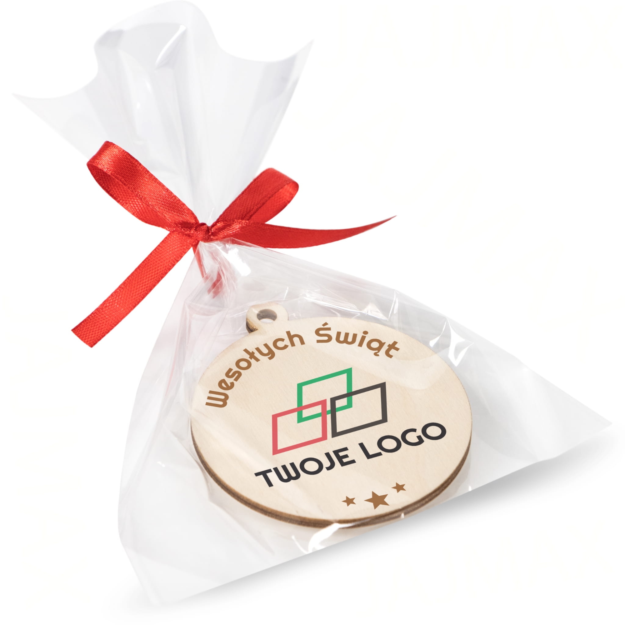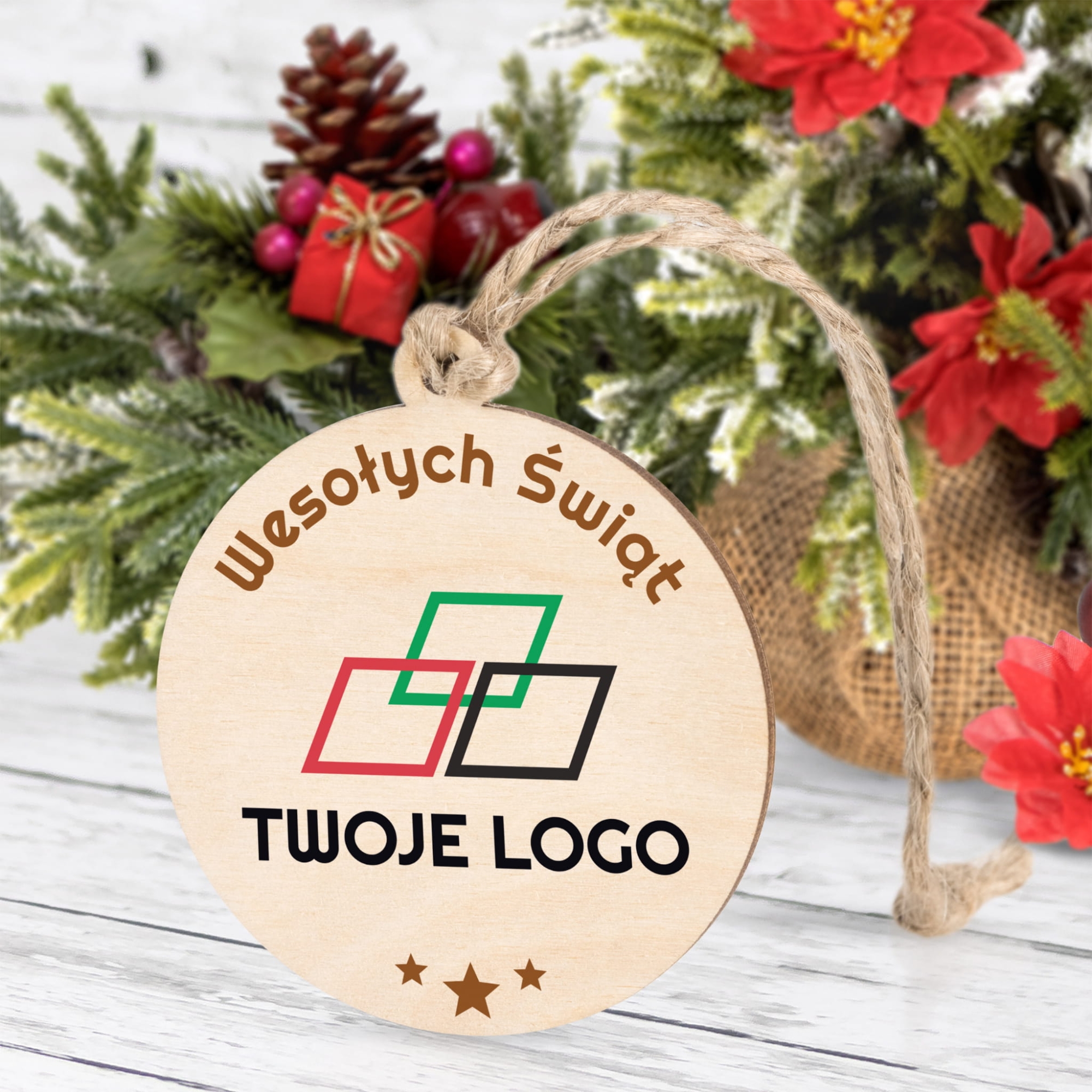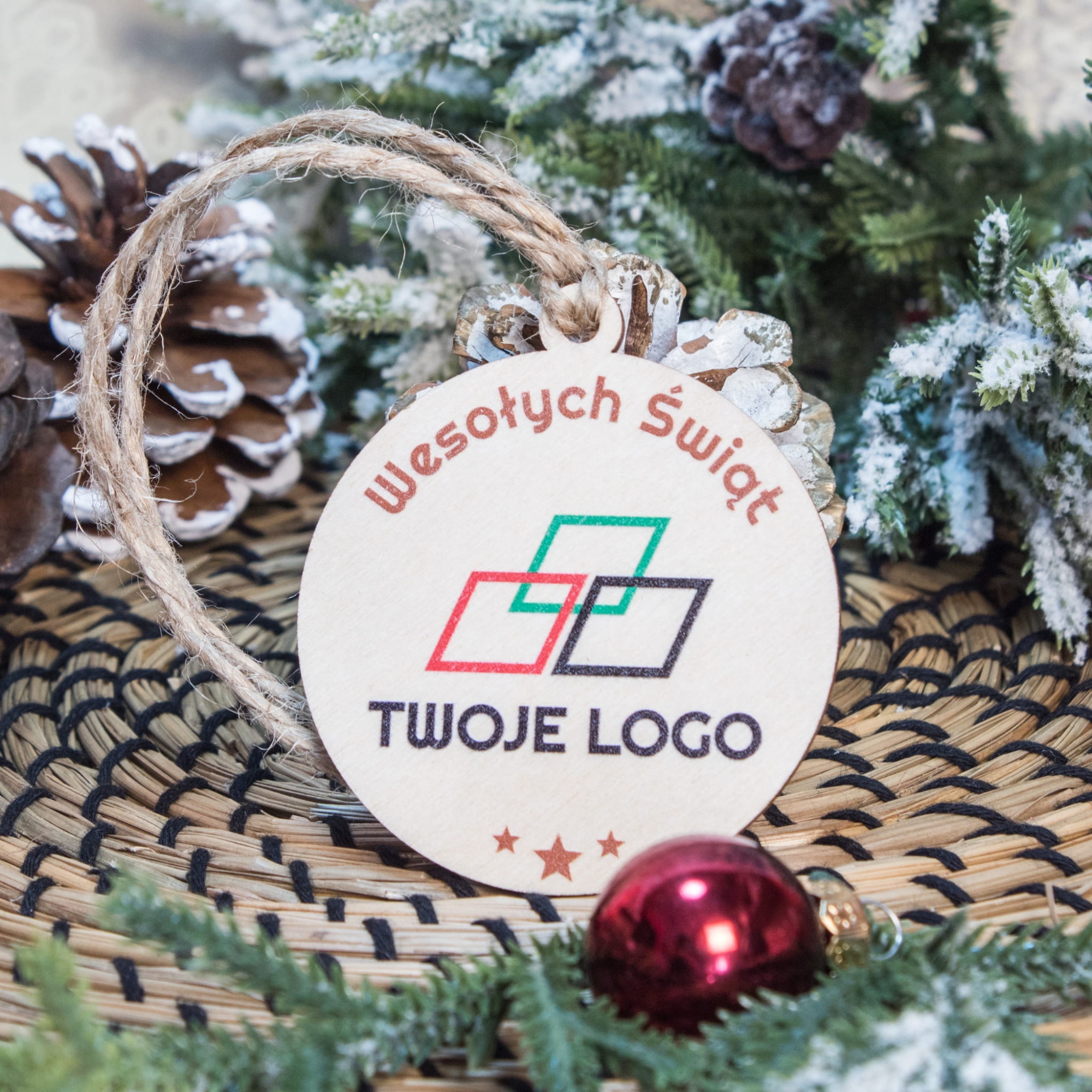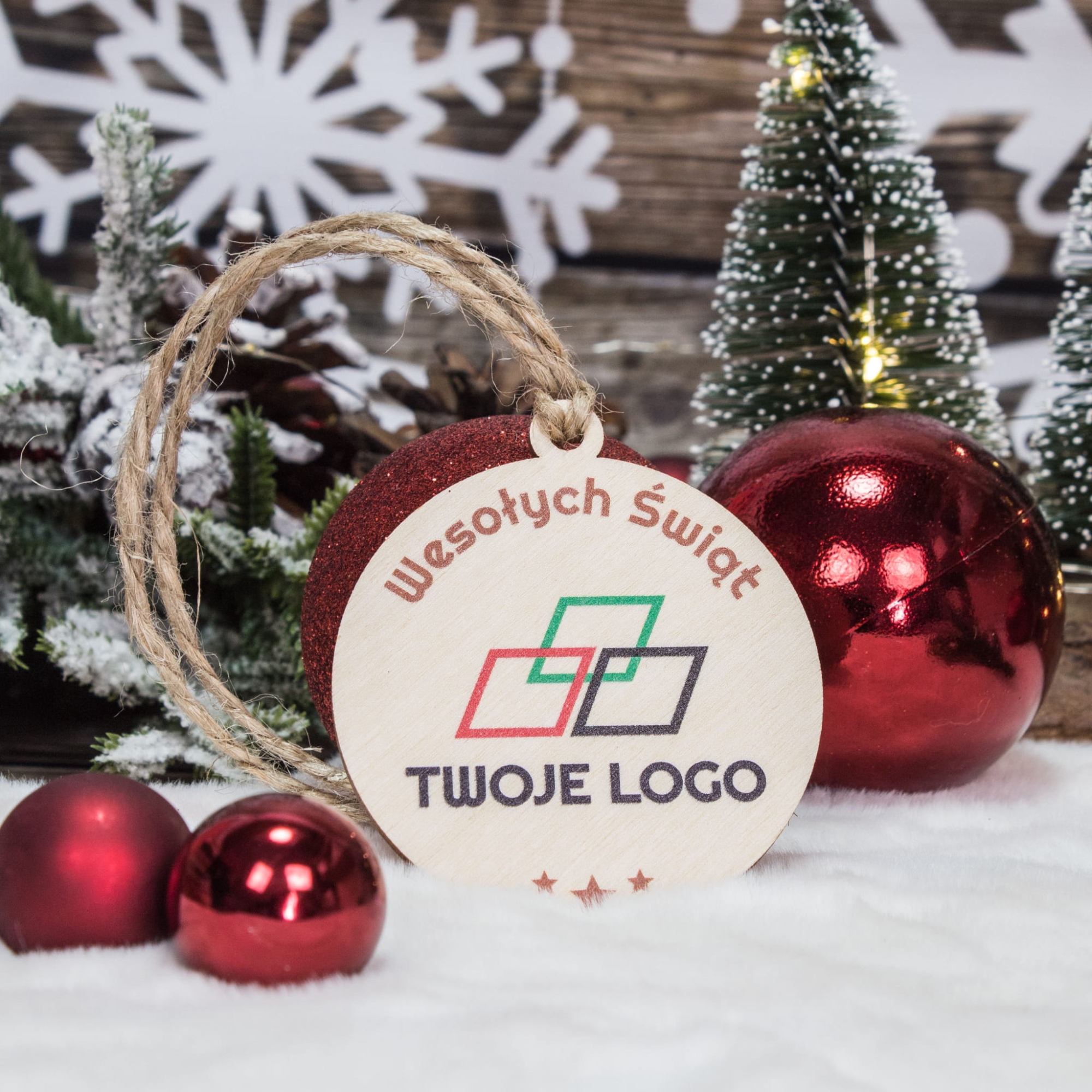 - 1x drewniana bombka z nadrukiem świątecznym i logo firmy