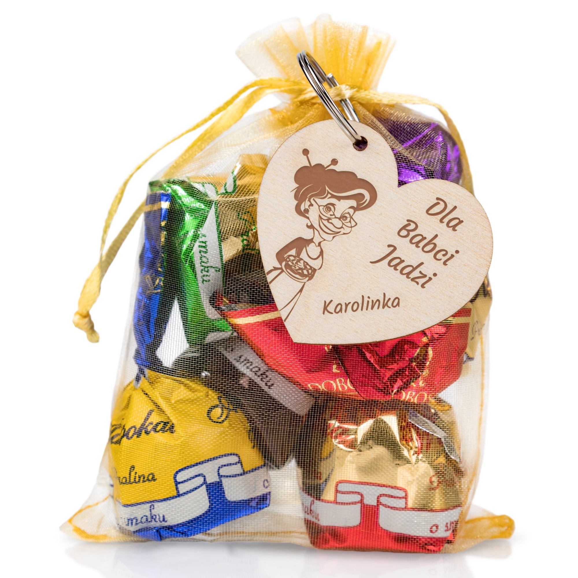 Brelok do kluczy i zestaw słodkości czekoladki w ozdobnym woreczku dla babci i dziadka