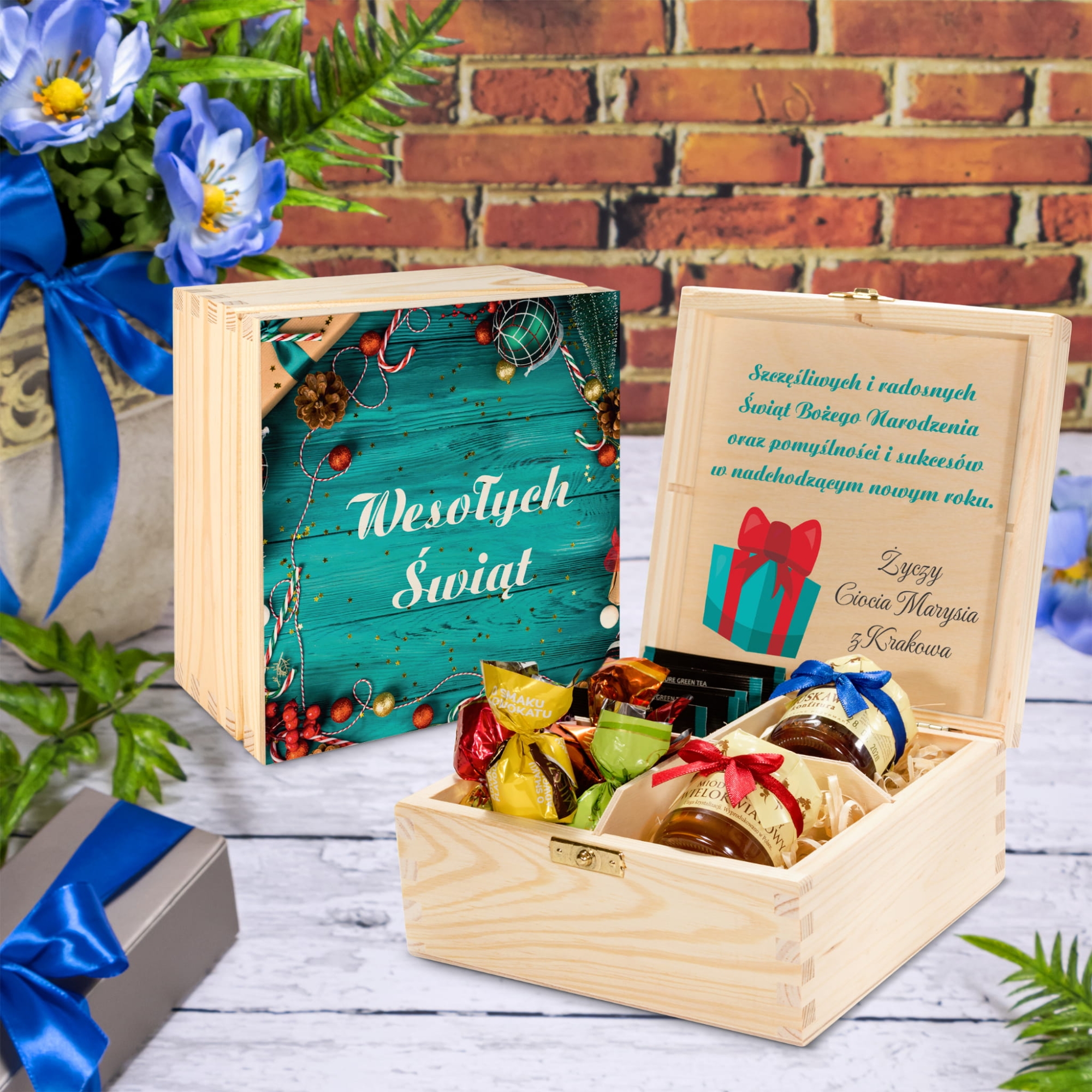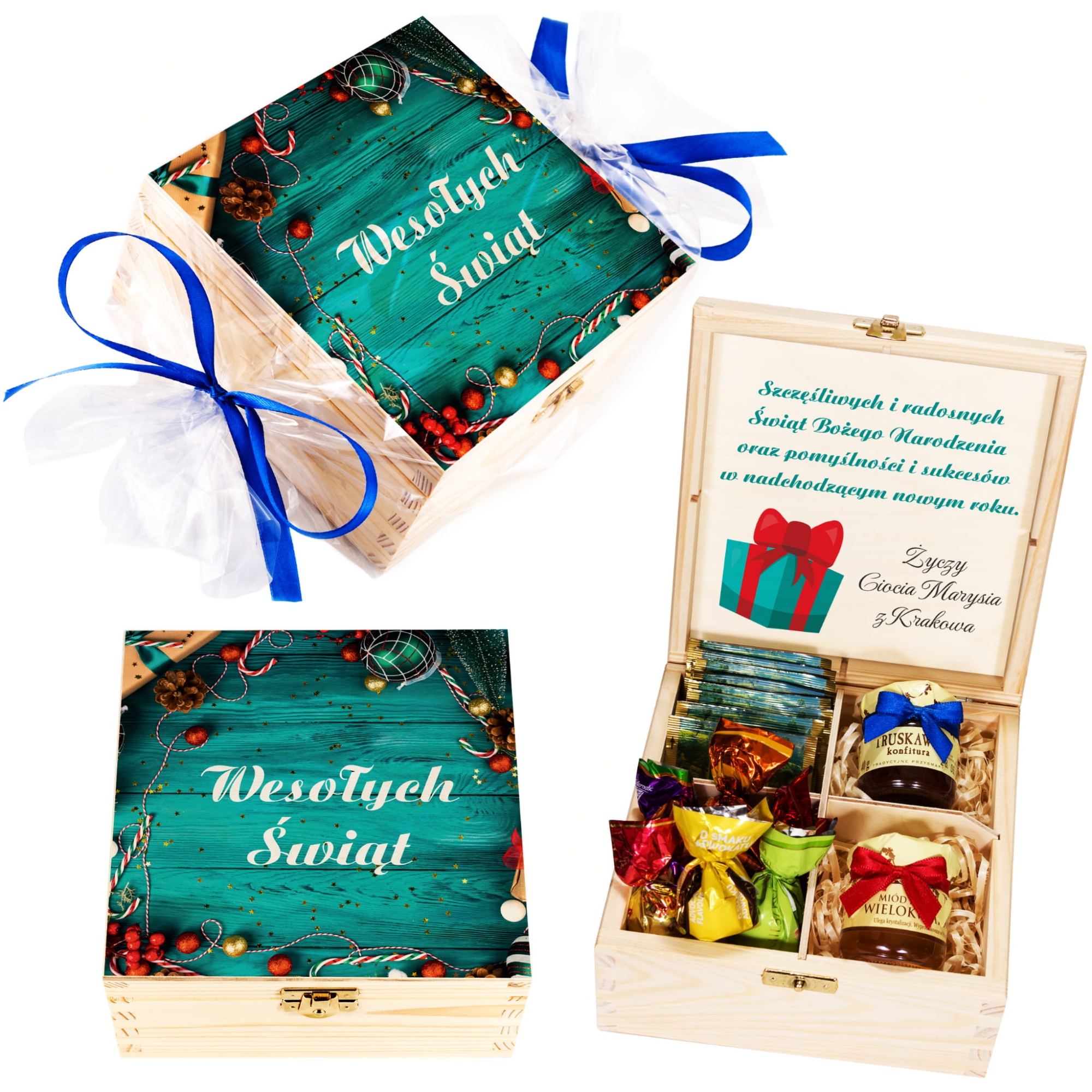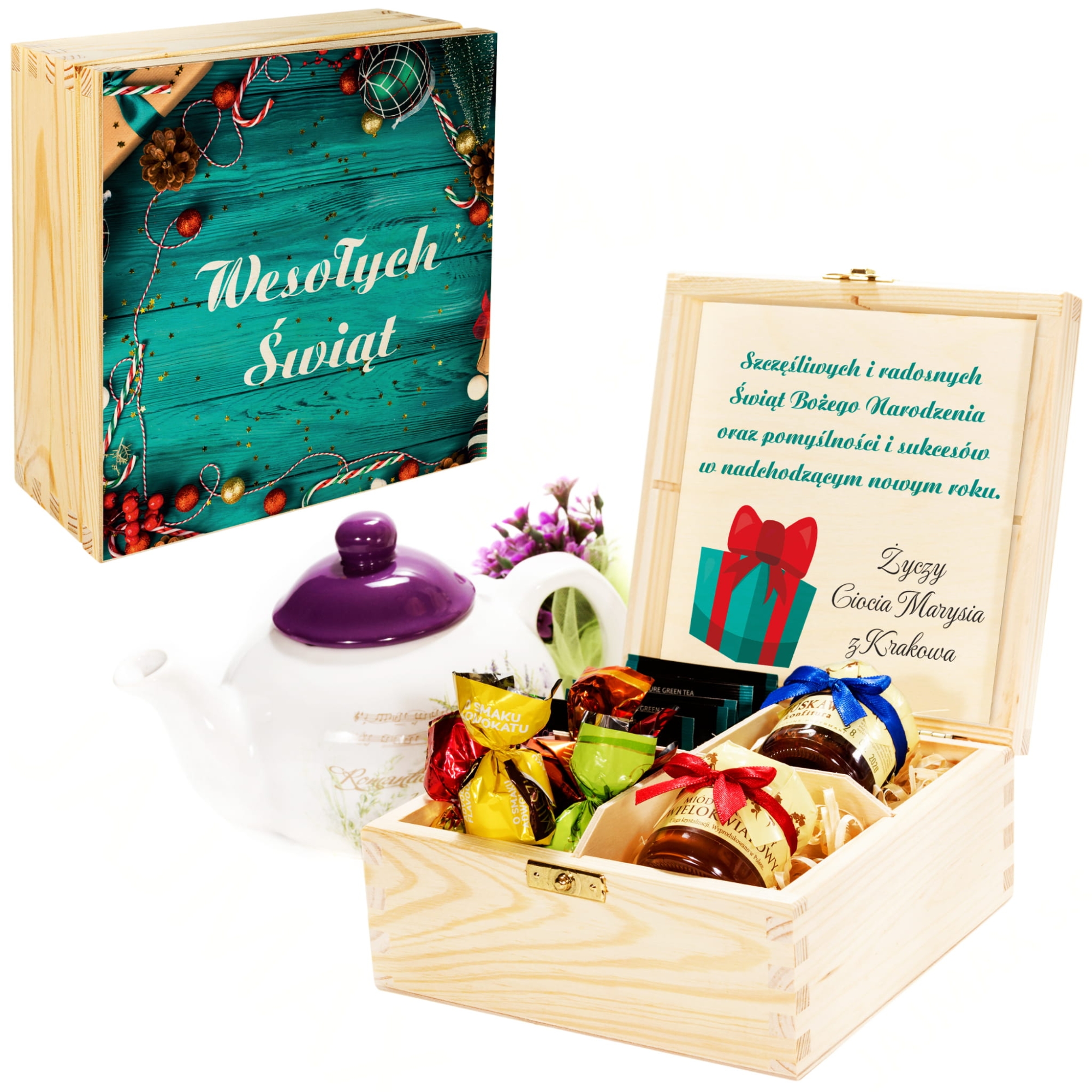 ZESTAW UPOMINKOWY NA ŚWIĘTA herbaciarka z herbatami nadruk Drewniane pudełko słodkości prezent świąteczny z życzeniami nadruk HERBACIARKA z wkładką Box Prezentowy zestaw na Boże Narodzenie