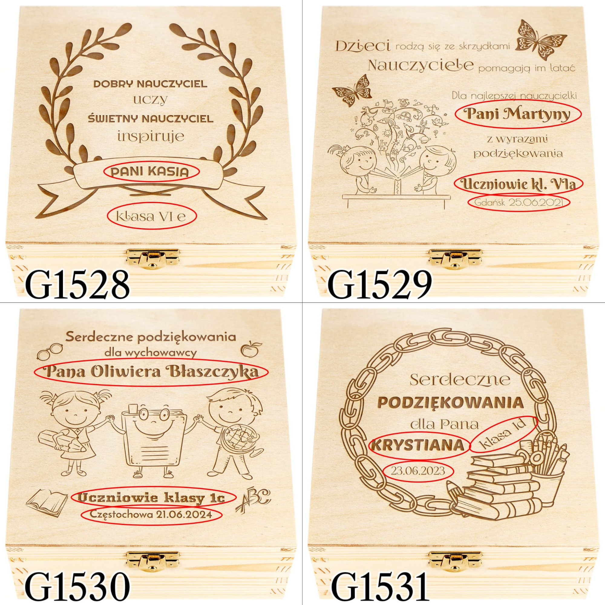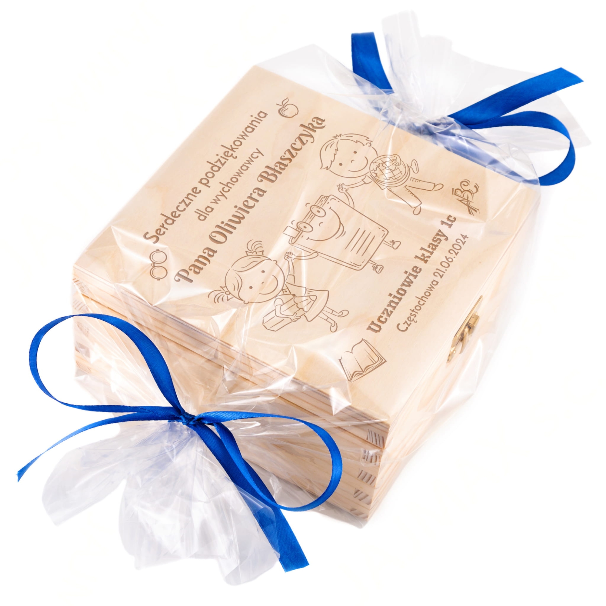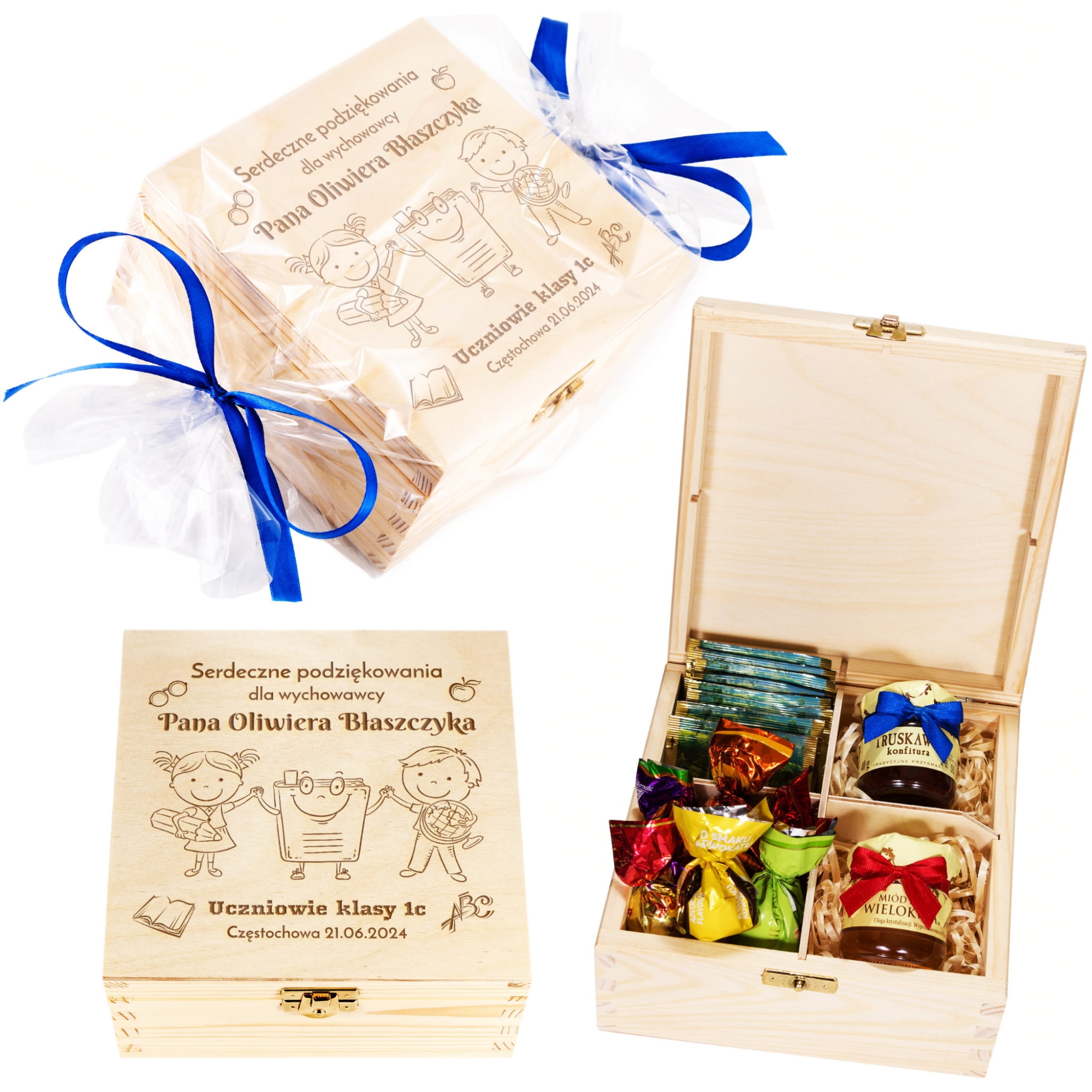Personalizowane drewniane pudełko w zestawie z herbatą, miodem, konfiturą oraz cukierkami to nasza propozycja na oryginalny upominek dla nauczyciela, prezent dla wychowawcy. Świetny pomysł na prezent na Zakończenie Roku i Dzień Nauczyciela w ramach podziękowań. Dzięki indywidualnemu grawerowi jako rodzice bądź uczniowie możecie w wyjątkowy sposób podziękować nauczycielom za ich trud włożony w edukację i wychowanie uczniów.