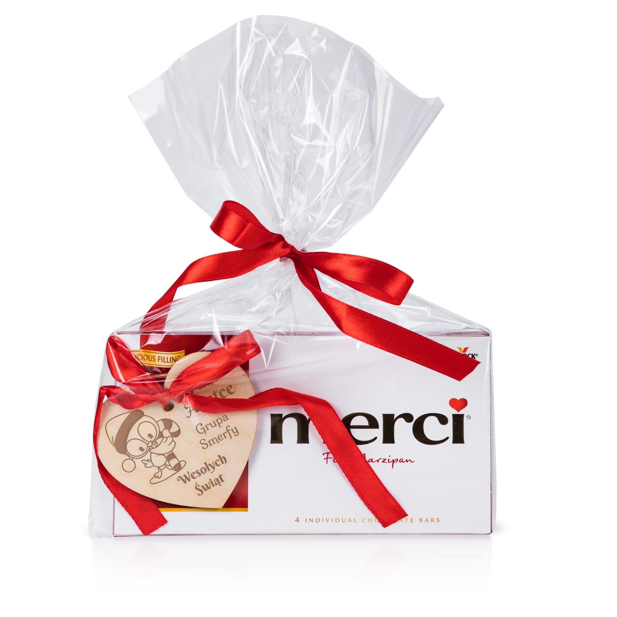 Czekolada Merci i serce z wstążką i grawerem pomysł na prezent na Święta