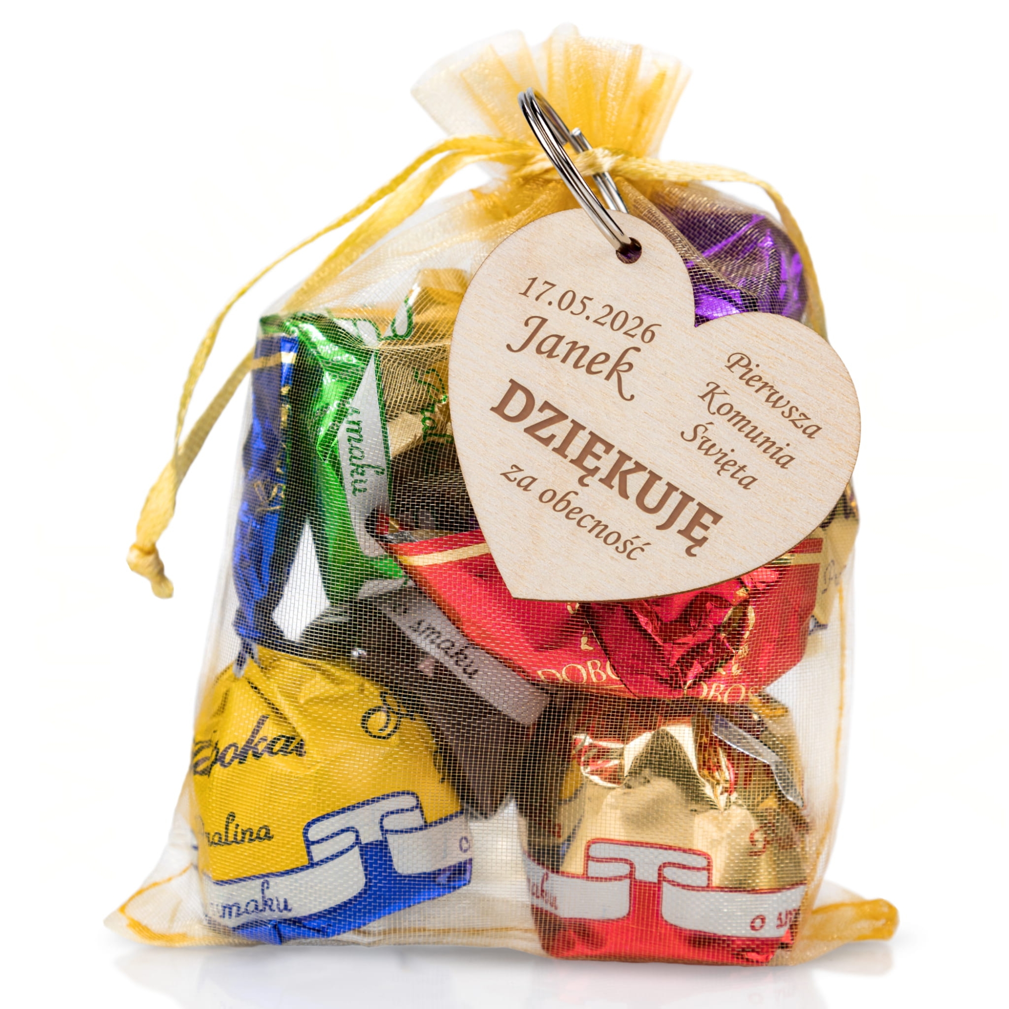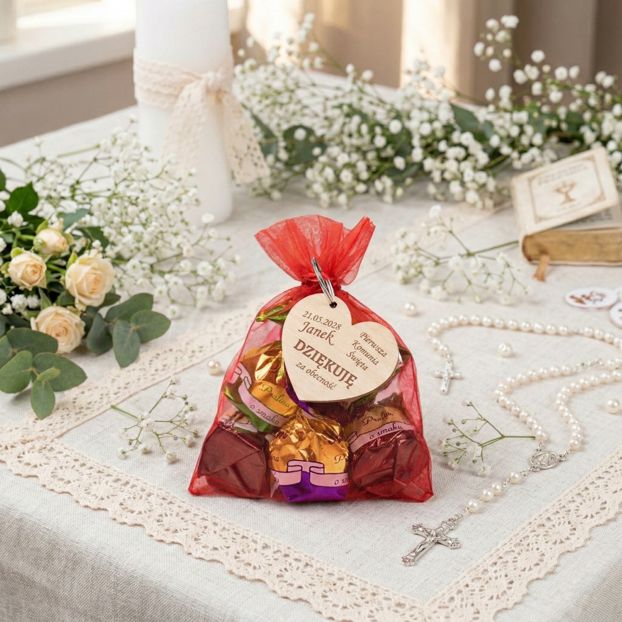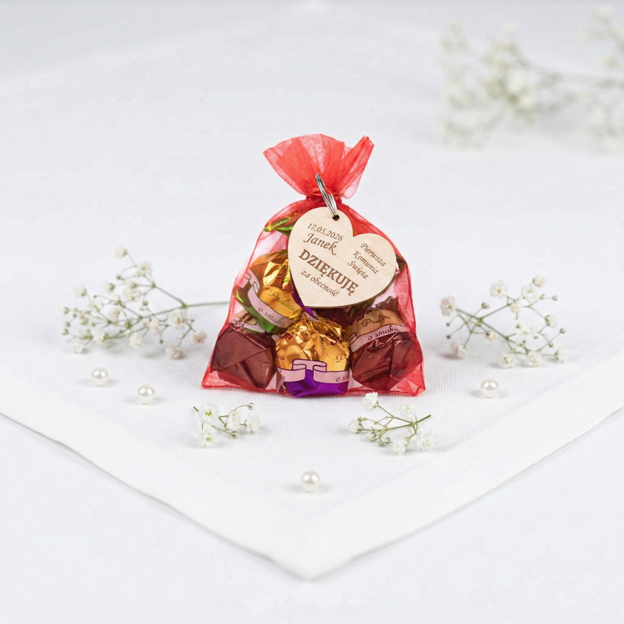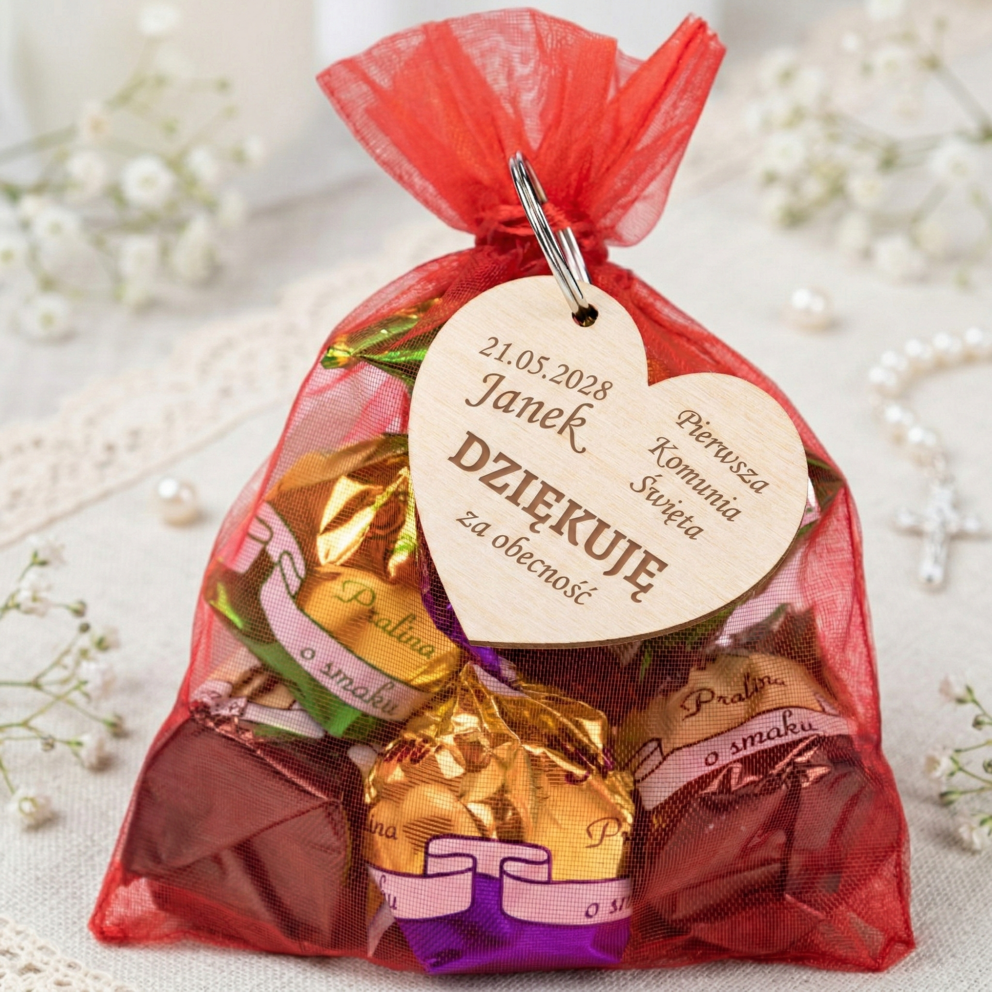 Cukierki w woreczku i brelok serce UPOMINKI DLA GOŚCI KOMUNIA