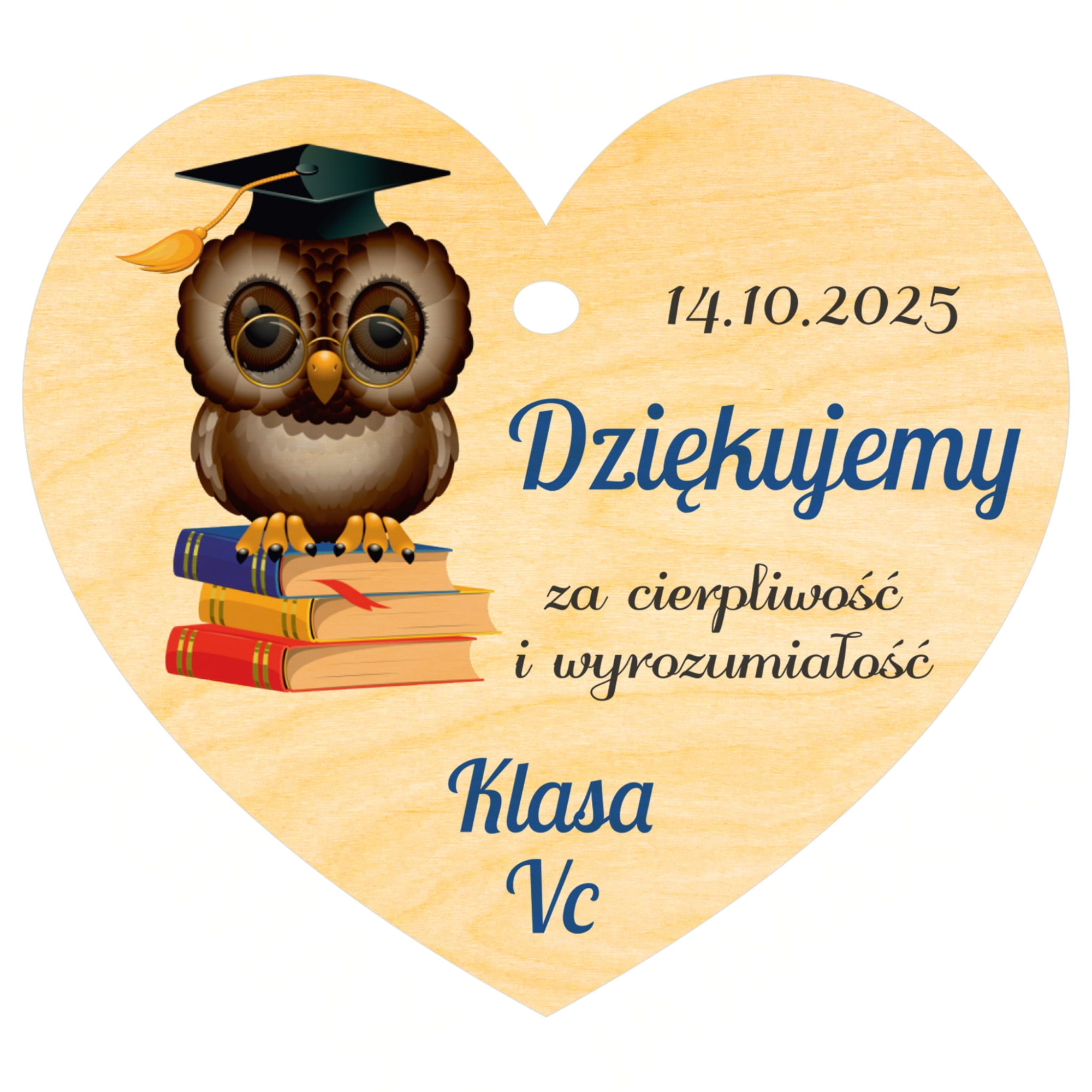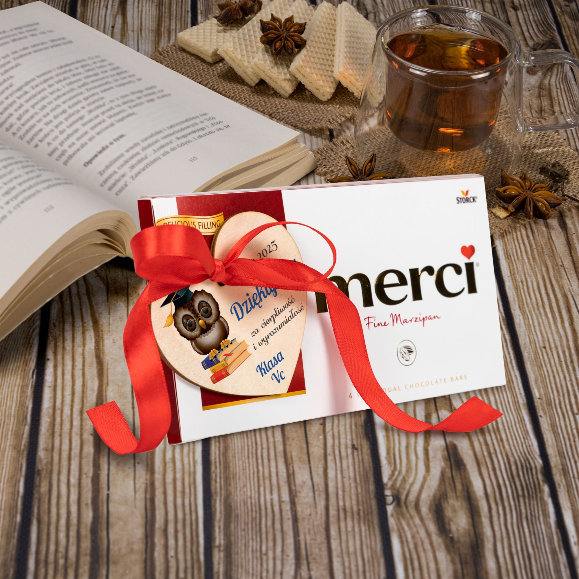 Czekolada Merci dla nauczyciela i serce dziękujemy z podpisem sowa