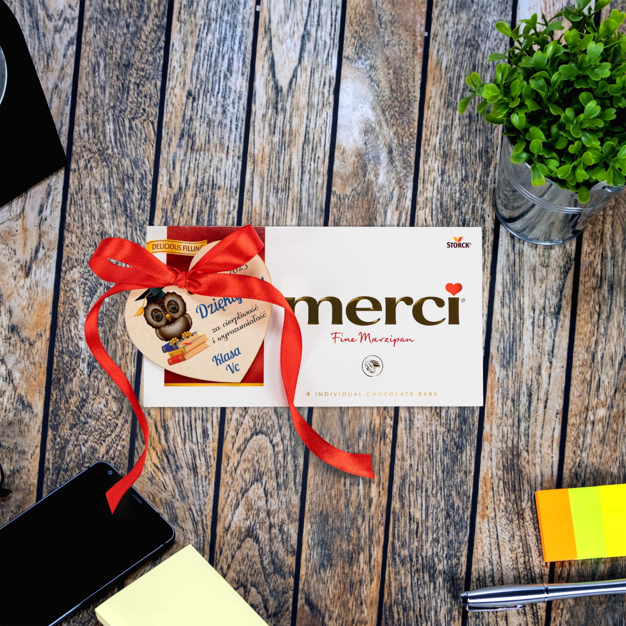 Czekoladki Merci z ozdobnym sercem z dedykacją oryginalny pomysł na prezent dla nauczyciela