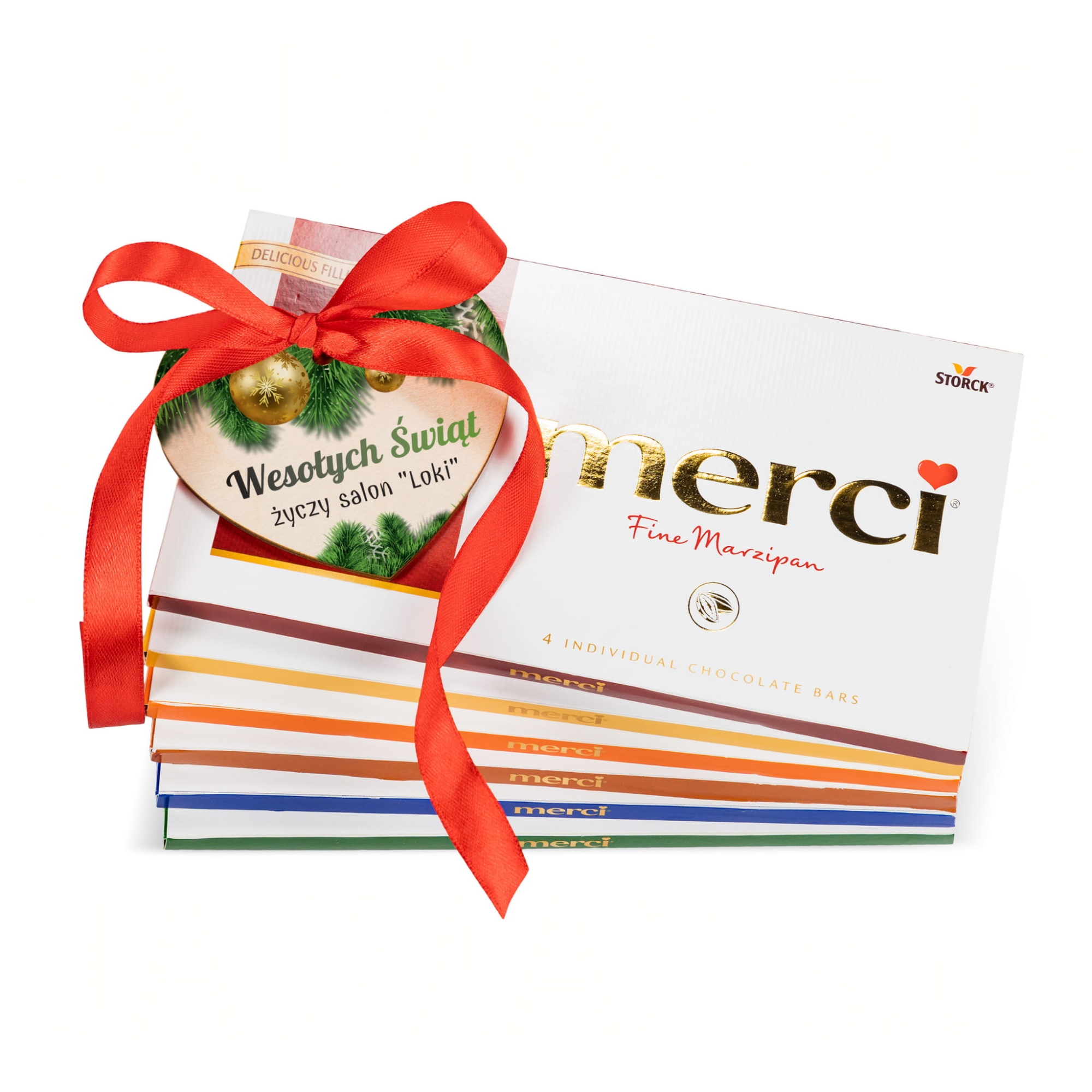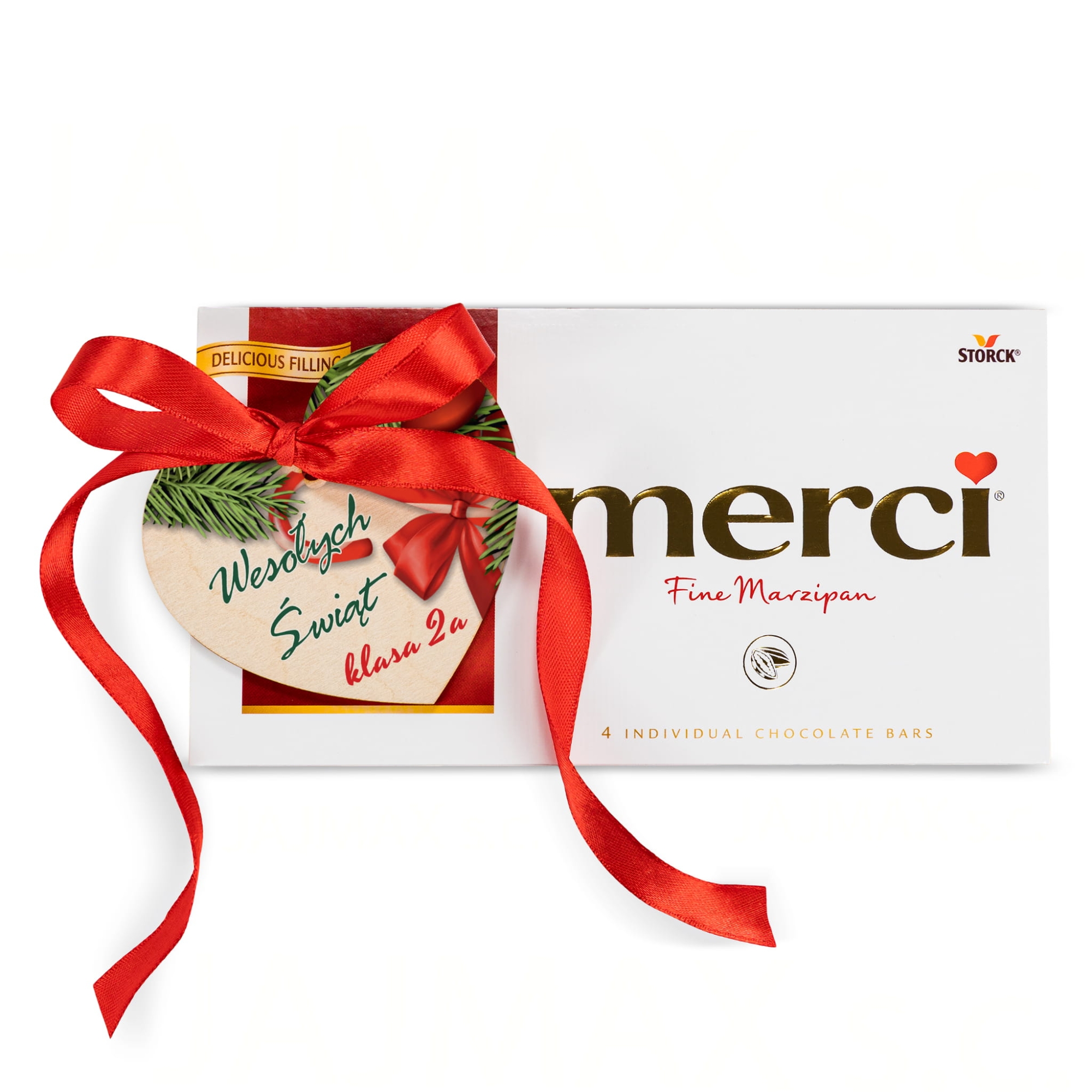 Doskonały pomysł na świąteczny upominek dla nauczyciela, świąteczny upominek dla lekarza lub świąteczny upominek dla rodziny i znajomych. Zamieniliśmy pyszną czekoladę Merci na spersonalizowany prezent pod choinkę. Czekolada Merci ozdobiona jest sercem z nadrukiem i czerwoną wstążeczką. Do wyboru kilka, pięknych świątecznych motywów graficznych. Jeśli lubisz zaskakiwać wybierz naszą czekoladę Merci z sercem na oryginalny prezent na Boże Narodzenie.
