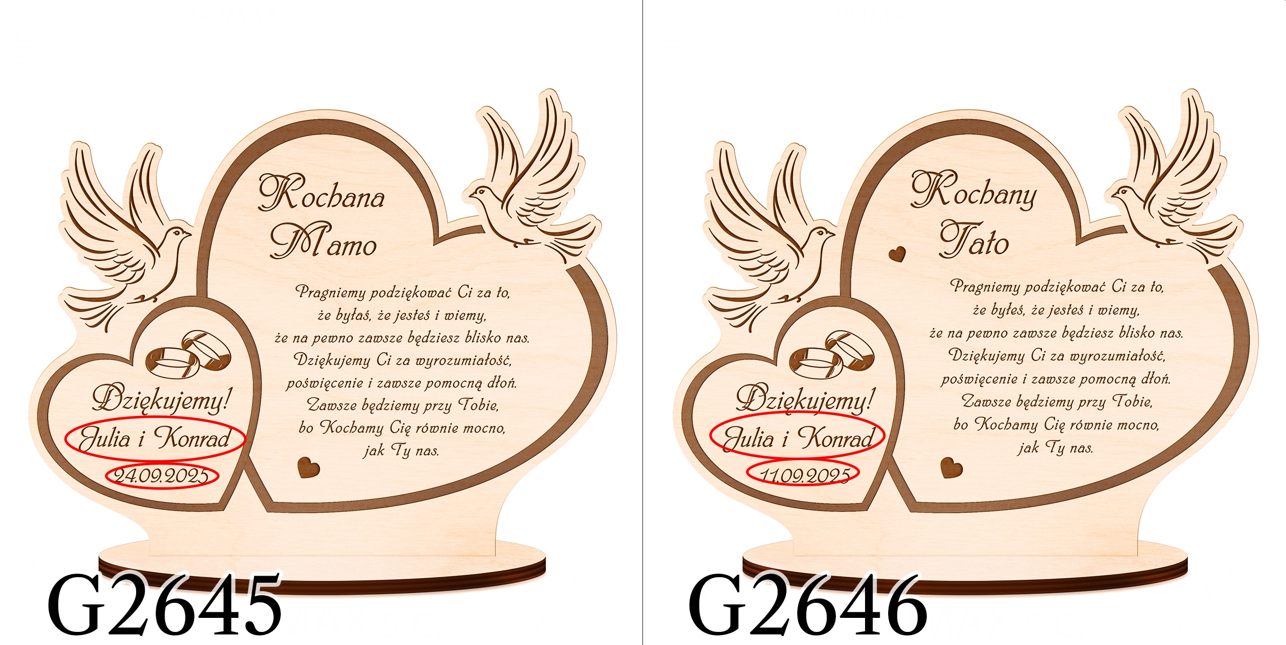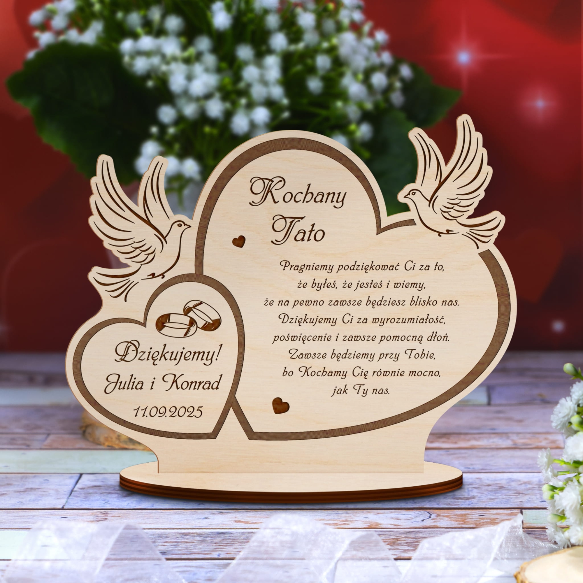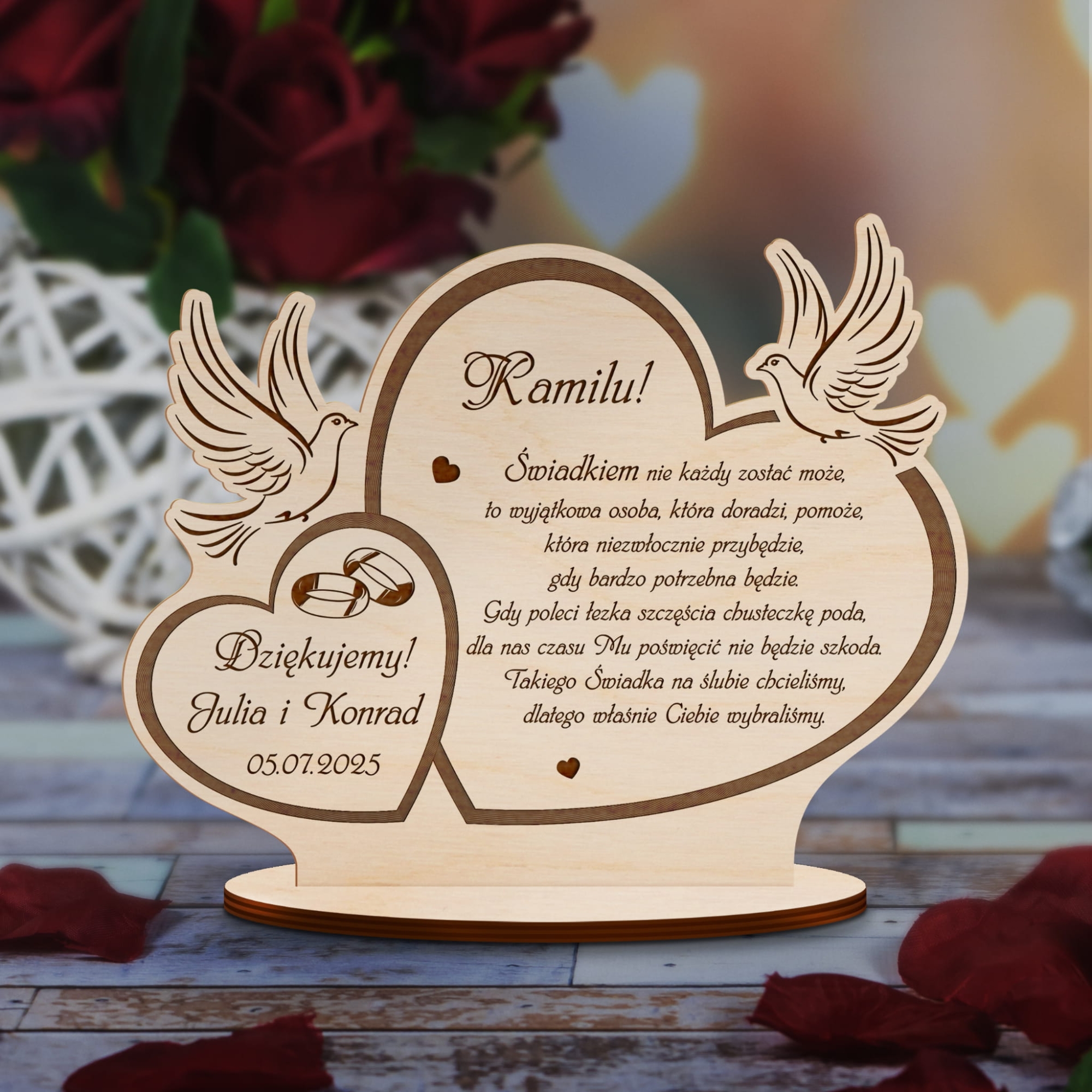 Drewniana statuetka serce gołąbki z indywidualnym grawerem