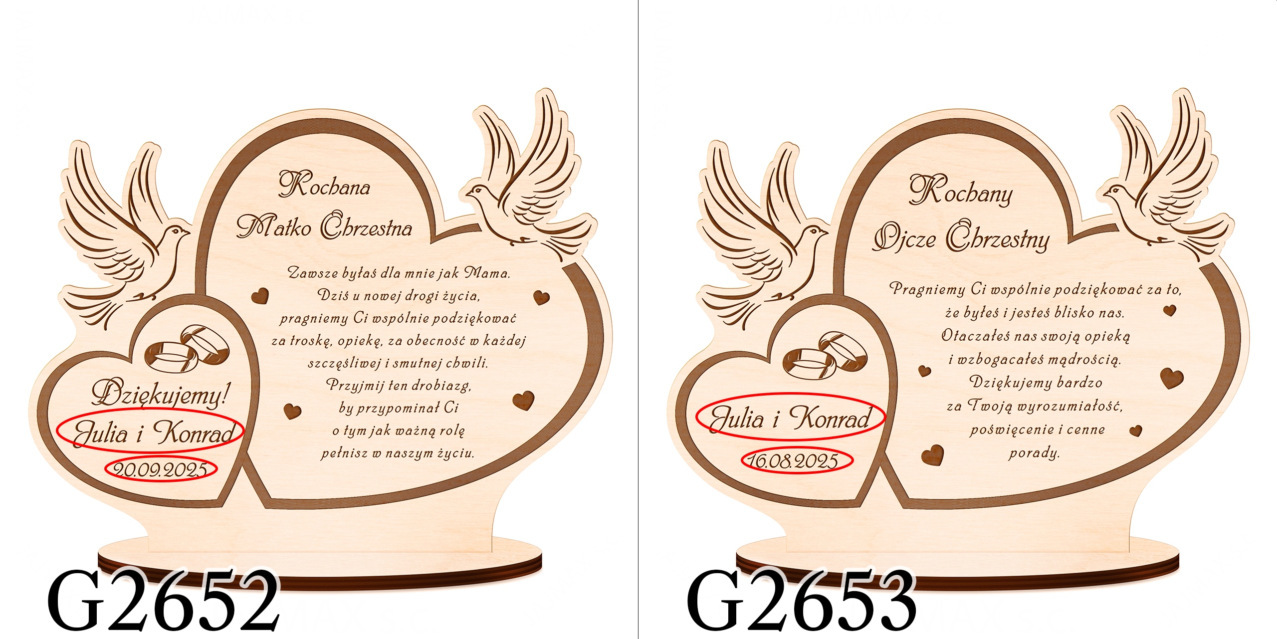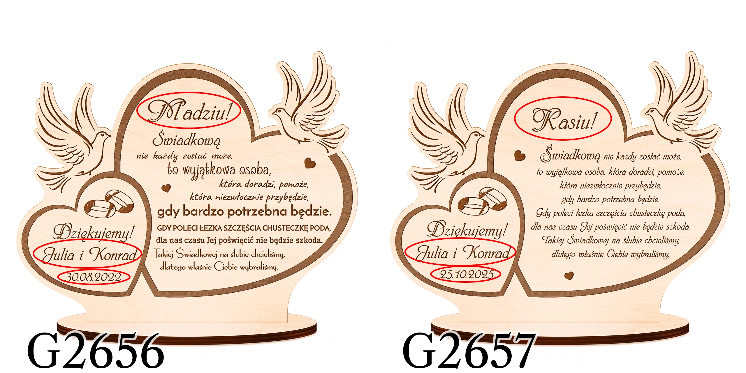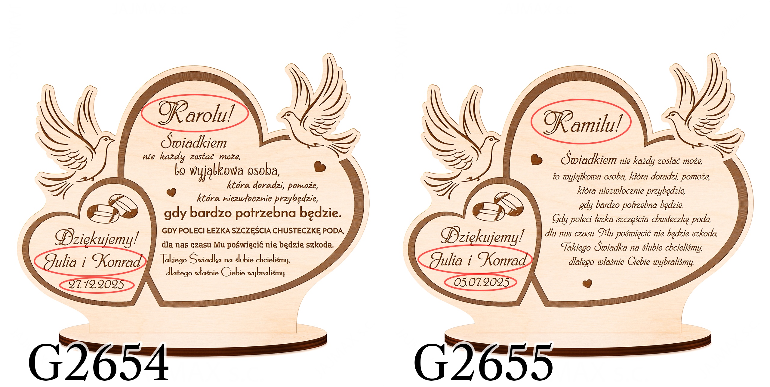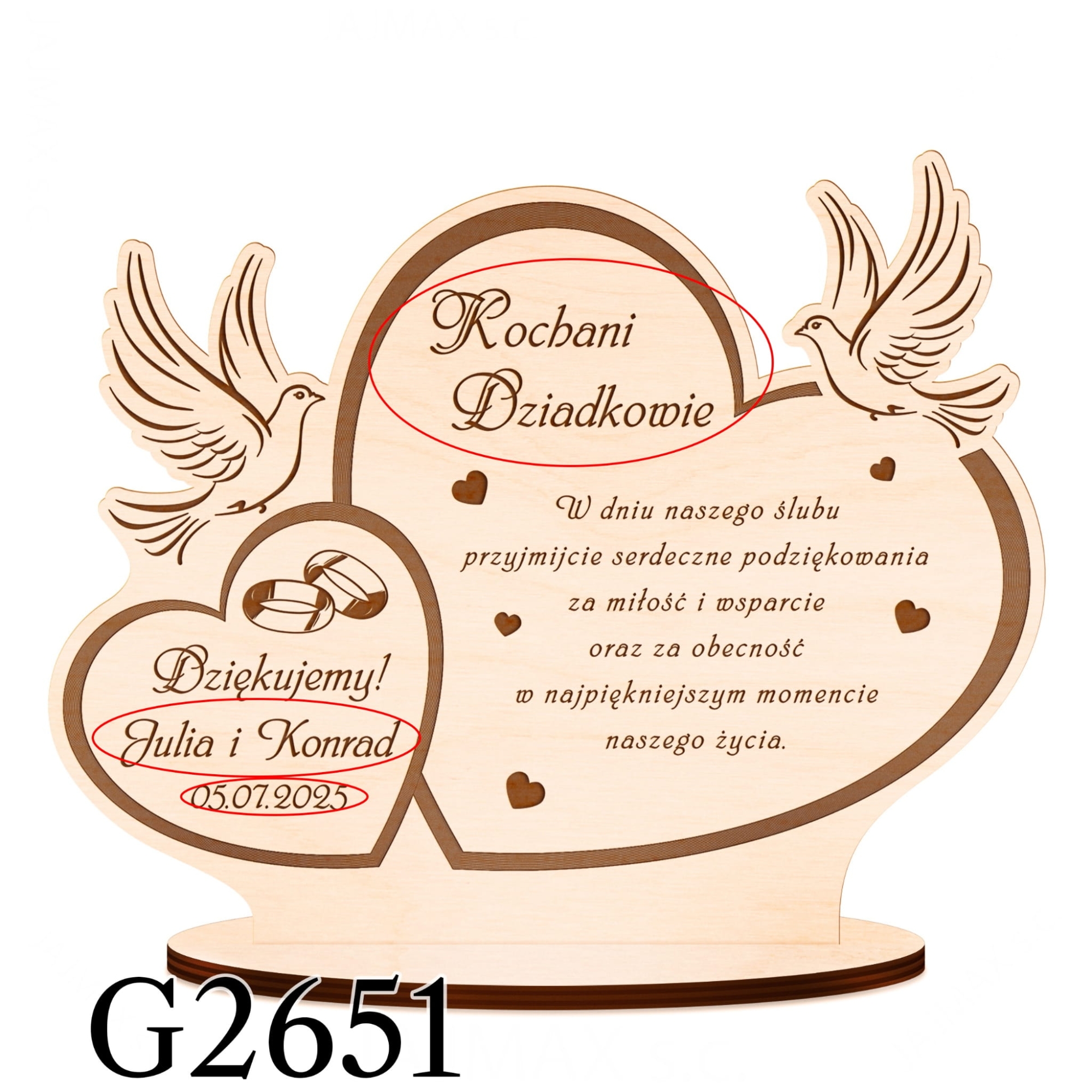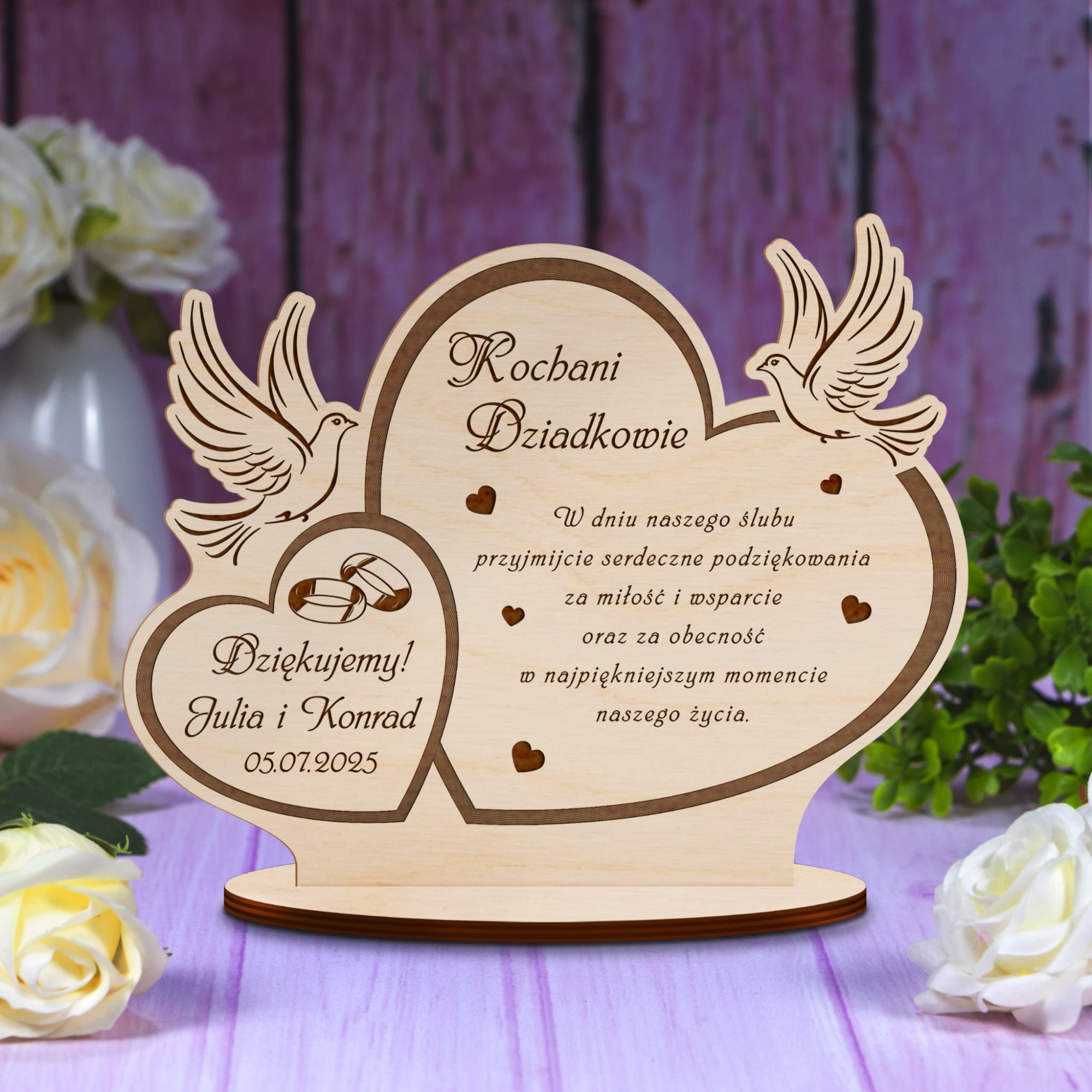 DREWNIANA STATUETKA gołąbki podziękowania dla świadków wesele