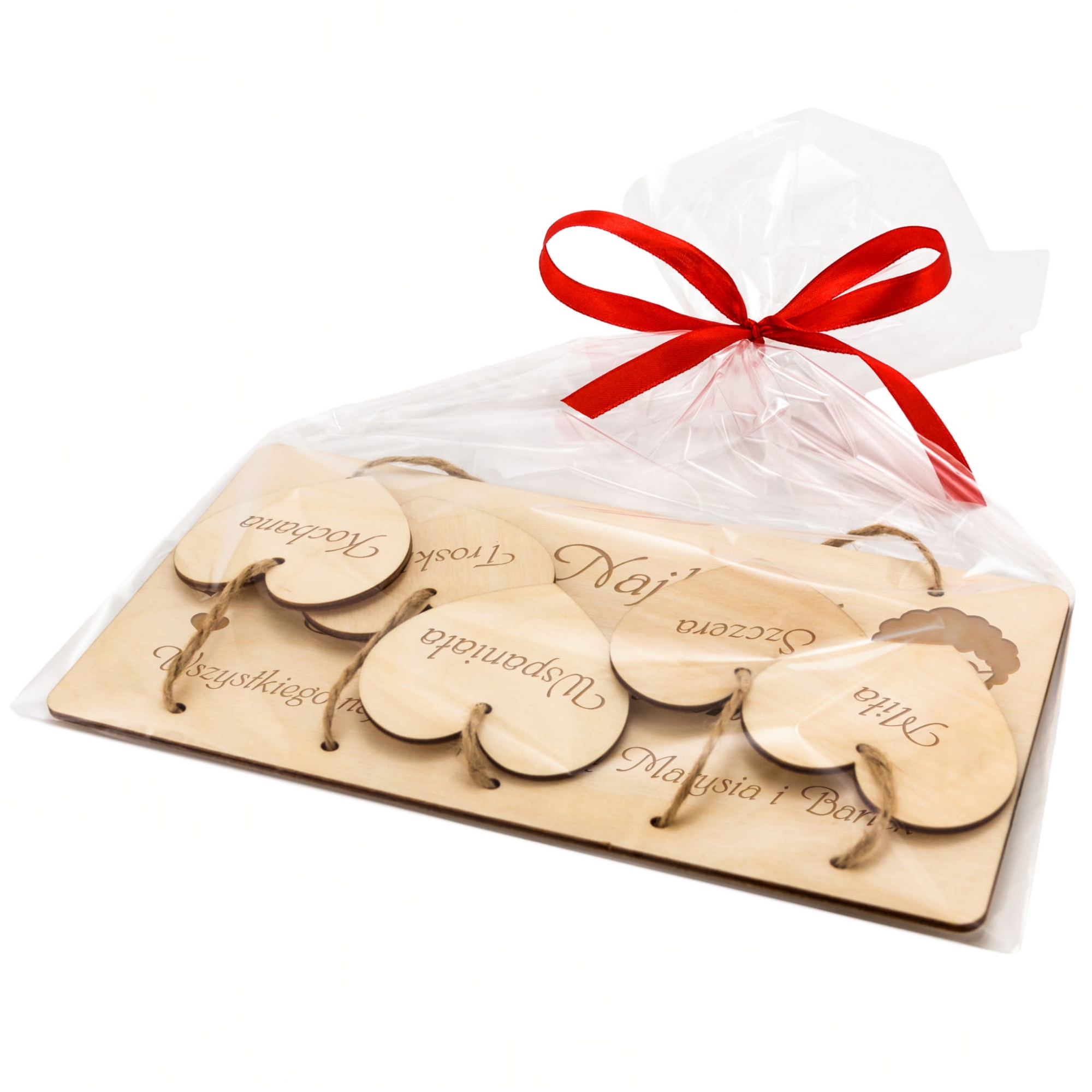 • W zestawie: tabliczka z indywidualnym grawerem, 5 drewnianych serc z grawerem, sznurek jutowy do zawieszenia