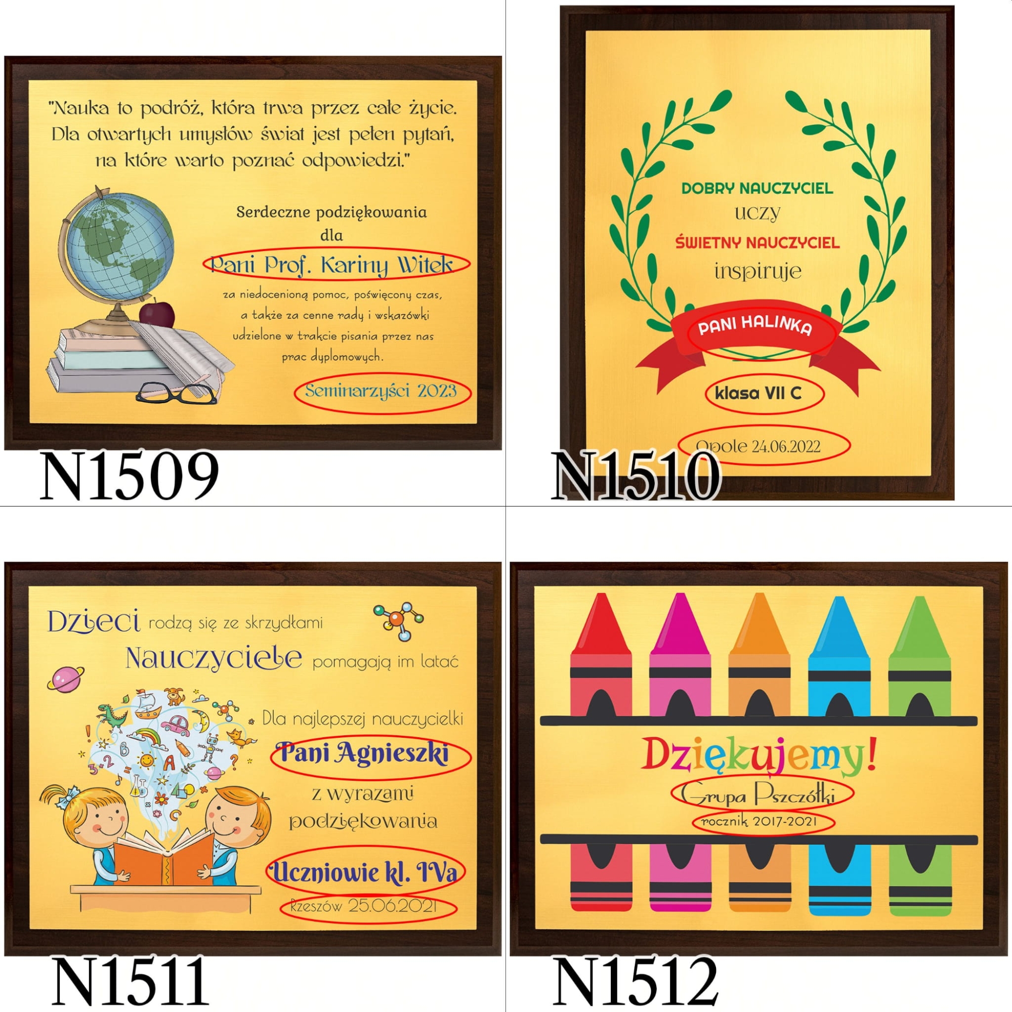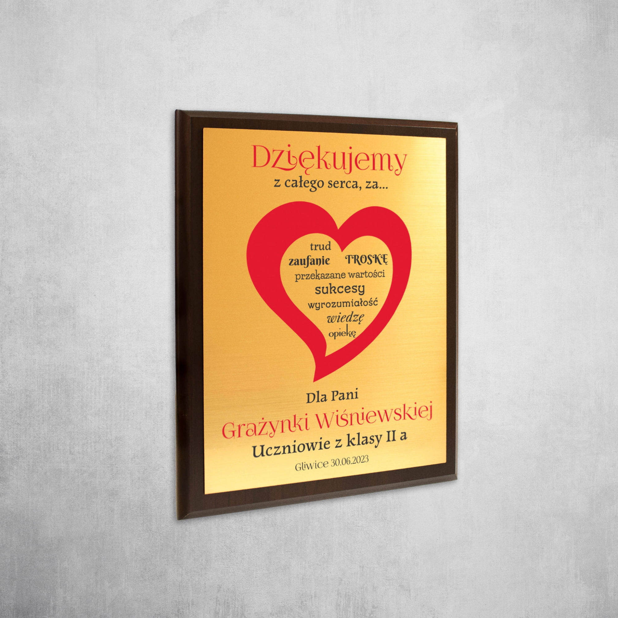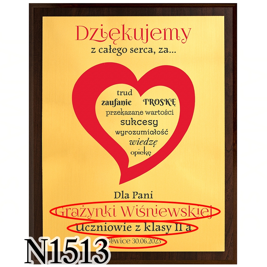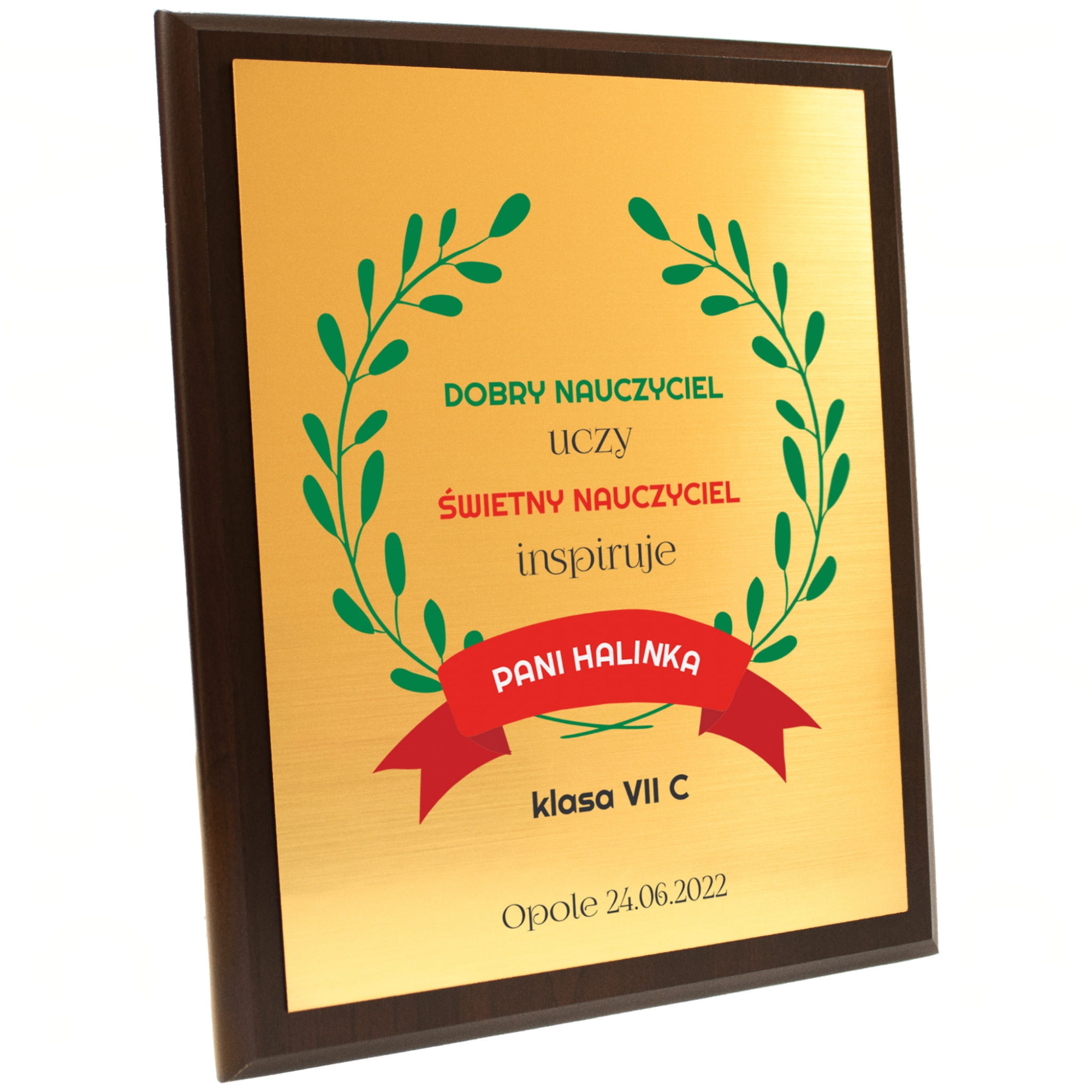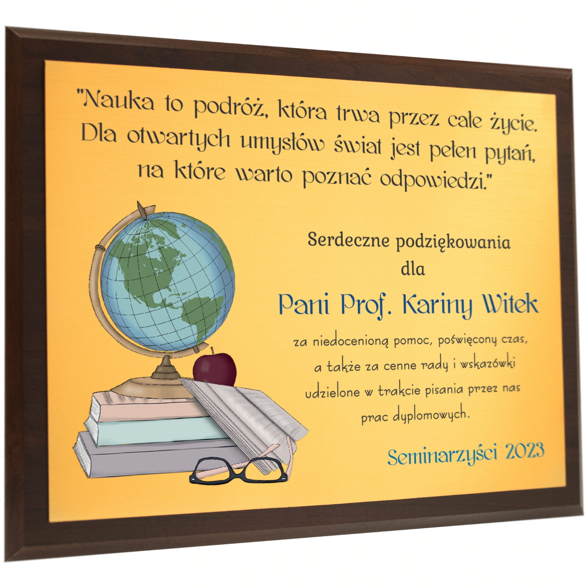 Prezent dla nauczyciela na zakończenie roku szkolnego od całej klasy na Twojej głowie? Niebawem zakończenie roku, a Ty jako rodzic ciągle nie wiesz jaki prezent na zakończenie przedszkola podarować wychowawcy? Mamy dla Ciebie doskonały pomysł na prezent dla nauczyciela. Dyplom z indywidualnym nadrukiem to świetna pamiątka na zakończenie roku i Dzień Nauczyciela. Nasz obrazek za sprawą połączenia ciemnobrązowego drewnianego podkładu i złotej tabliczki z laminatu prezentuje się bardzo elegancko. Podziękowania dla nauczyciela w takiej wersji z pewnością wyróżnią się spośród popularnych kwiatów i słodyczy. Personalizacja sprawi, że pamięć o uczniach wręczających ten upominek dla nauczyciela pozostanie z nim na wiele lat. Nasz dyplom dla nauczyciela można zarówno zawiesić na ścianie jak i postawić na półce co stanowi dodatkową zaletę tego produktu.