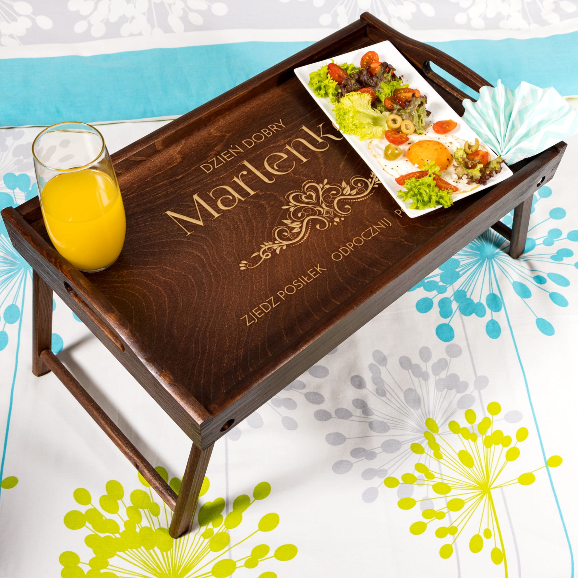 Drewniany stolik śniadaniowy z indywidualnym grawerem