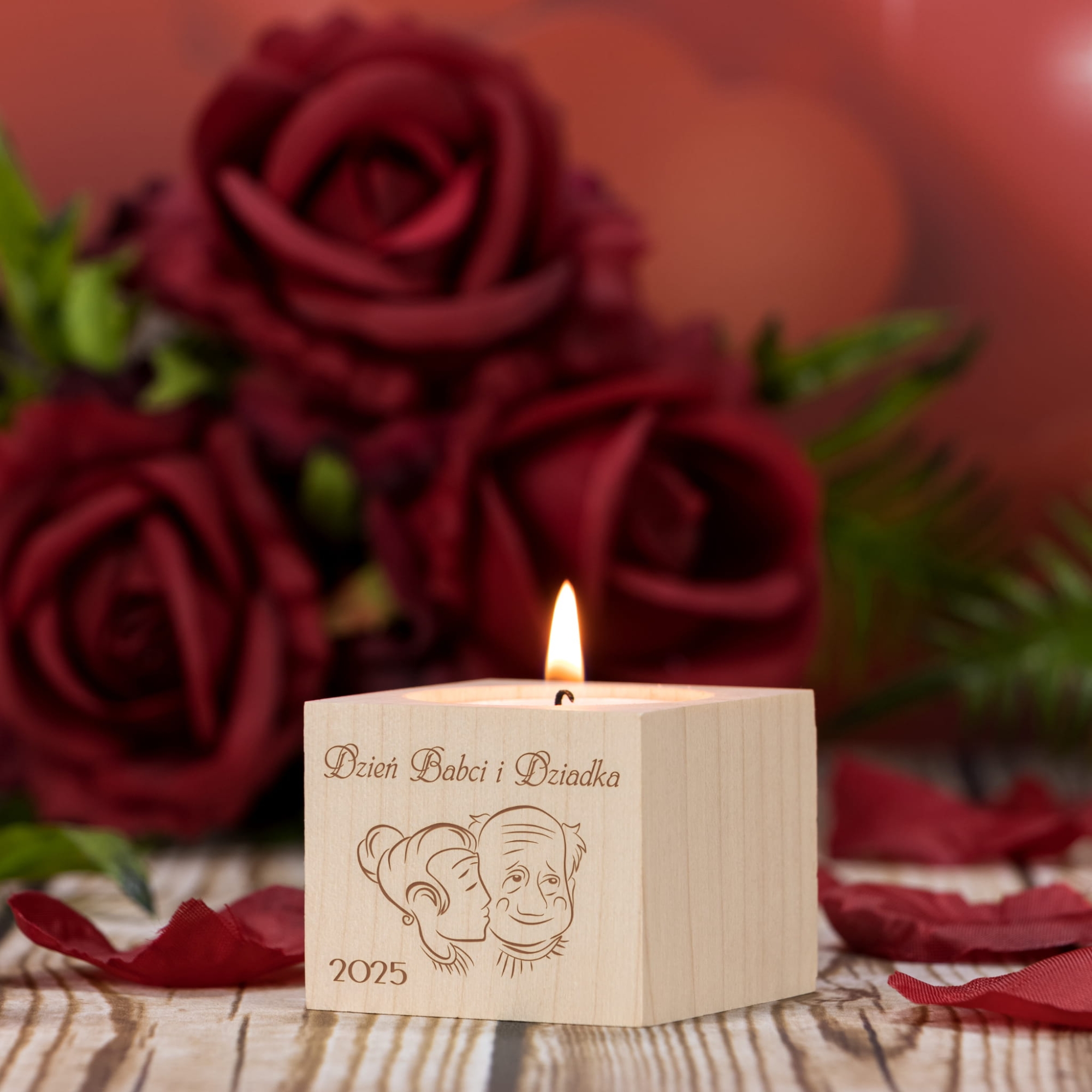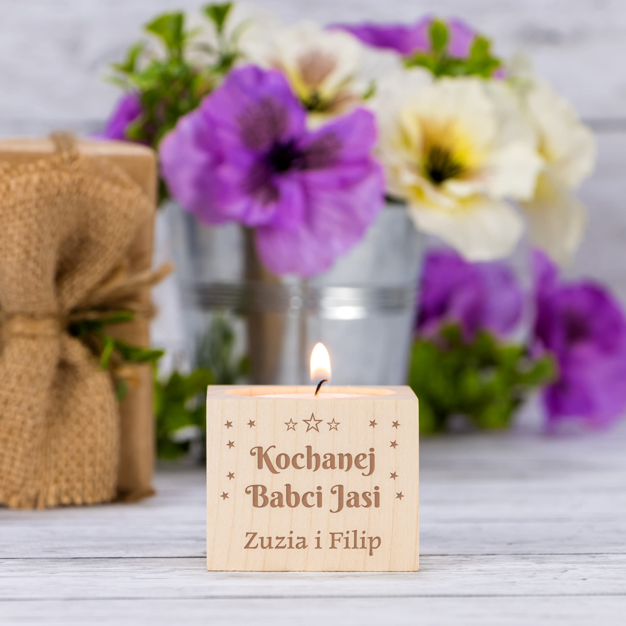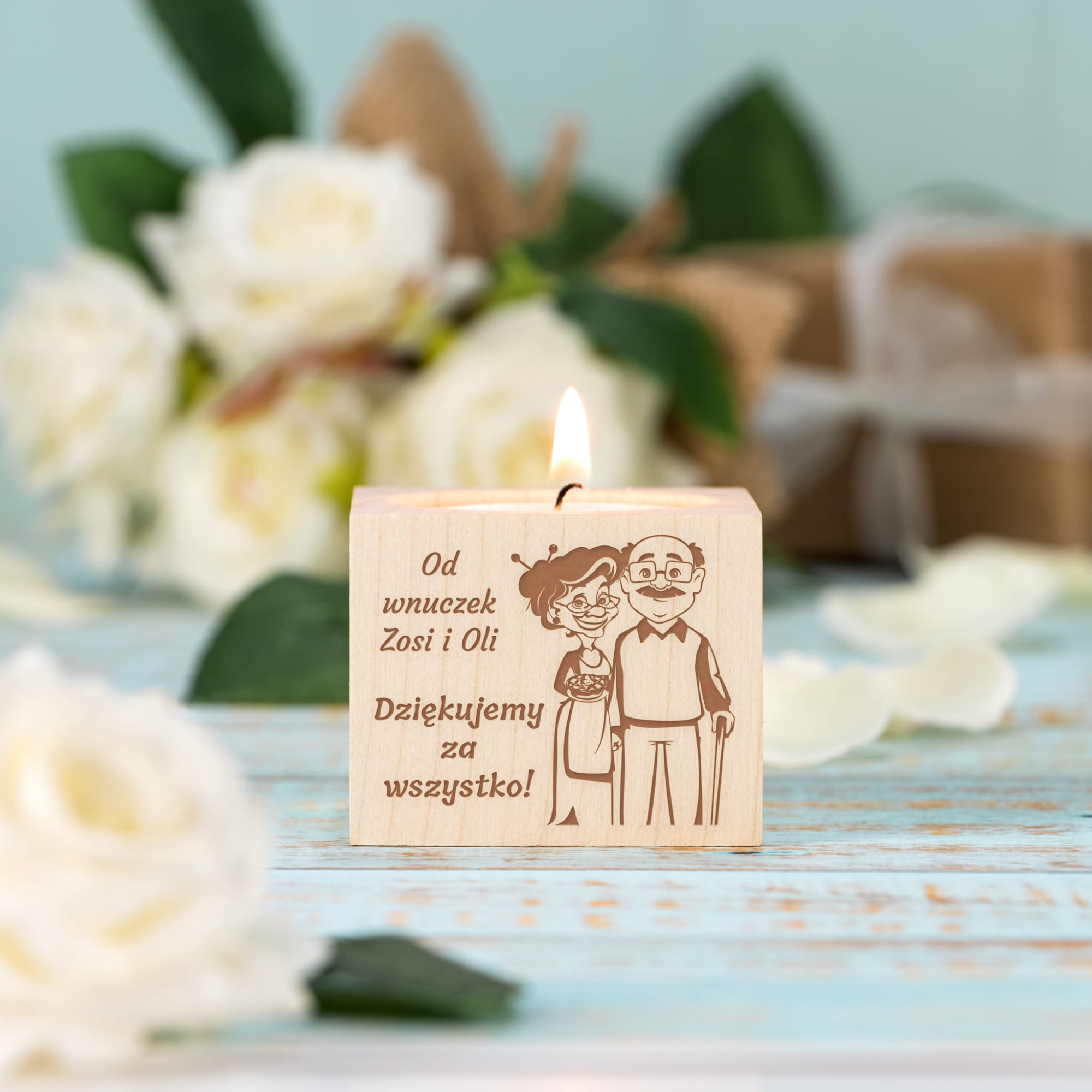Rustykalny drewniany świecznik na tealight z indywidualnym grawerem z okazji Dnia Babci i Dziadka