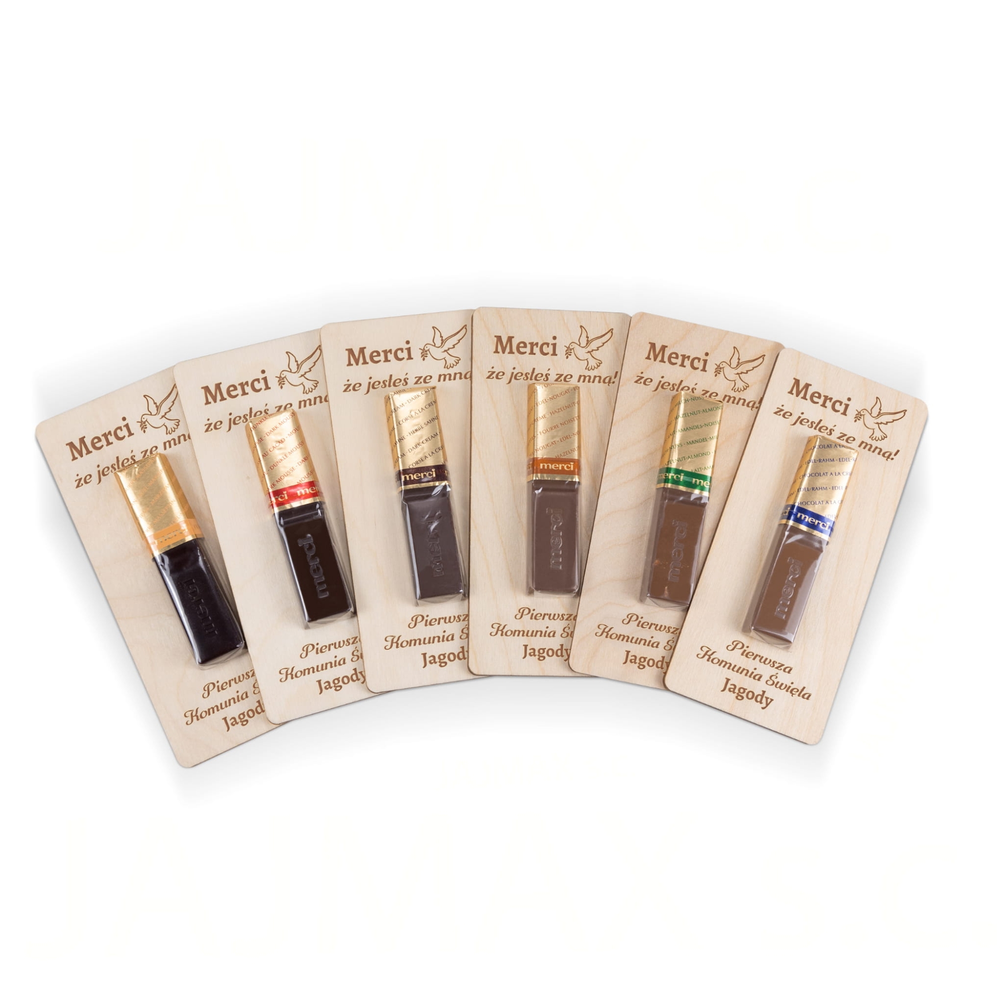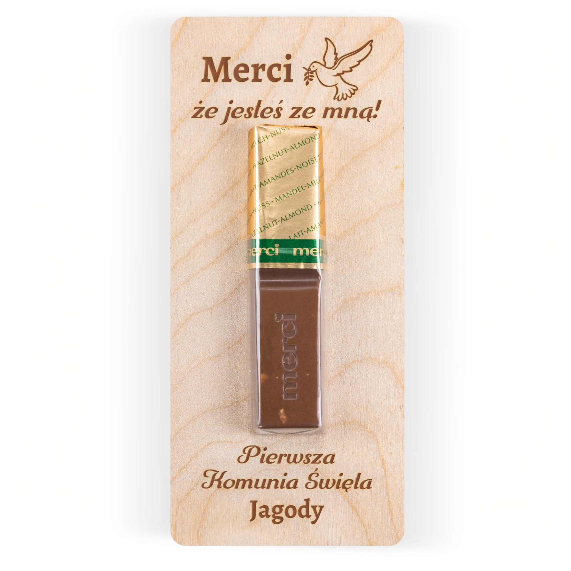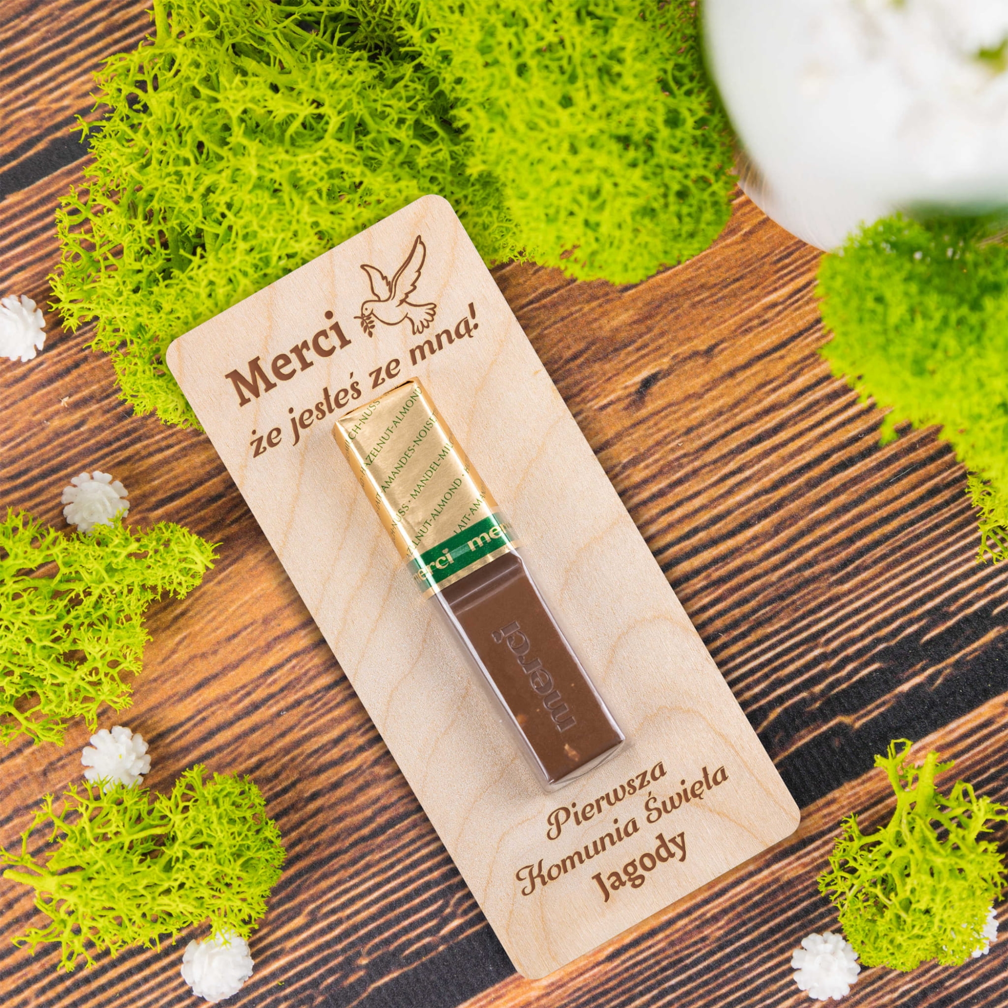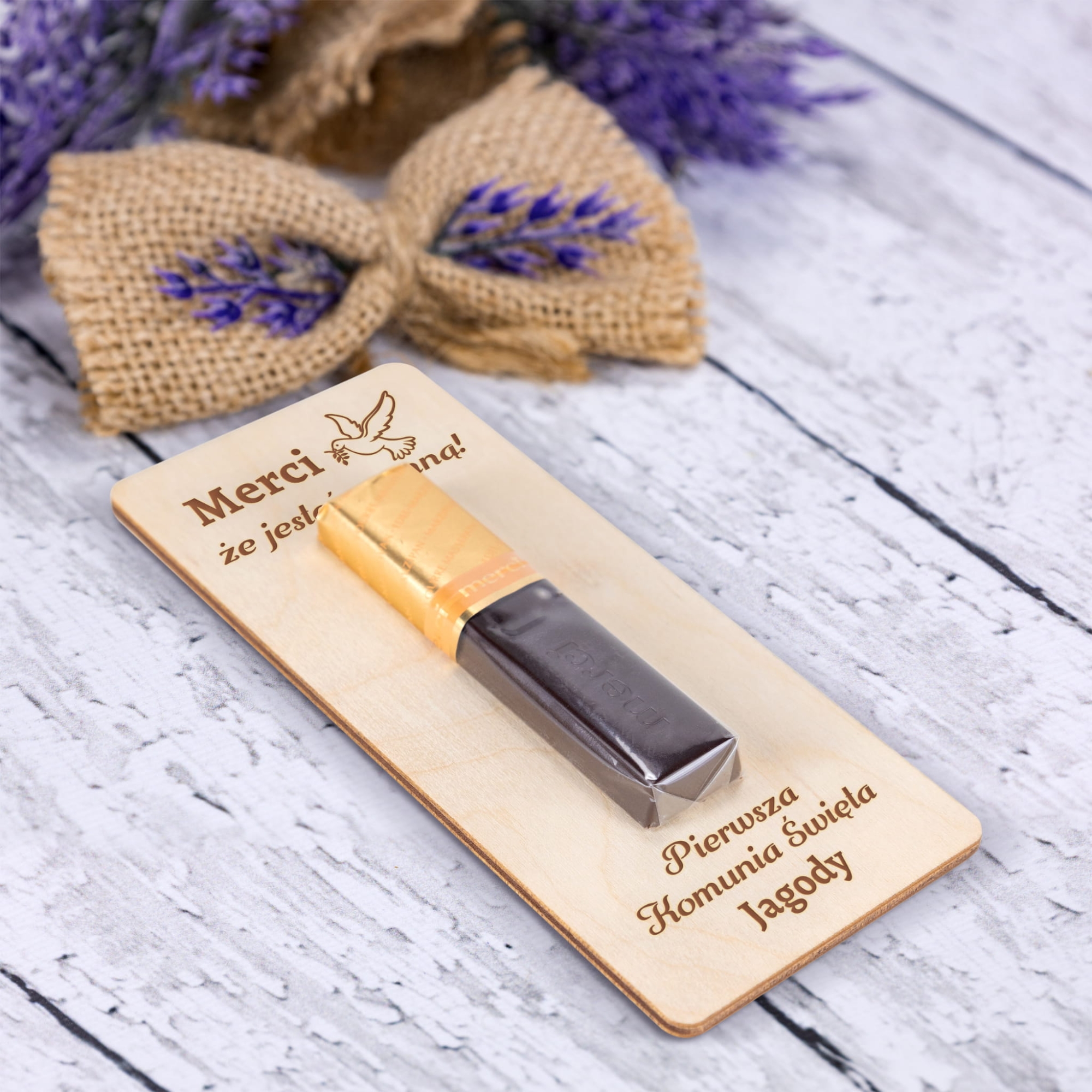 Drewniana deseczka z czekoladką Merci z indywidualnym grawerem