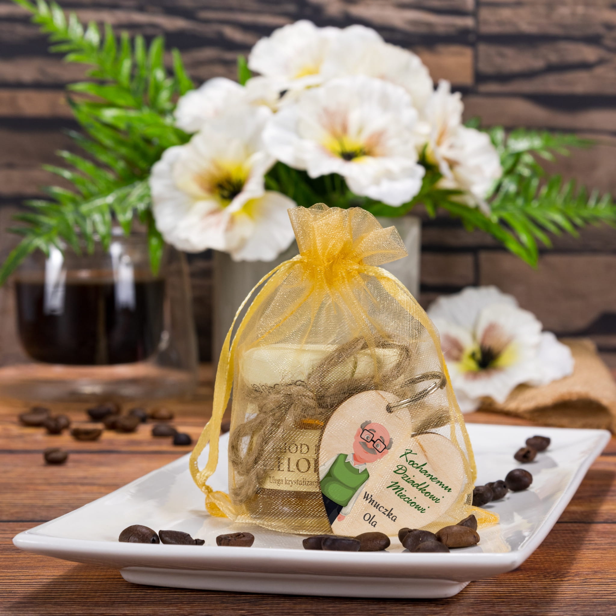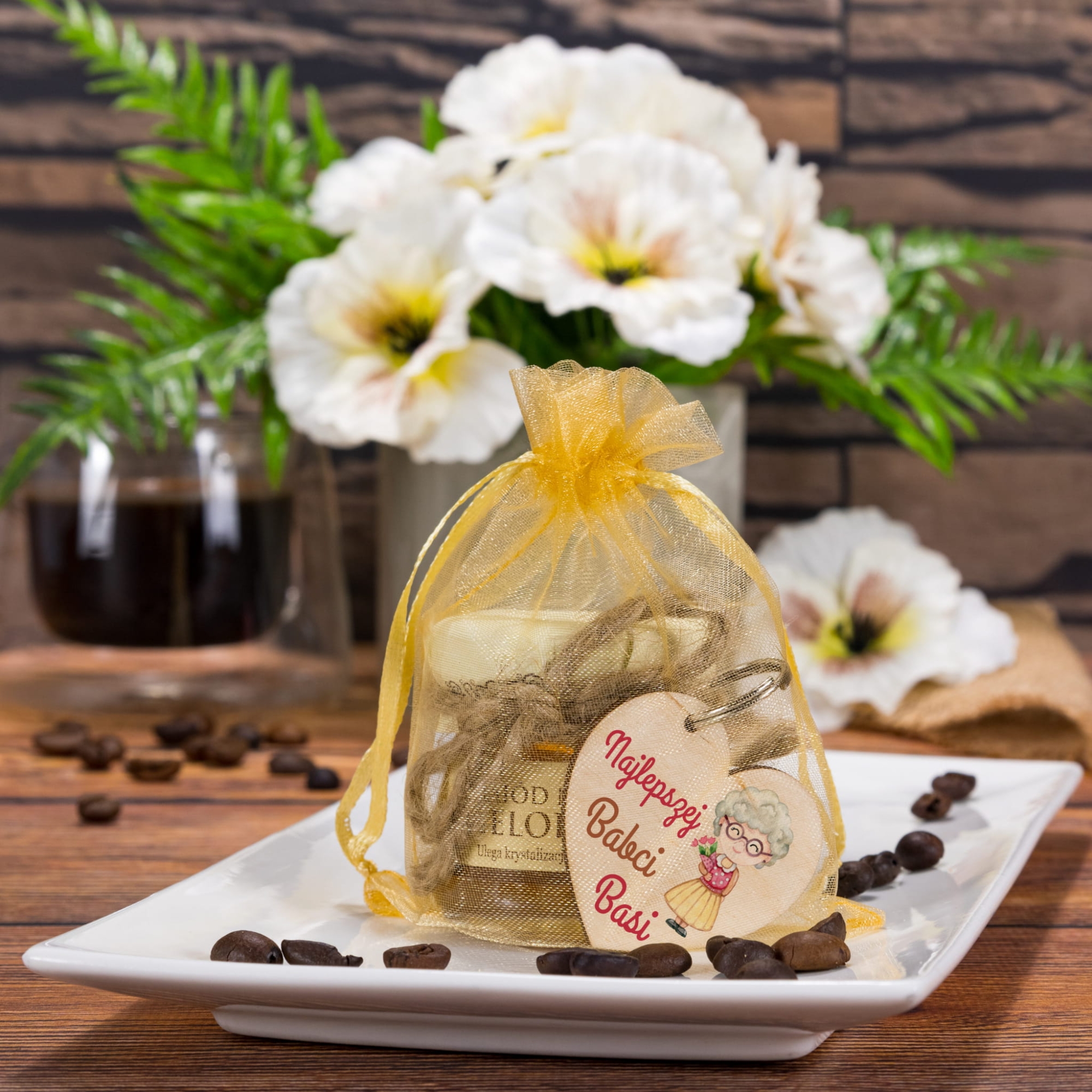 Breloczek i miodzik lub konfitura w ozdobnym woreczku prezent z okazji Dnia Babci i Dziadka