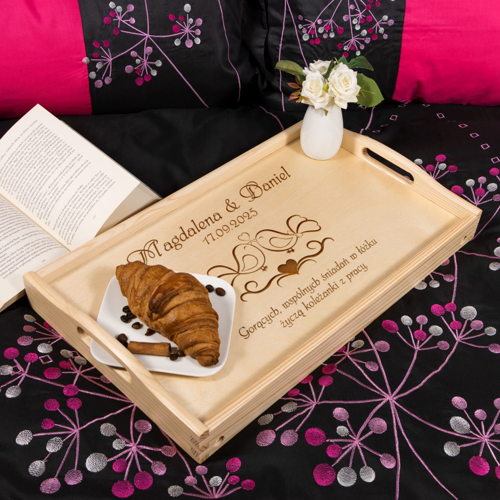 Jeśli szukasz oryginalnego i zarazem praktycznego pomysłu na prezent na ślub, mamy dla Ciebie coś specjalnego. Nasza propozycja to wyjątkowy stolik śniadaniowy z indywidualnym grawerem. Stolik do łóżka jest naturalnego koloru, zabezpieczony został jedynie lakierem bezbarwnym, aby wydobyć z niego piękny odcień drewna. Taki pomysł na prezent dla Pary Młodej z pewnością przypadnie do gustu Nowożeńcom. Stolik śniadaniowy jako prezent na wesele sprawdzi się znakomicie. Będzie umilał zakochanym wspólne posiłki w łóżku.
