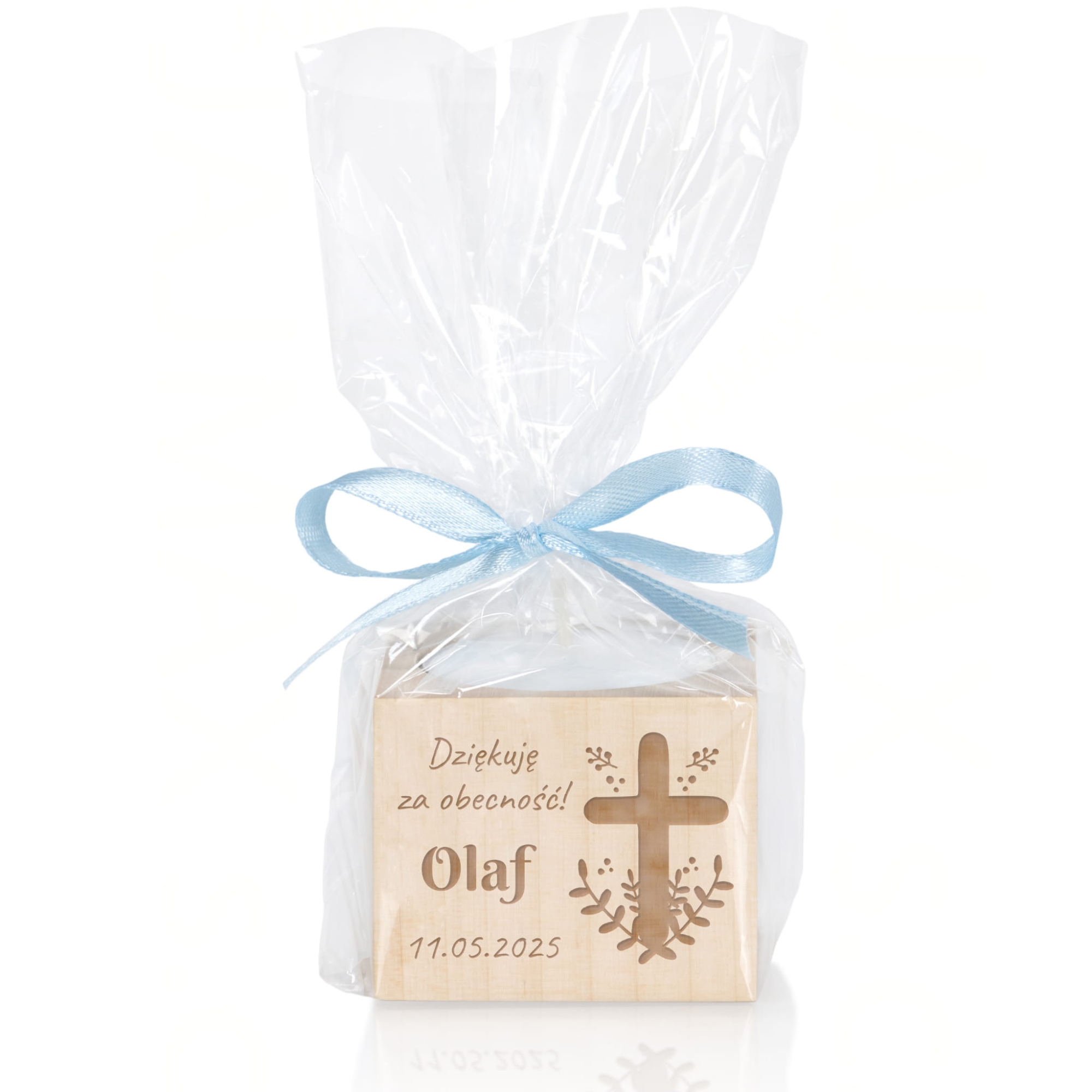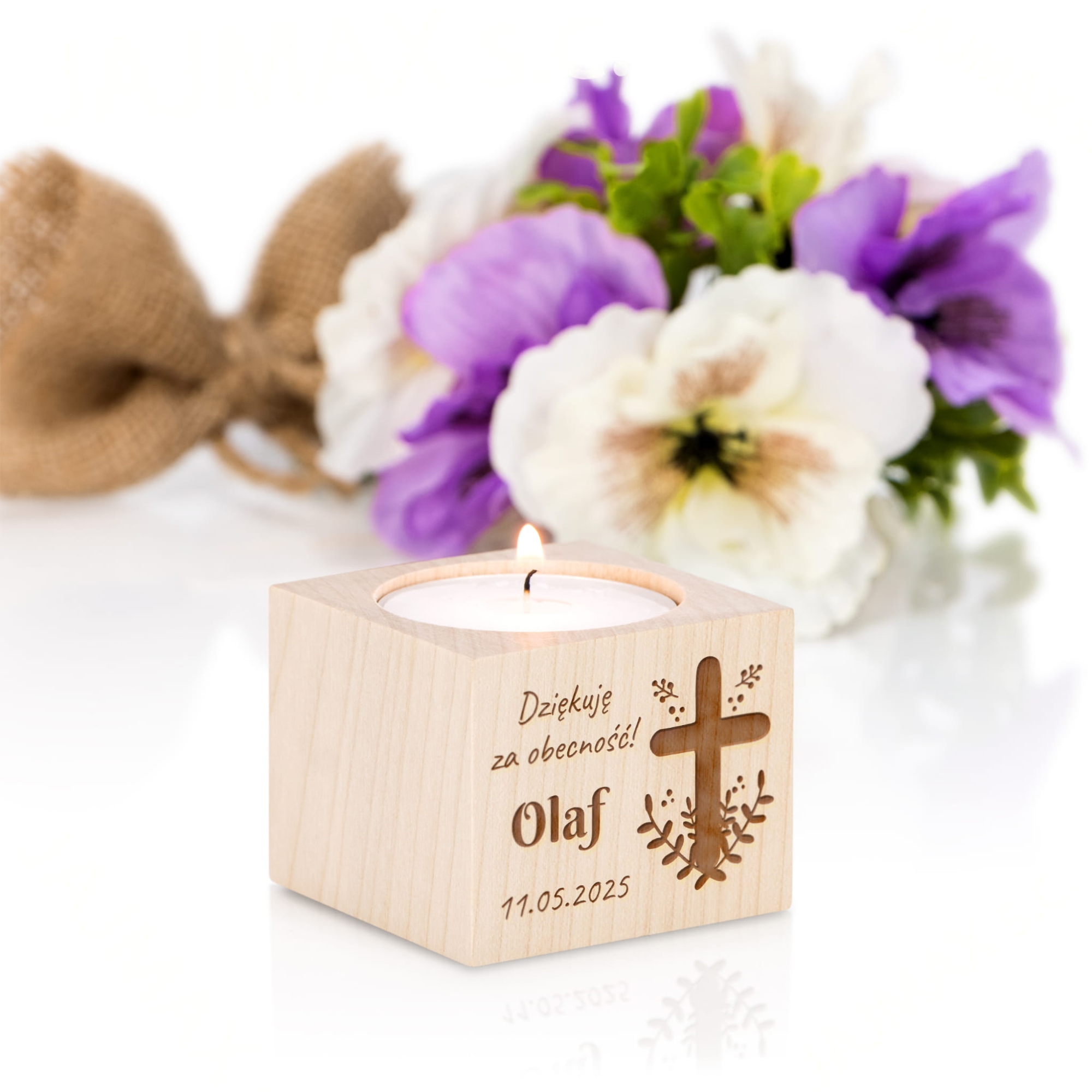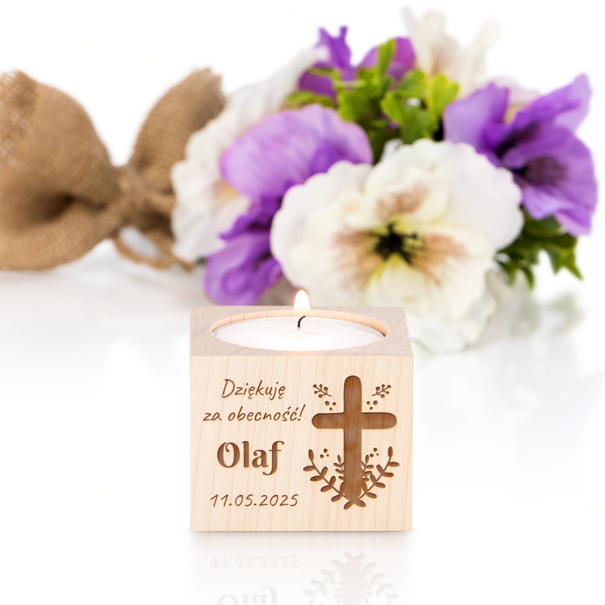 Drewniany świecznik z dedykacją – naturalne podziękowanie dla gości komunijnych