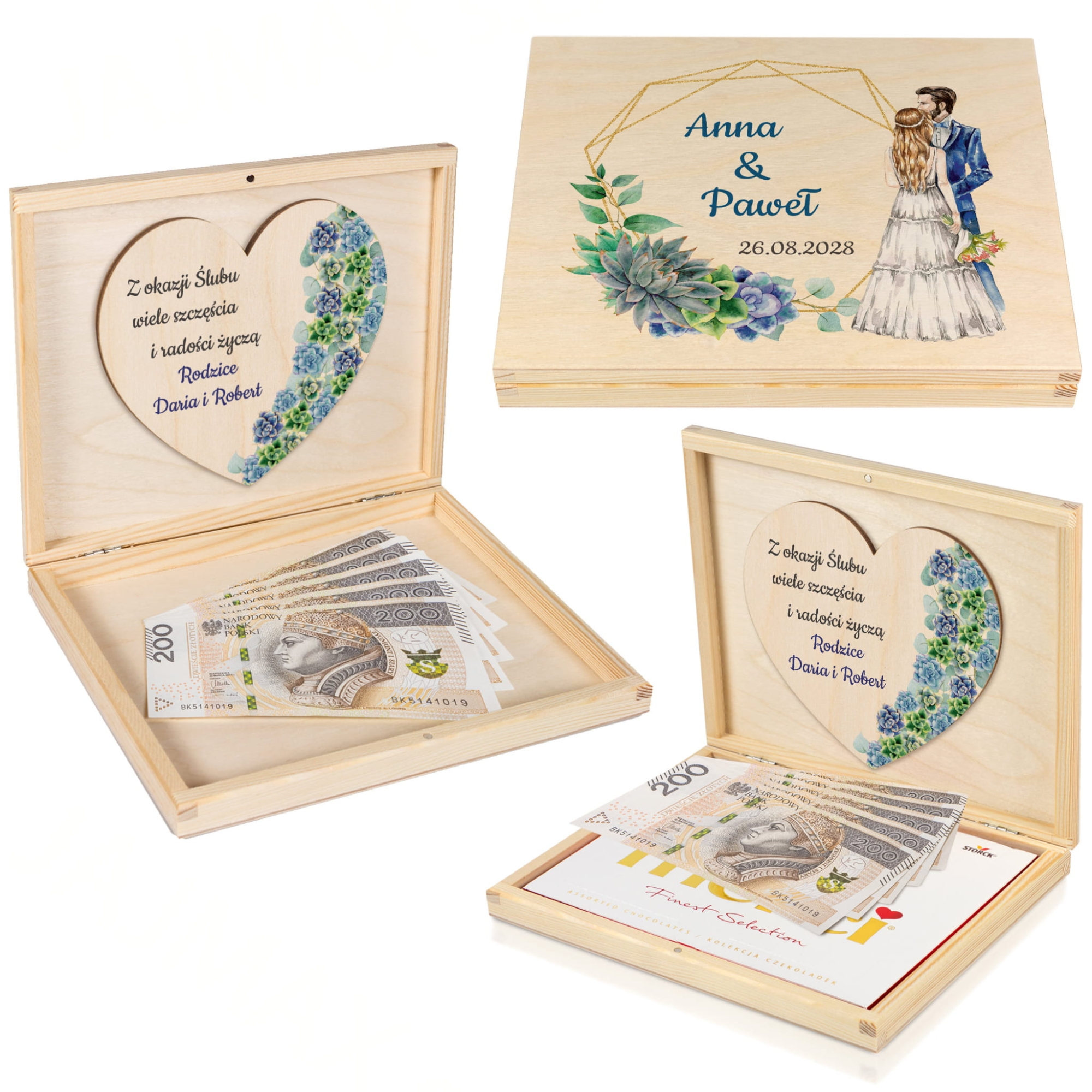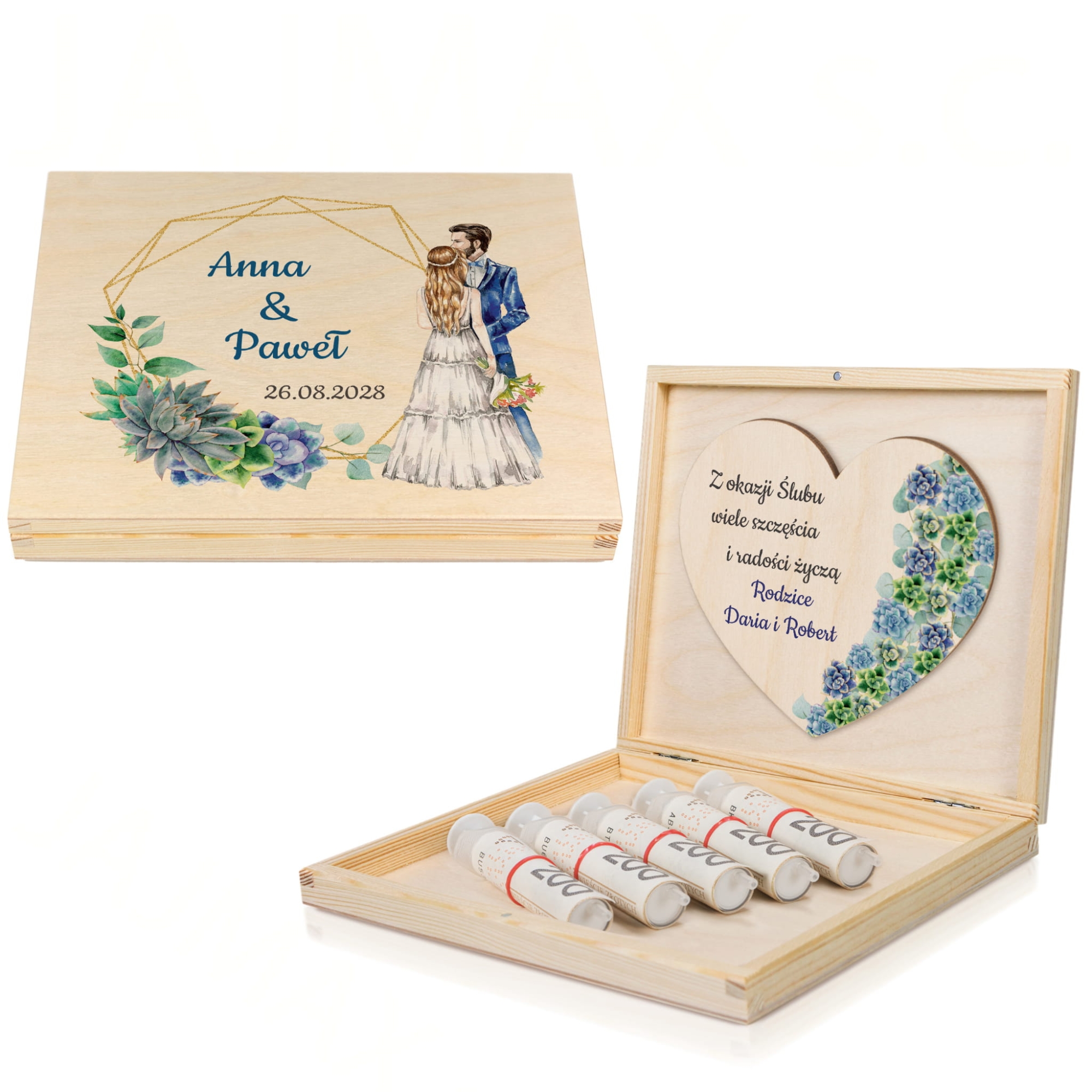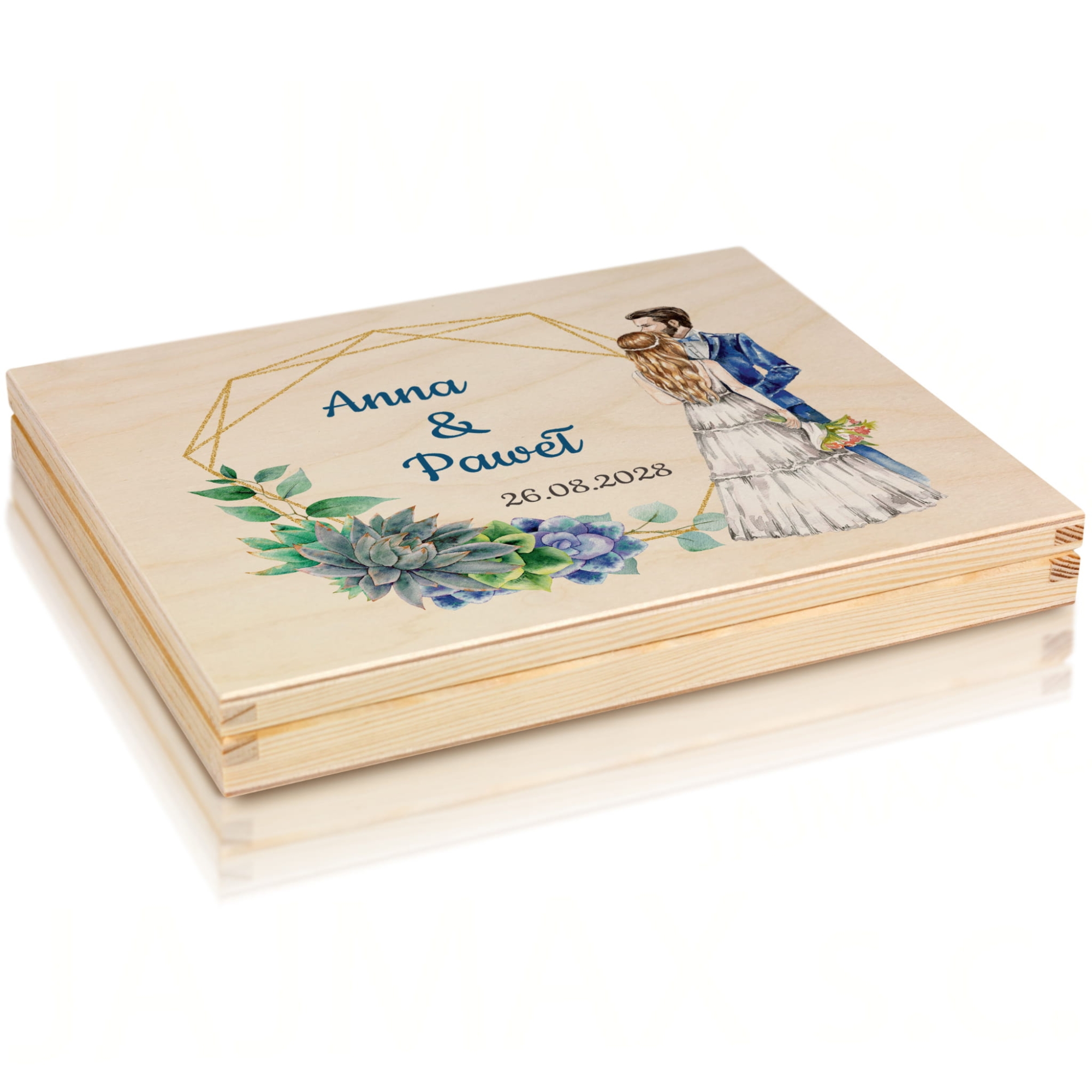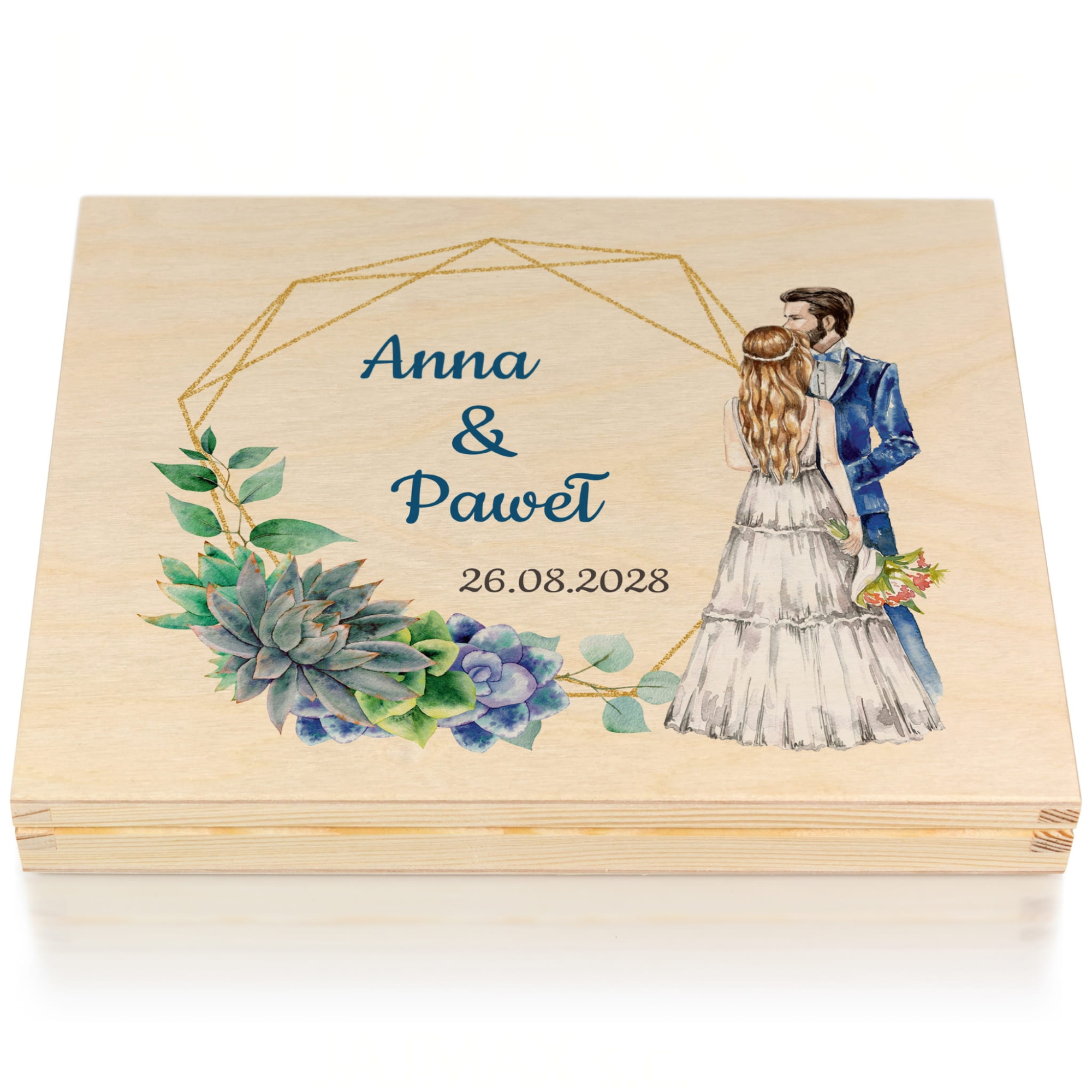 Na wieczku i wewnątrz skrzynek znajdują się kolorowe nadruki – imiona Pary Młodej, data ślubu oraz podpis od darczyńców. Motywy graficzne przedstawiają akwarelową parę zakochanych oraz eleganckie sukulenty w pastelowych barwach. Teksty można dowolnie edytować, co czyni ten prezent jeszcze bardziej osobistym.