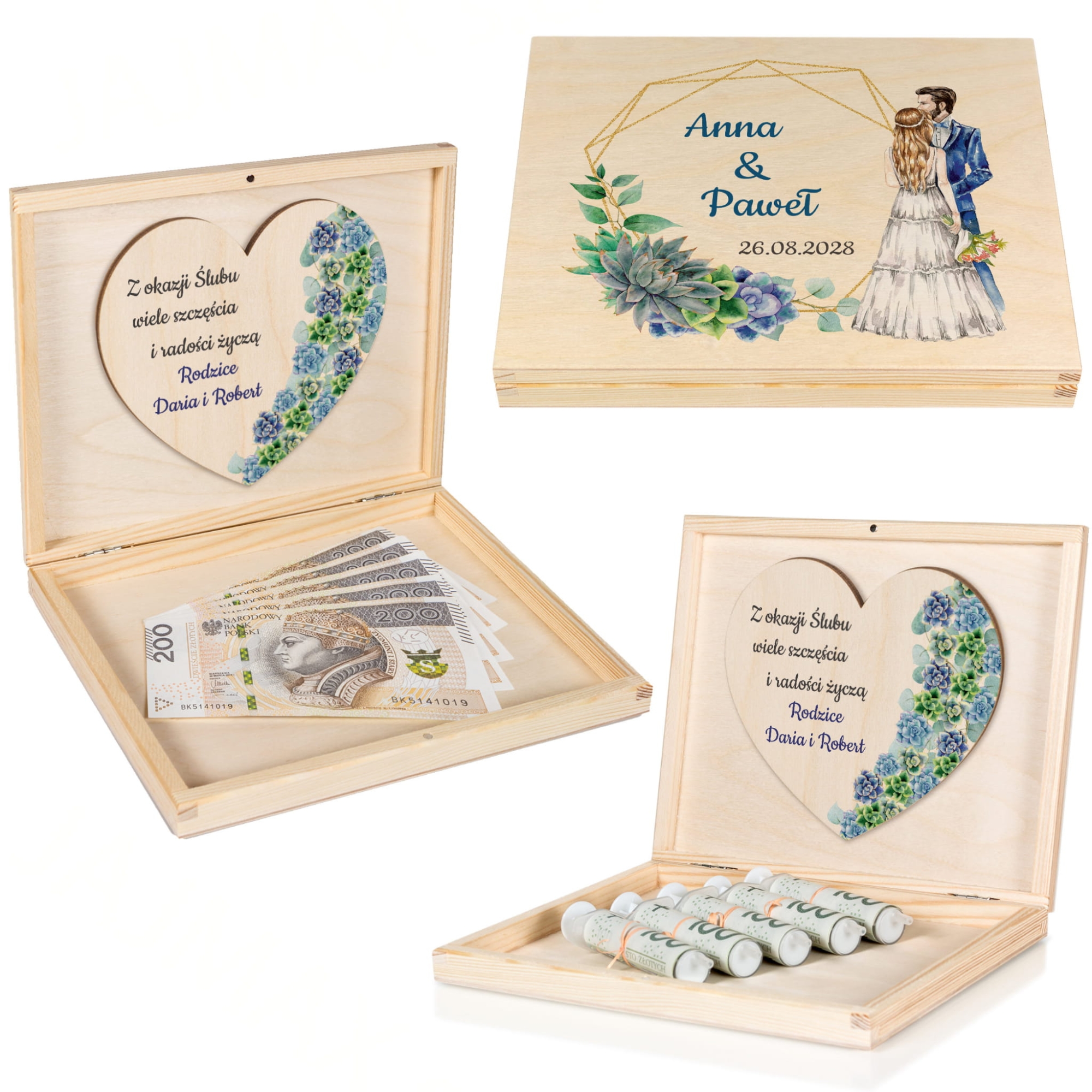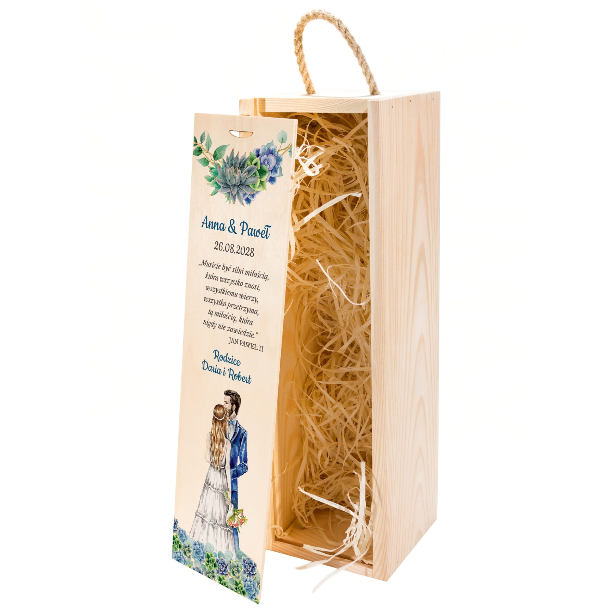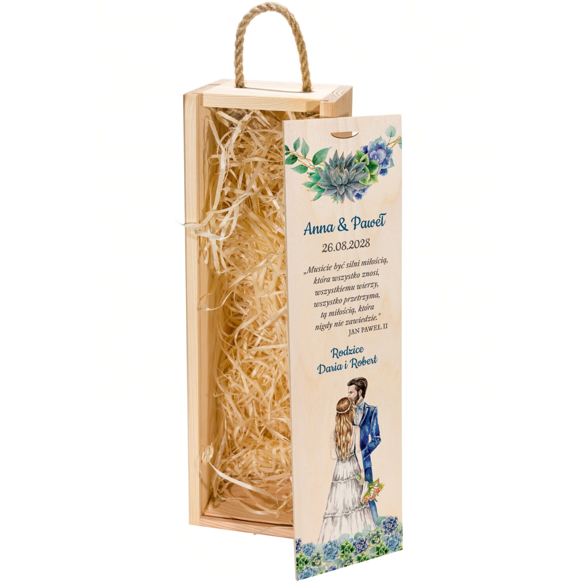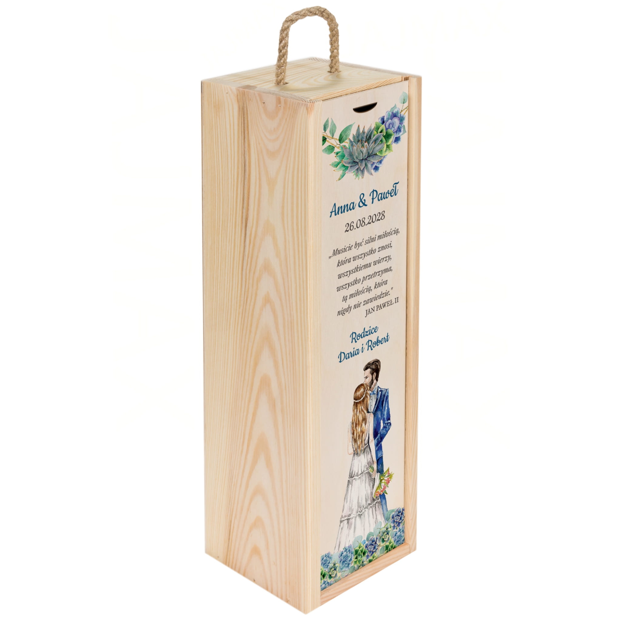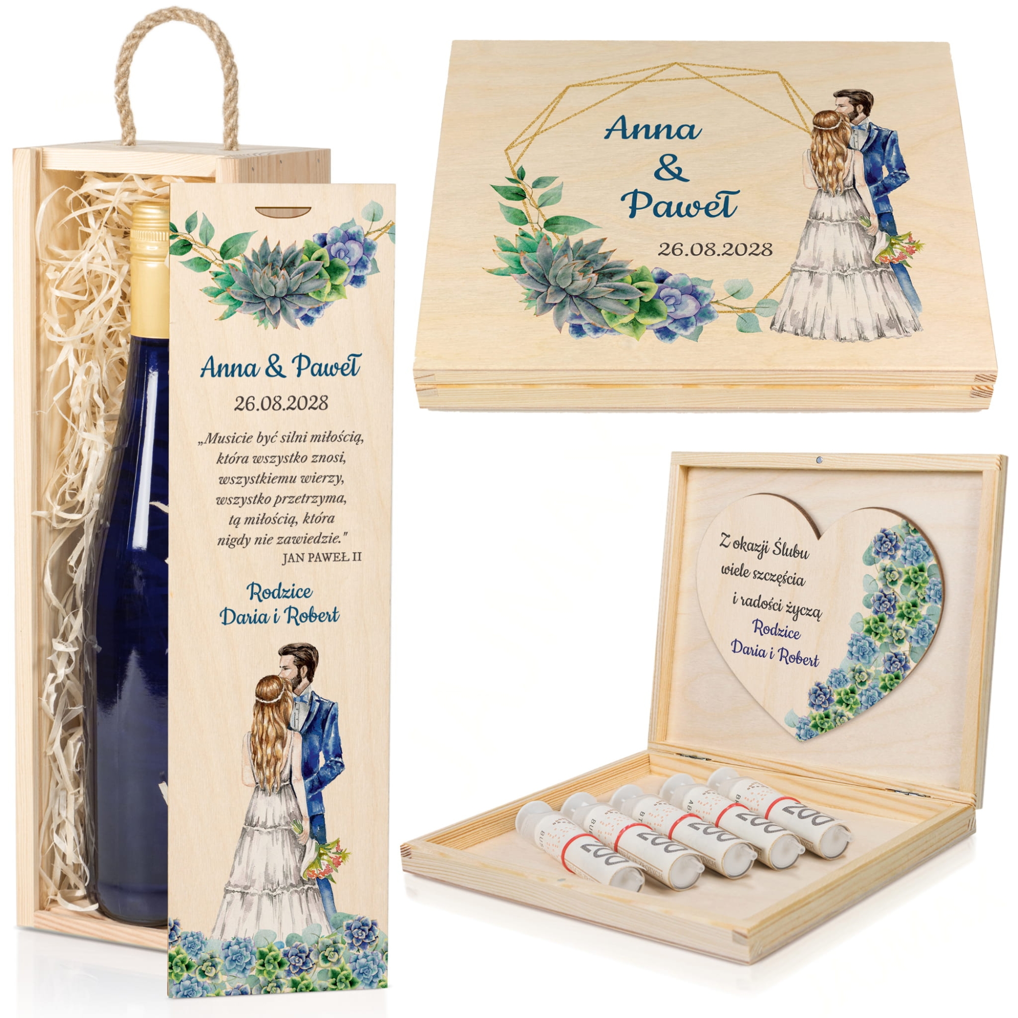 Na wieczku i wewnątrz skrzynek znajdują się kolorowe nadruki – imiona Pary Młodej, data ślubu oraz podpis od darczyńców. Motywy graficzne przedstawiają akwarelową parę zakochanych oraz eleganckie sukulenty w pastelowych barwach. Teksty można dowolnie edytować, co czyni ten prezent jeszcze bardziej osobistym.
