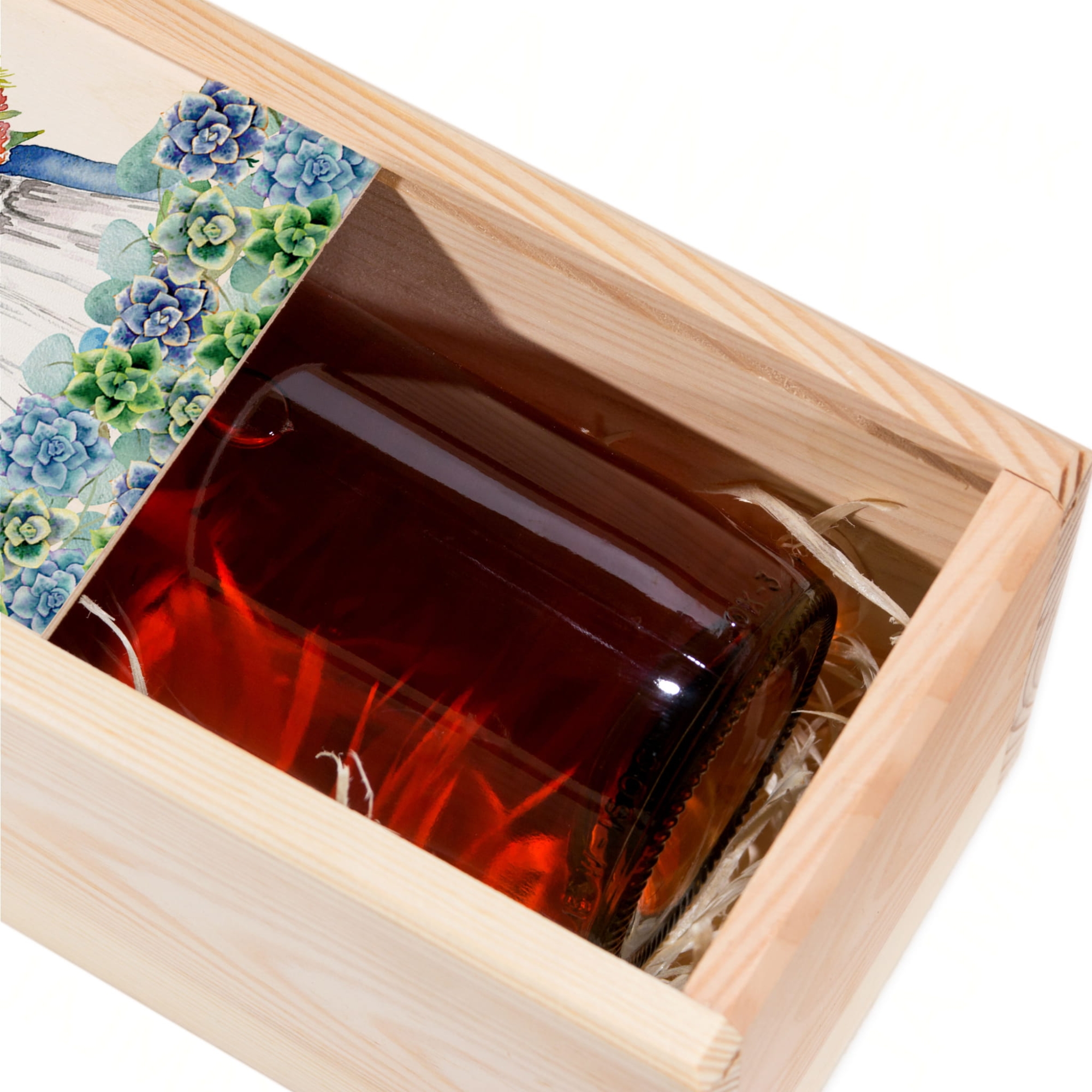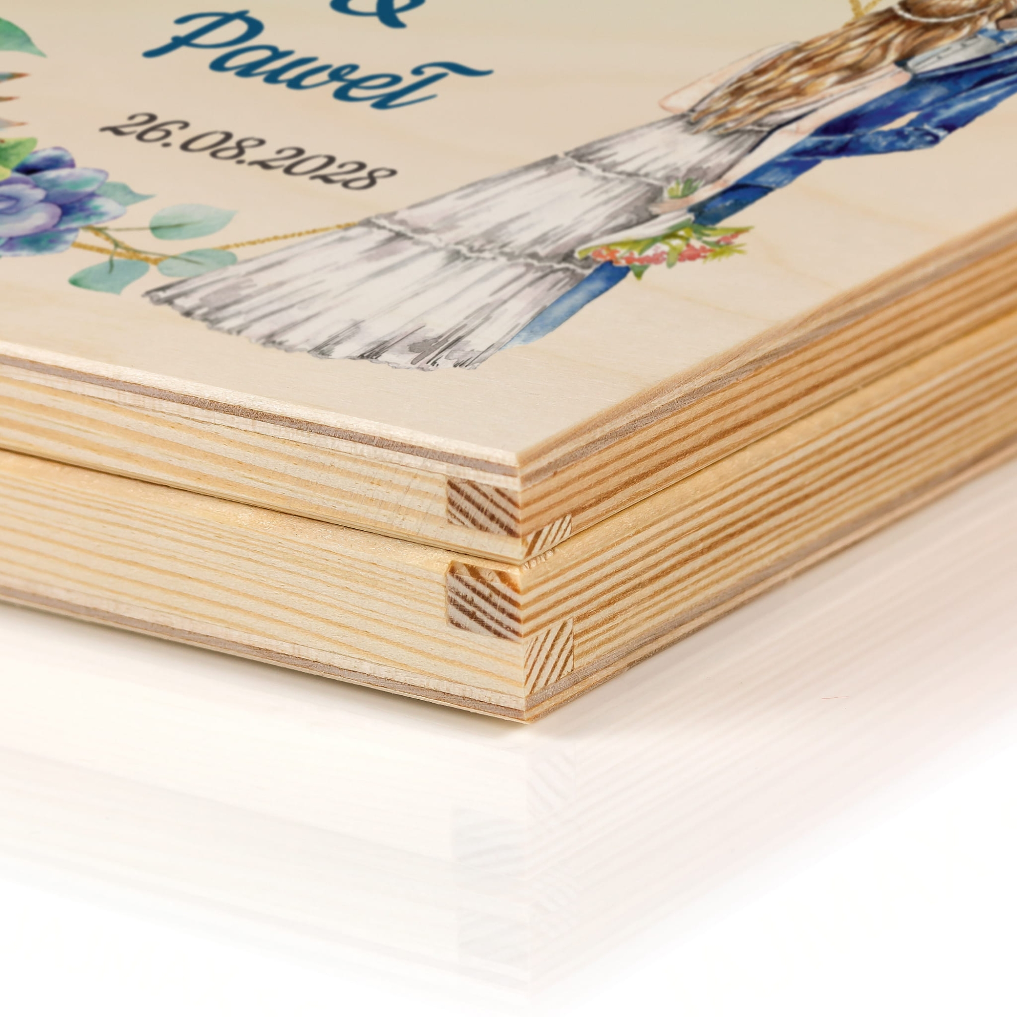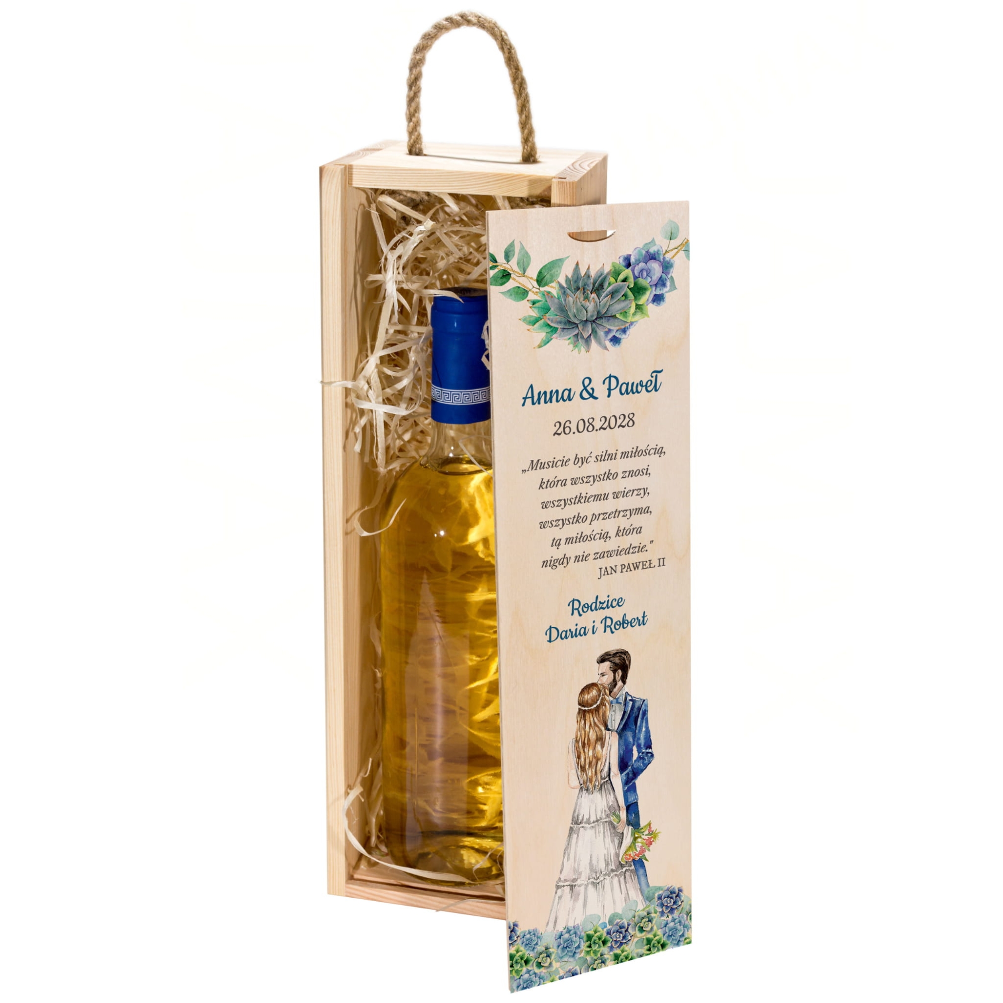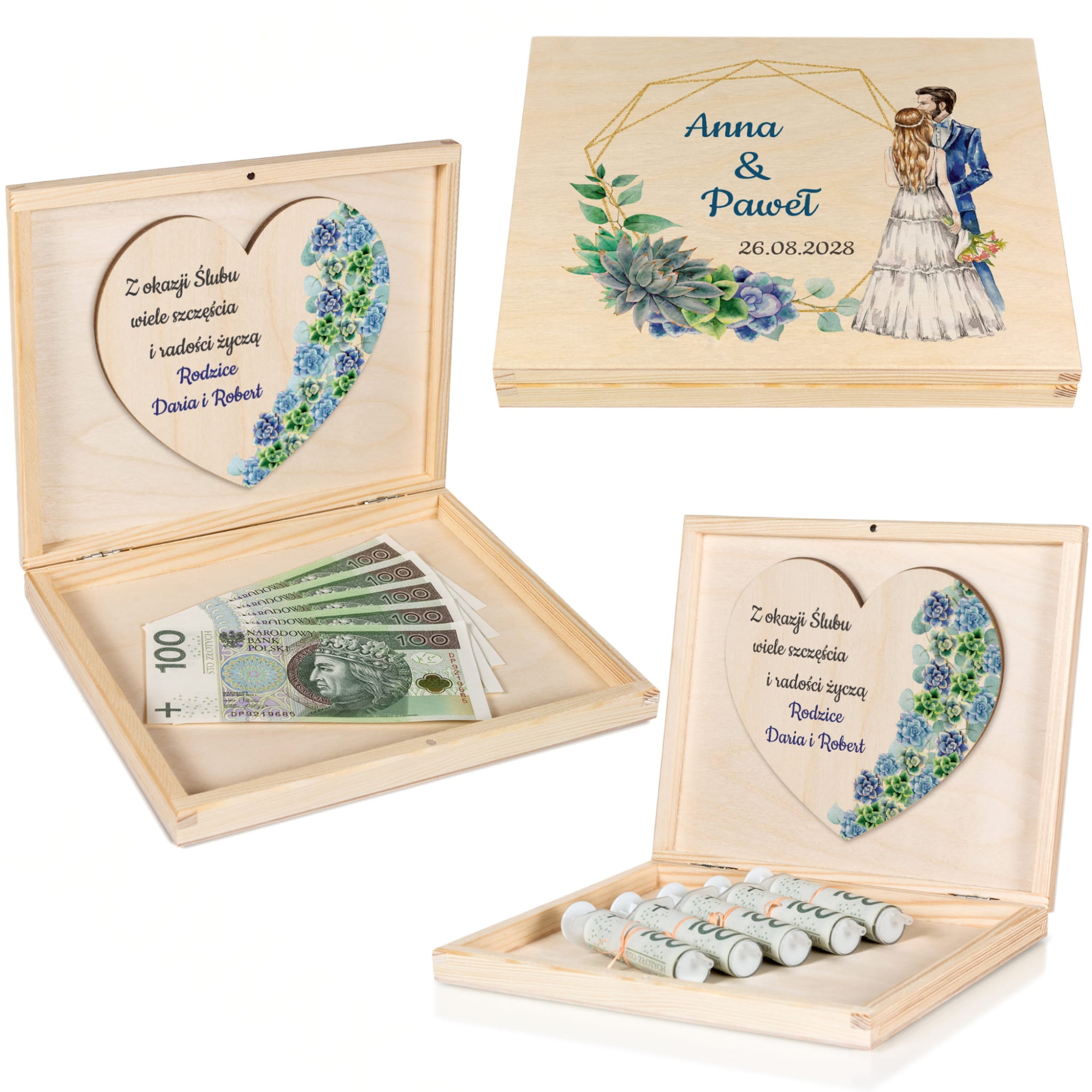 Na wieczku i wewnątrz skrzynek znajdują się kolorowe nadruki – imiona Pary Młodej, data ślubu oraz podpis od darczyńców. Motywy graficzne przedstawiają akwarelową parę zakochanych oraz eleganckie sukulenty w pastelowych barwach. Teksty można dowolnie edytować, co czyni ten prezent jeszcze bardziej osobistym.