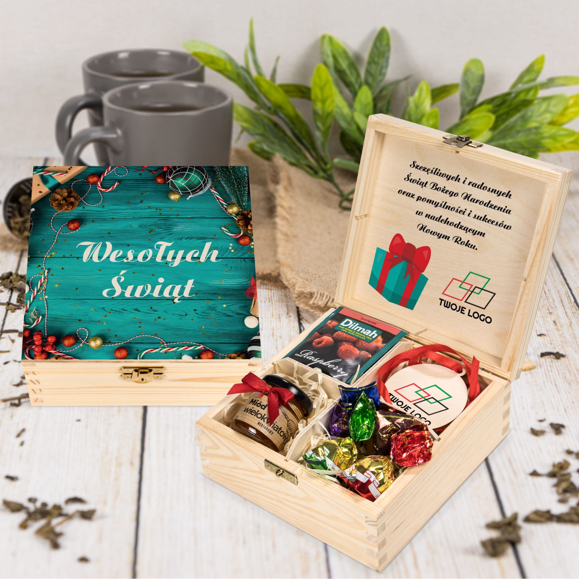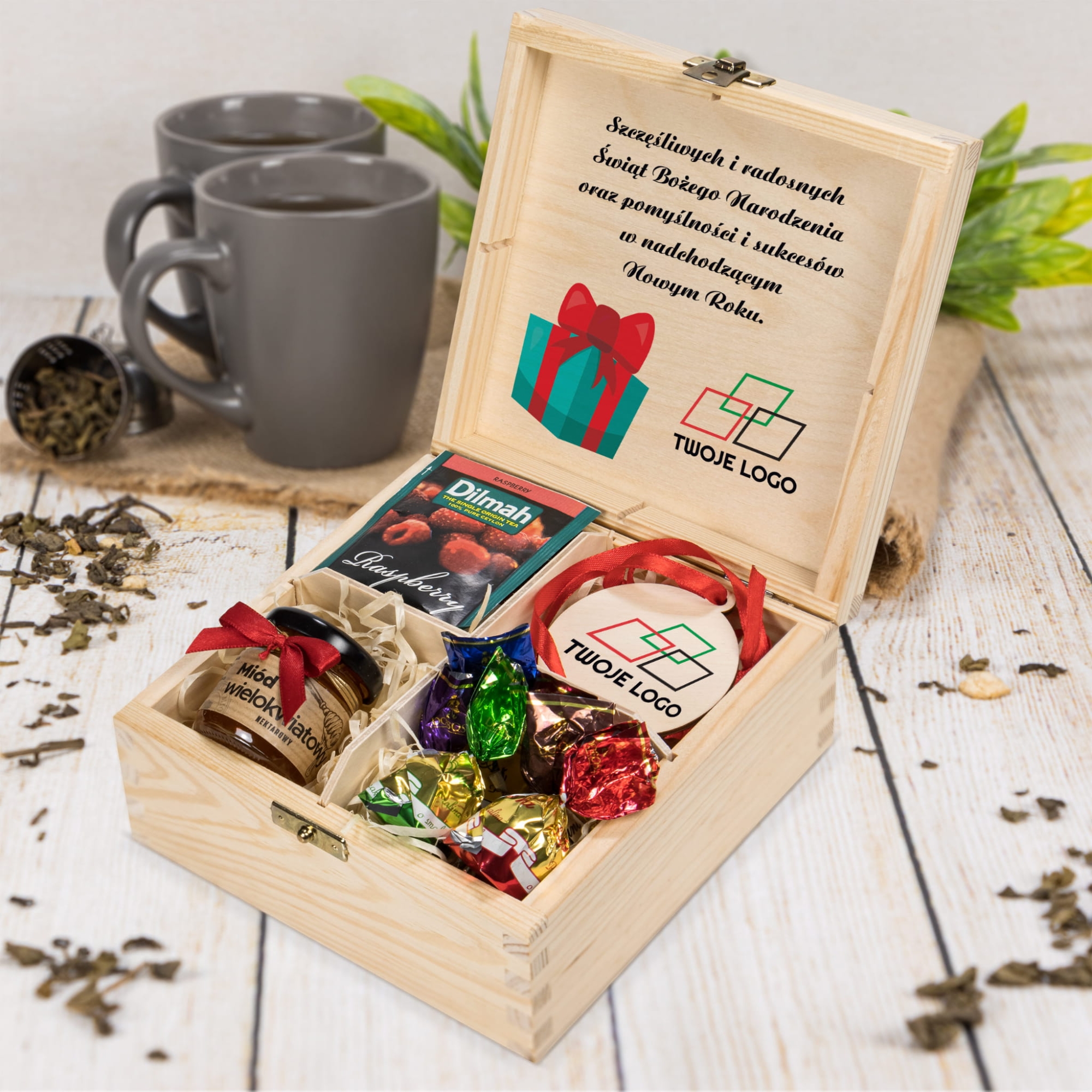 ZESTAW ŚWIĄTECZNY prezent firmowy z logo PREZENT DLA KLIENTÓW BOX PREZENTOWY FIRMOWY zestaw herbat drewniane pudełko z Twoim LOGO Box prezentowy firmowy dla klientów LOGO FIRMY zestaw pyszności PREZENTY FIRMOWE Z LOGO pudełko z herbatami premium Dilmah Święta DREWNIANA HERBACIARKA z herbatami Dilmah prezent firmowy na święta