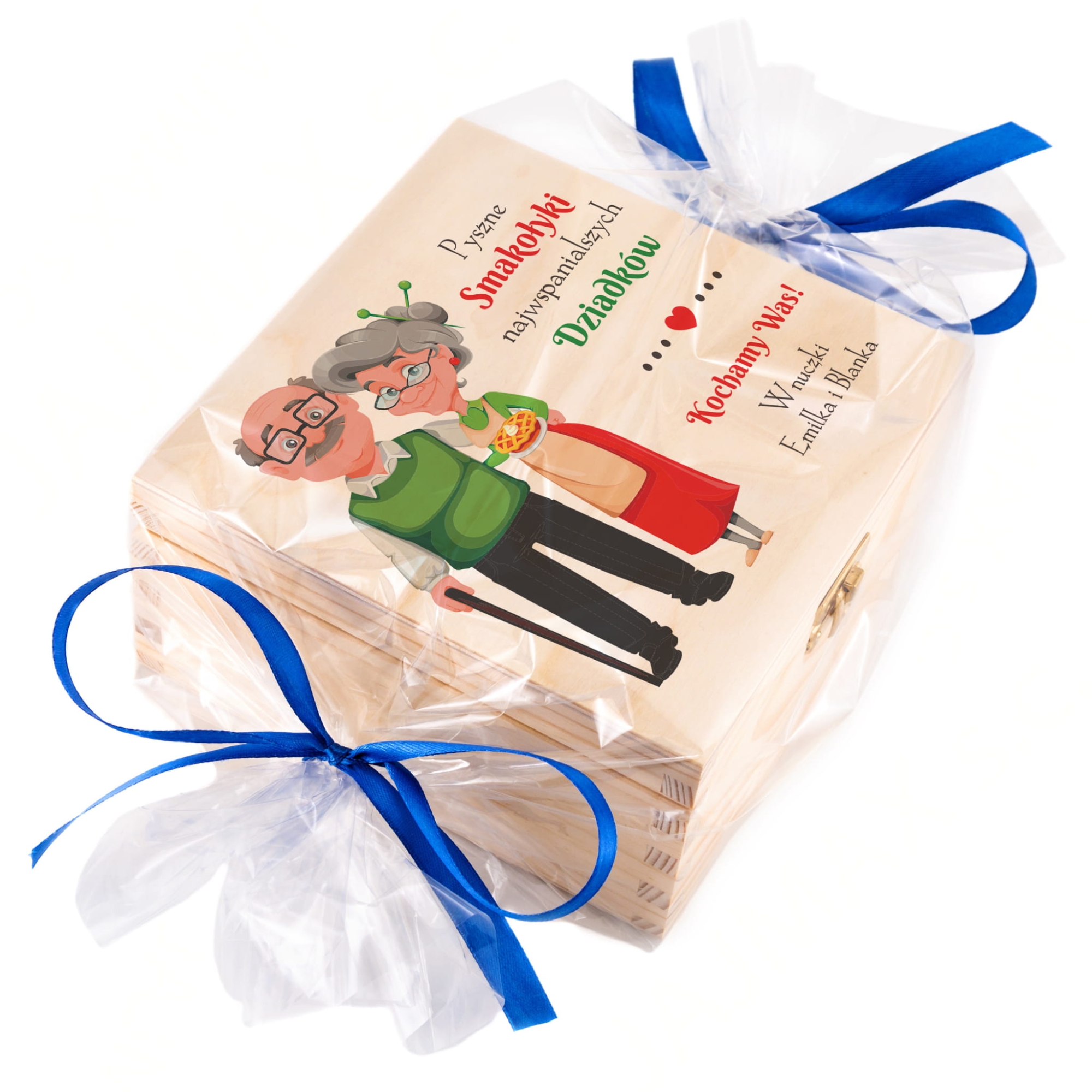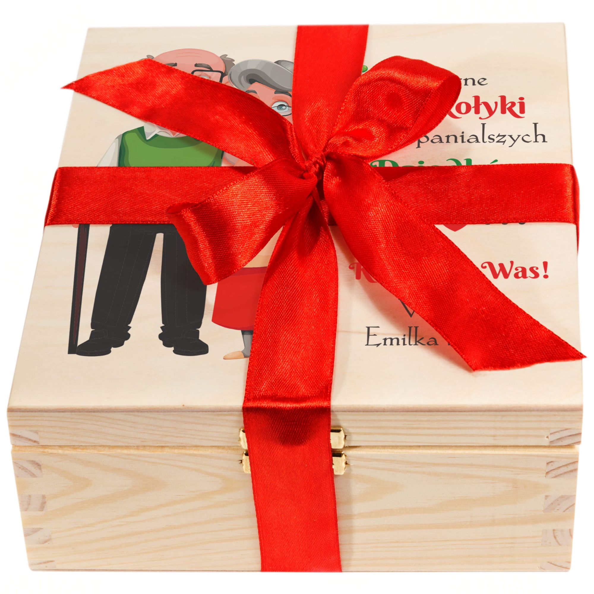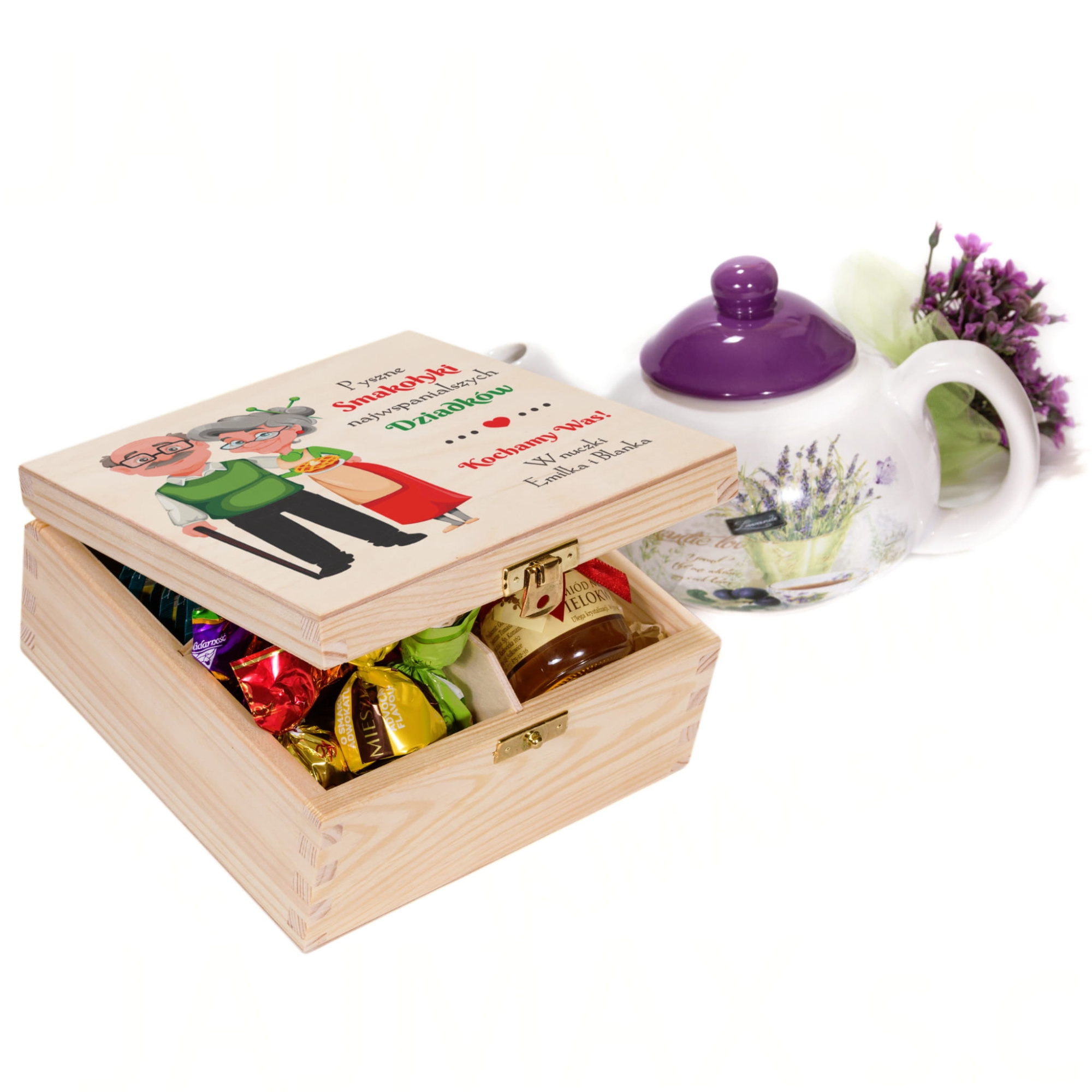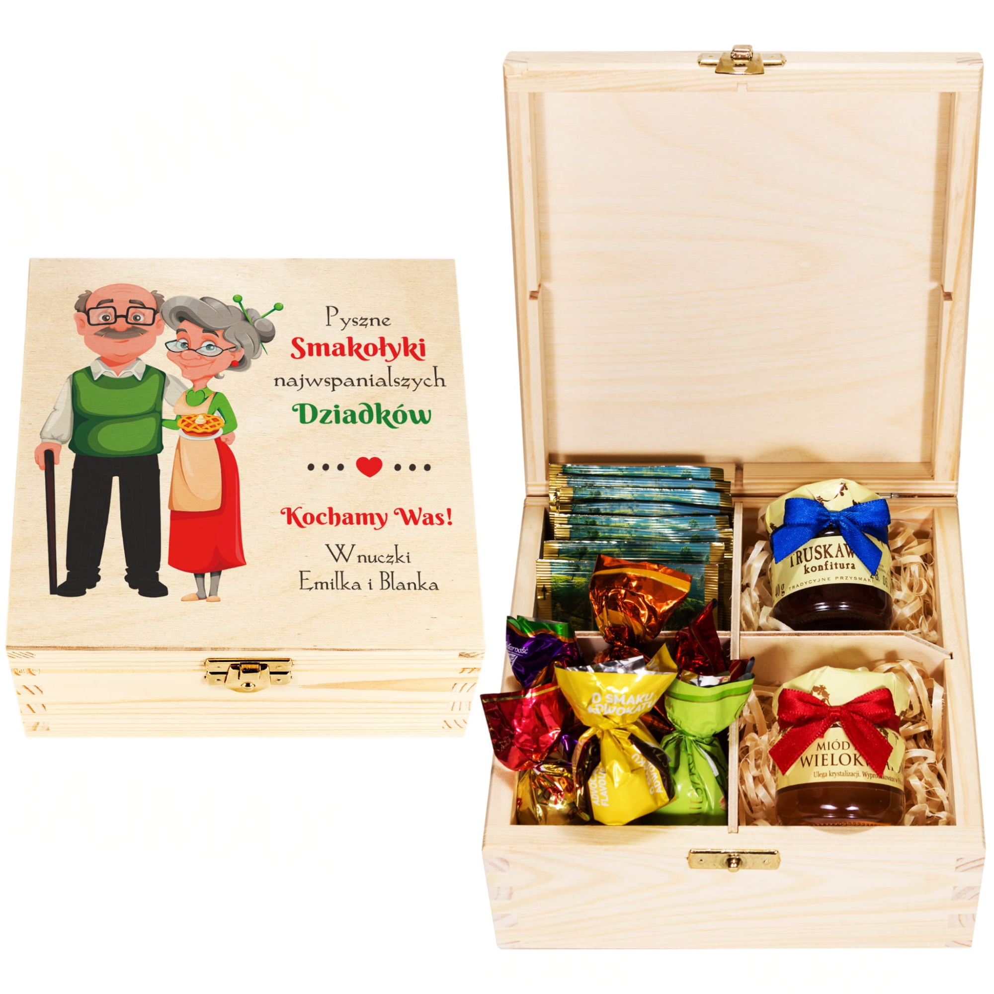 Niebawem Dzień Babci i Dziadka jeśli chcesz sprawić wyjątkowy prezent dla babci i wyjątkowy prezent dla dziadka mamy dla Ciebie doskonały pomysł na upominek z tej okazji, Zestaw podarunkowy dla dziadków z indywidualnym kolorowym nadrukiem to oryginalny prezent dla babci i dziadka. W zestawie znajduje się miodzik, konfitura, herbaty Dilmah oraz pralinki czekoladowe. Herbaciarka wypełniona jest wełna drzewną, która stanowi element dekoracyjny. Na wieczku pudełka wykonamy indywidualny kolorowy nadruk najwyżej jakości zgodnie z Twoim zamówieniem. Taki prezent na Dzień Babci i Dzień Dziadka to szczególny prezent od serca.