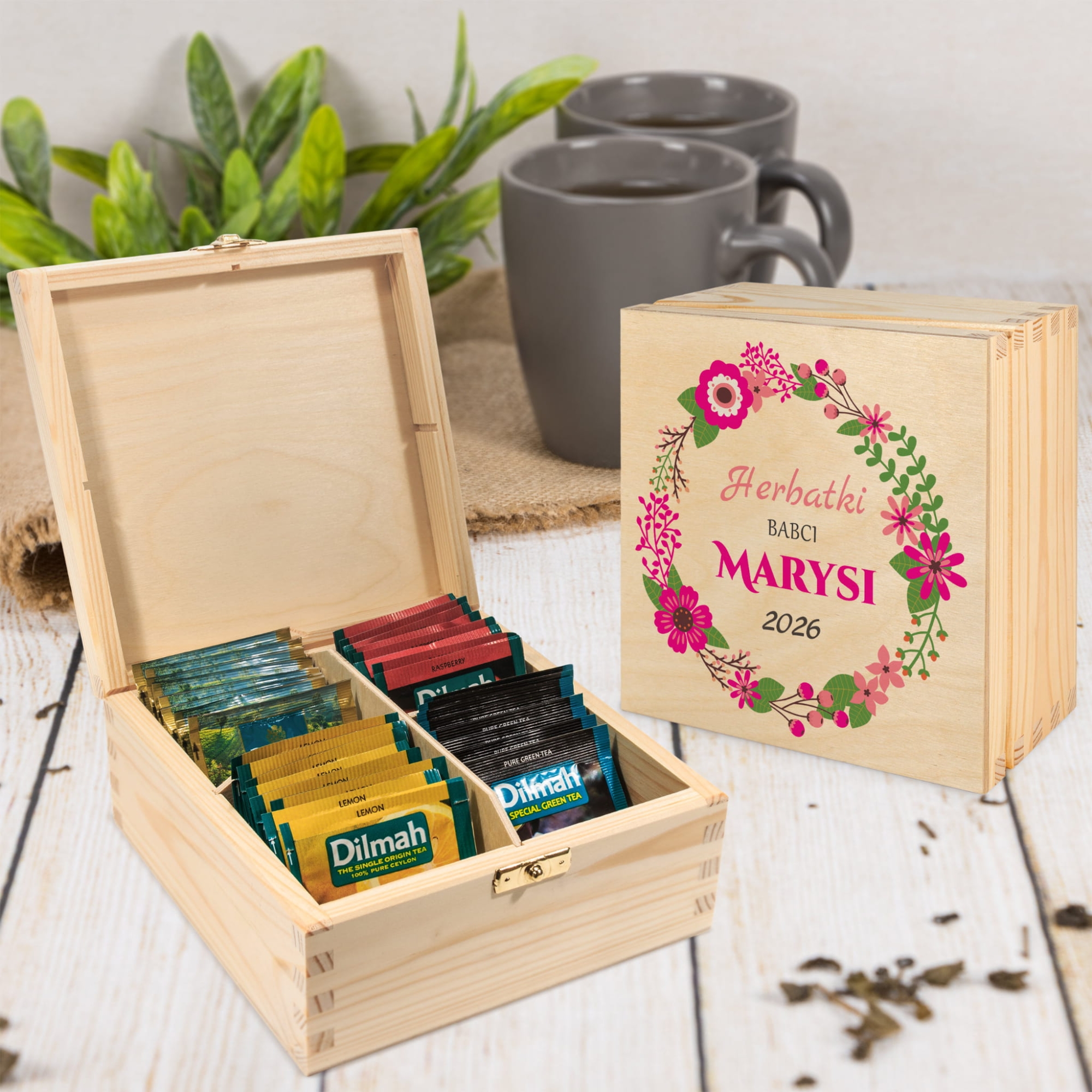 Drewniana herbaciarka w zestawie z herbatami Dilmah upominek na Dzień Babci i Dziadka