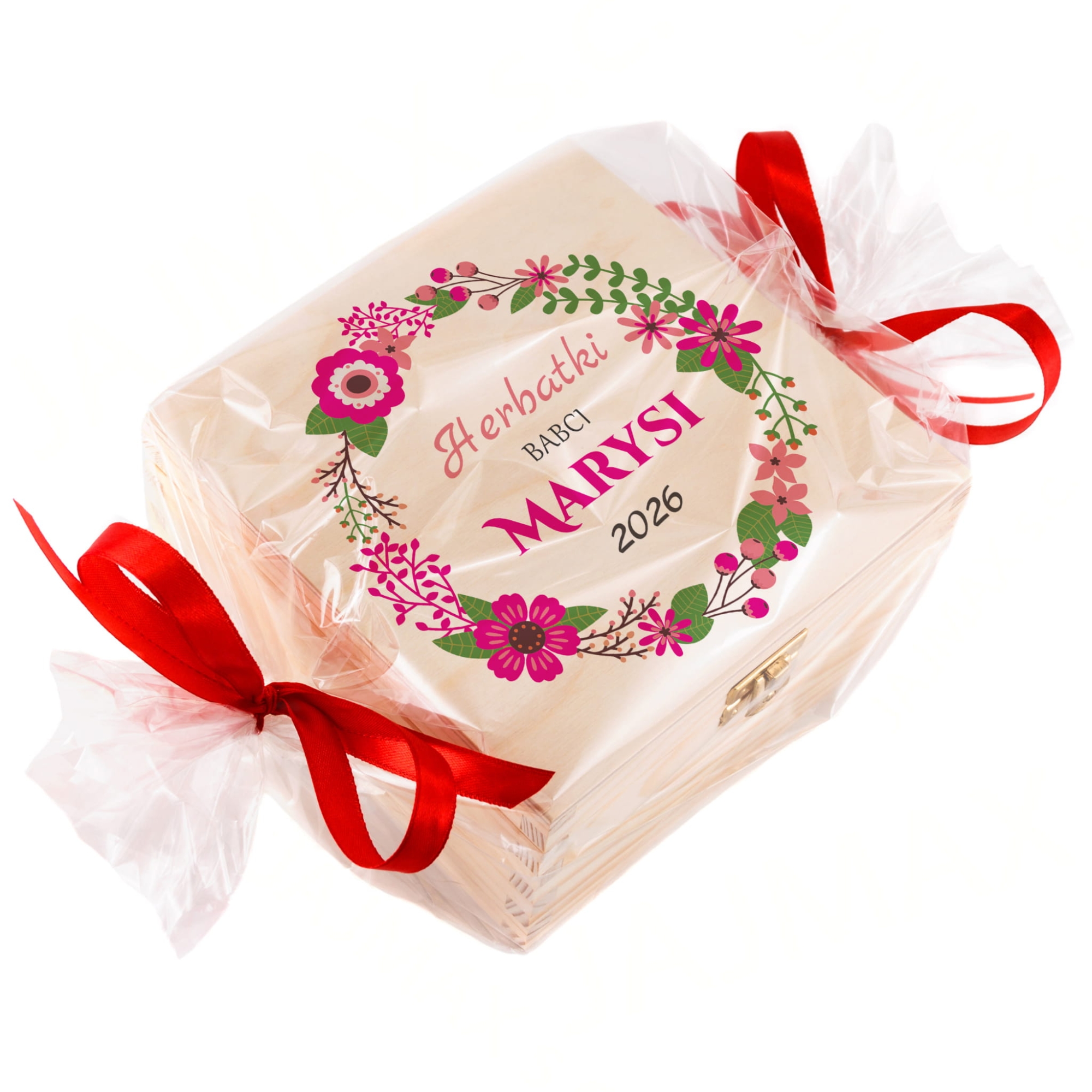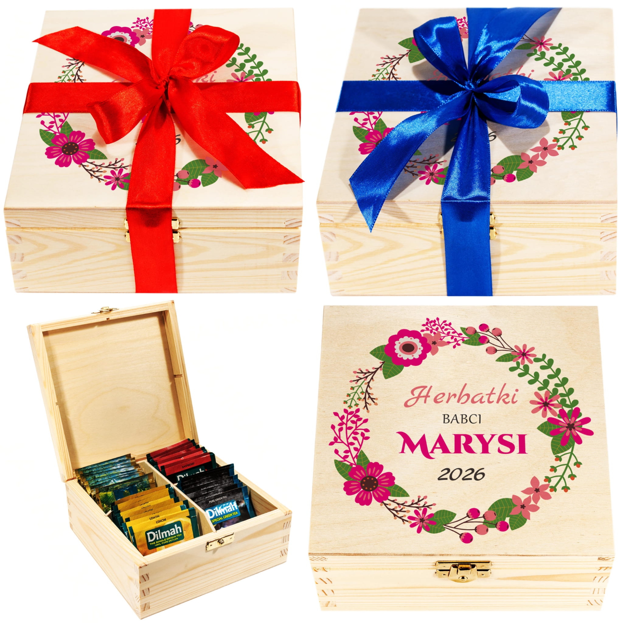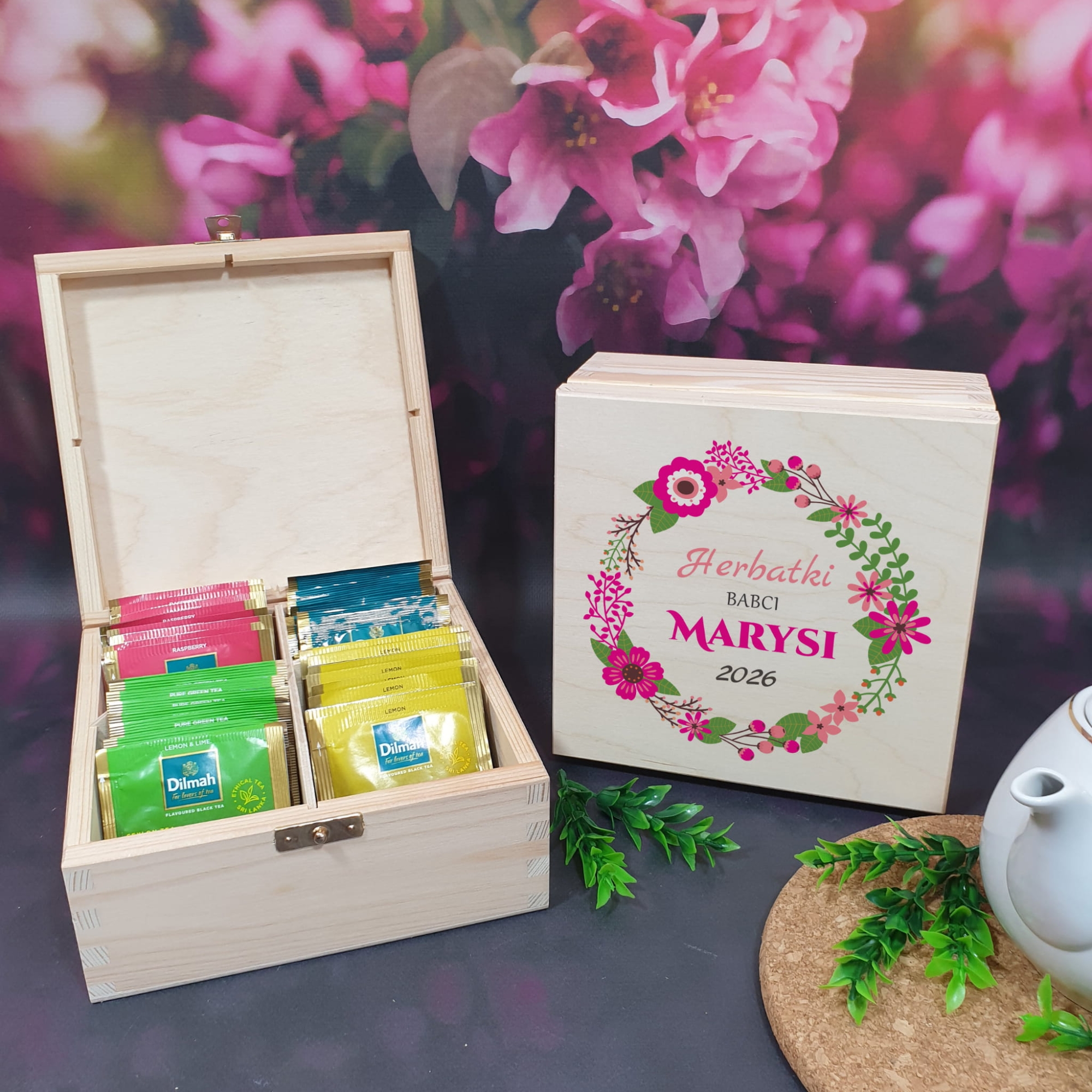 - drewniane pudełko na herbatę z indywidualnym grawerem,