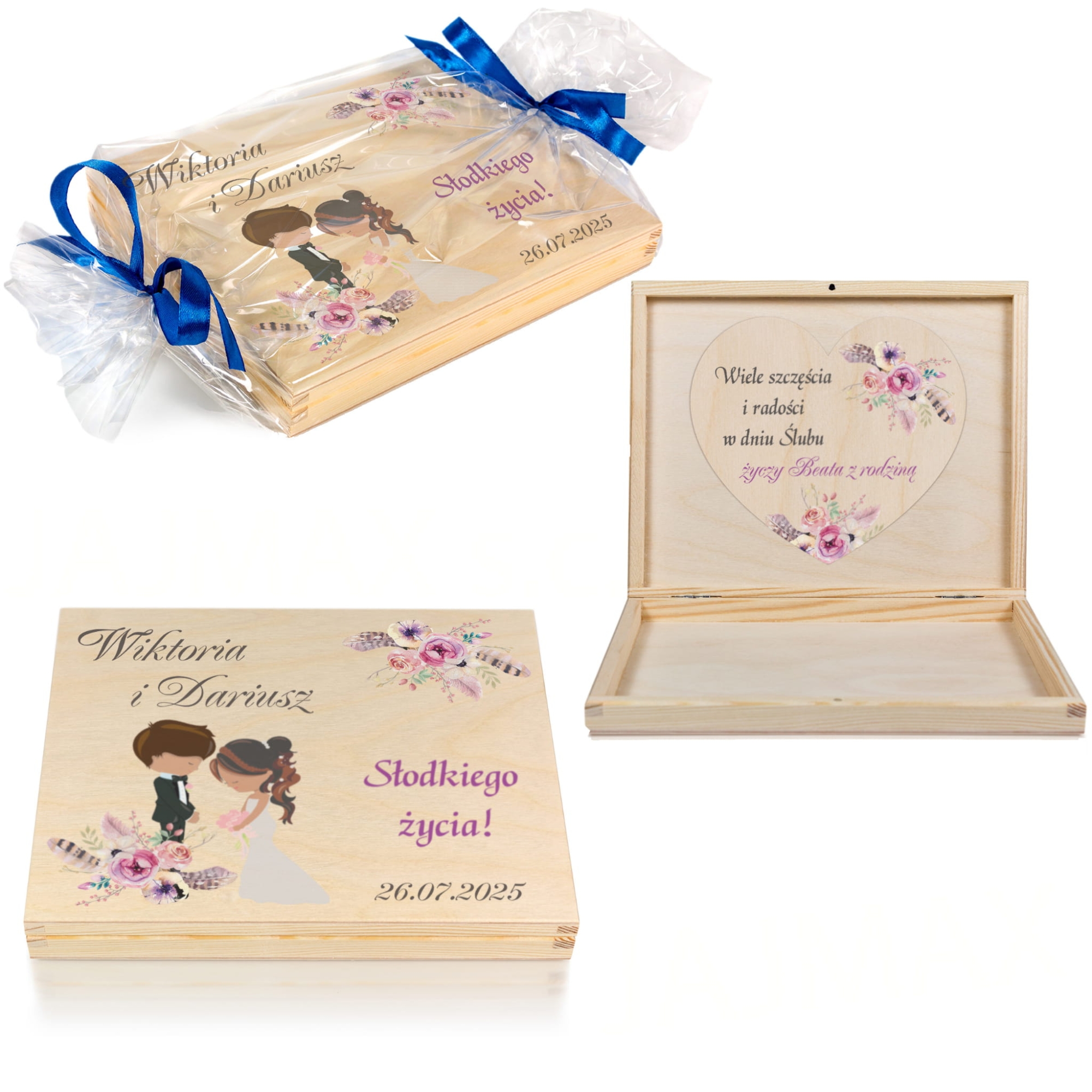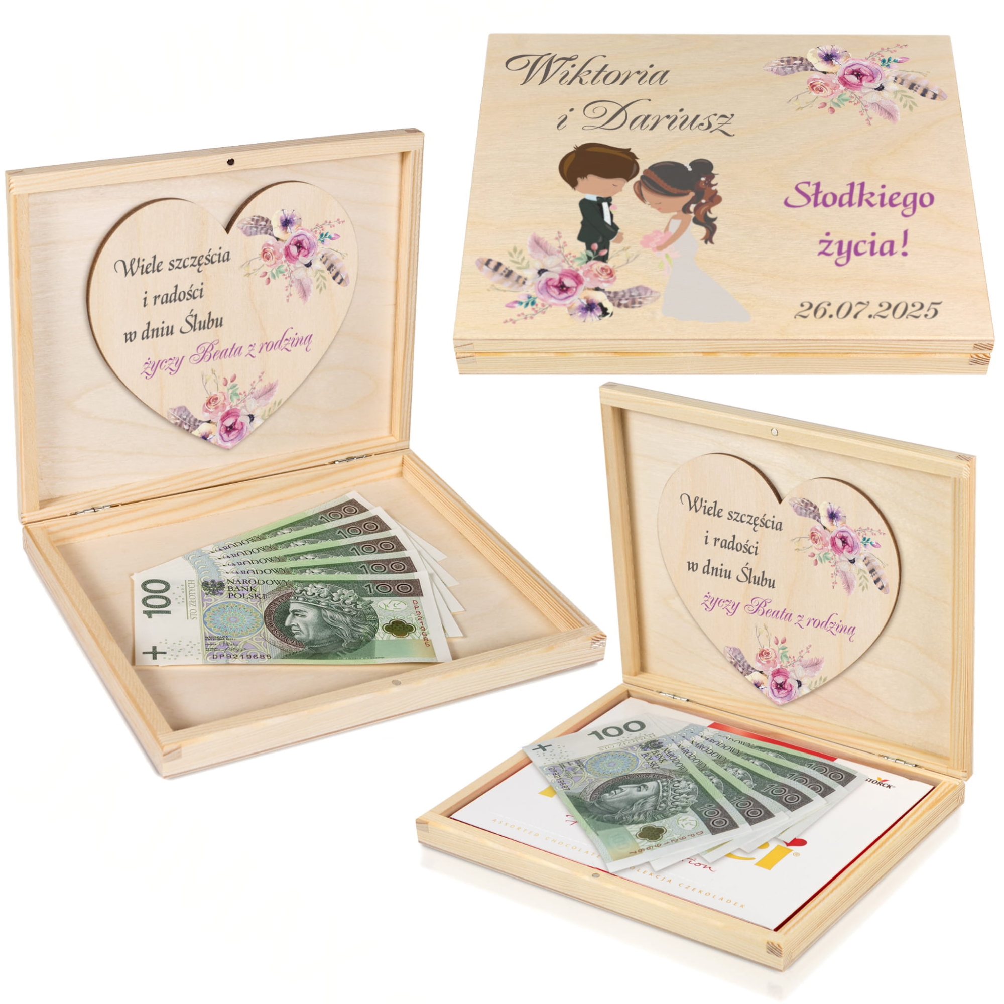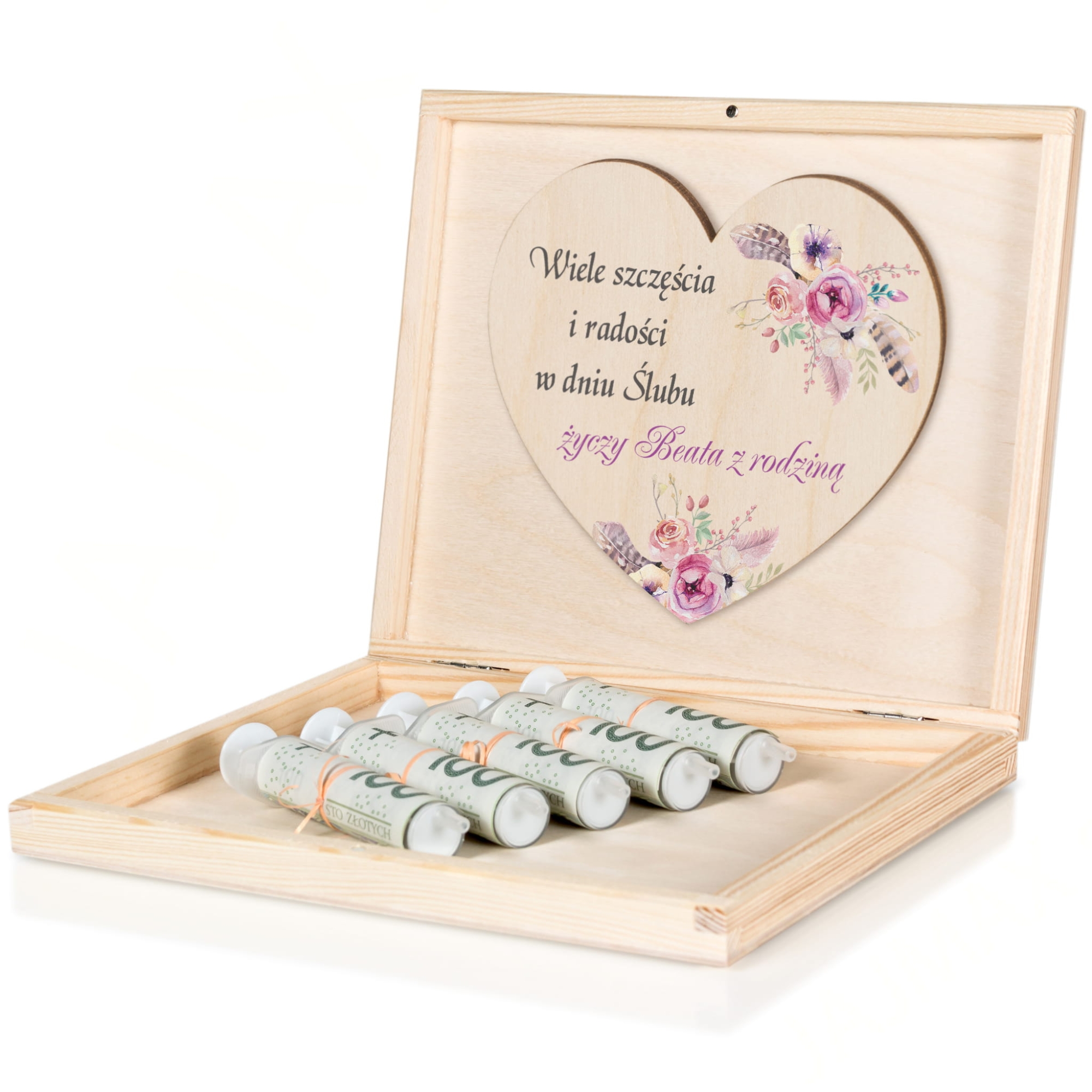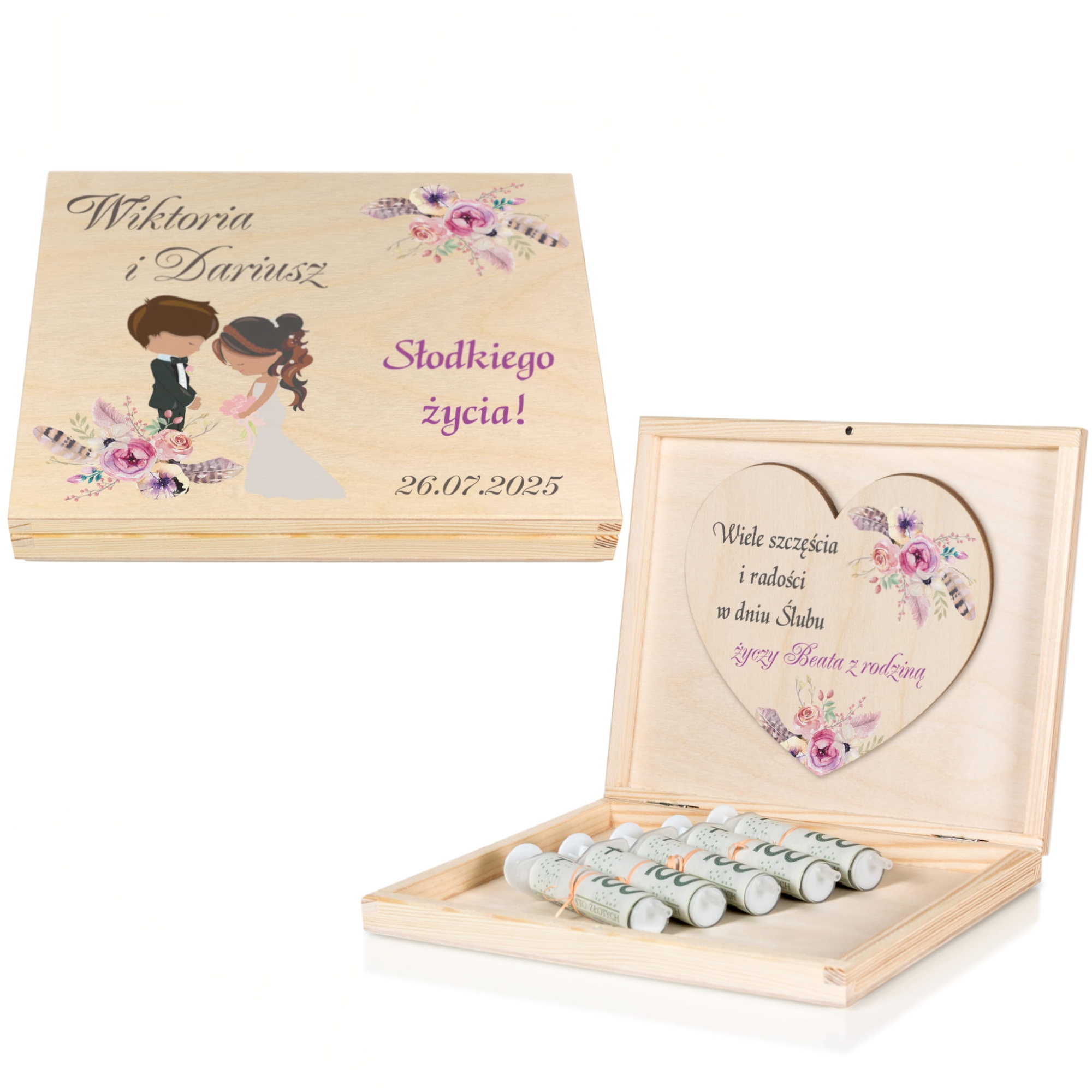 Kartka z życzeniami DREWNIANE PUDEŁKO NA PIENIĄDZE prezent ślubny