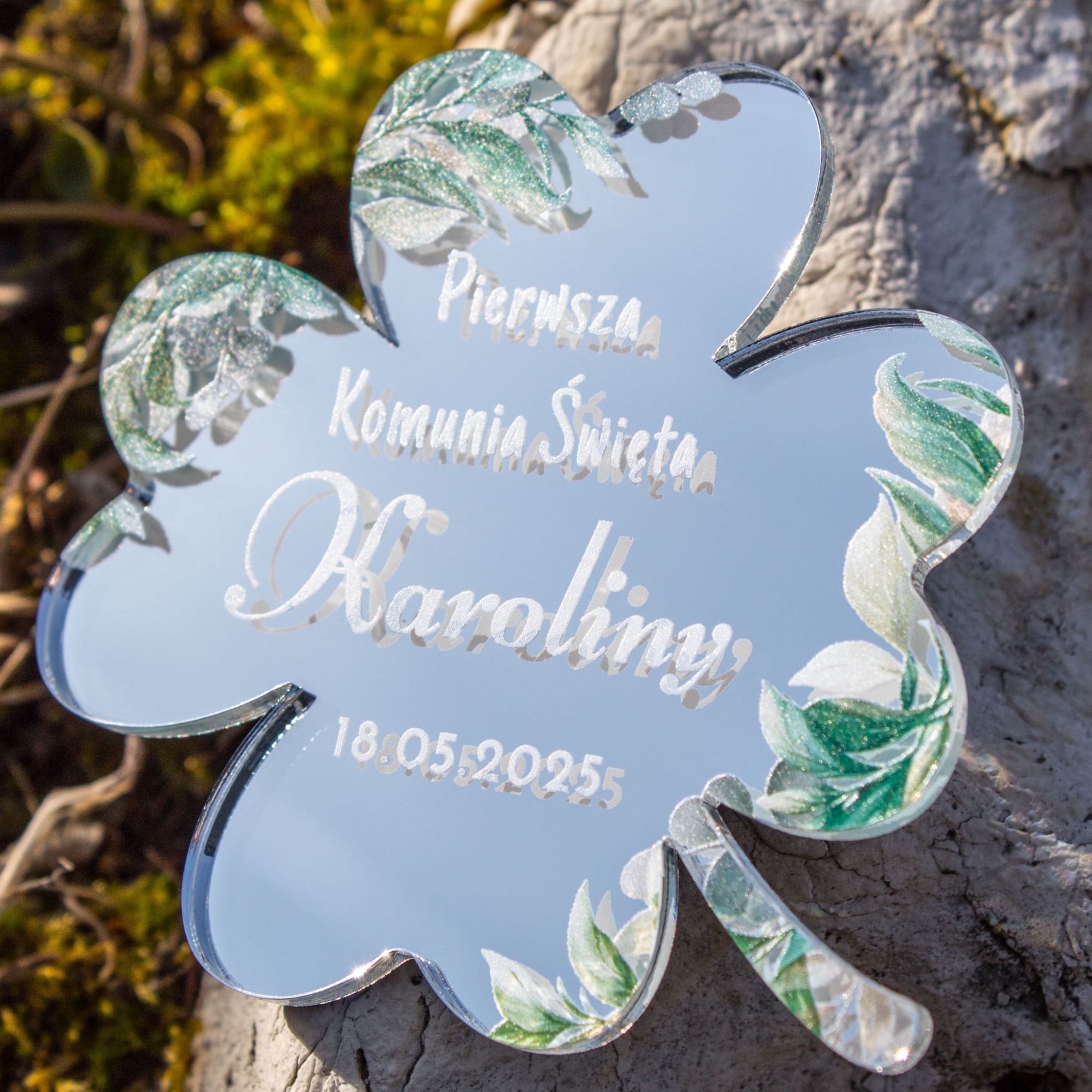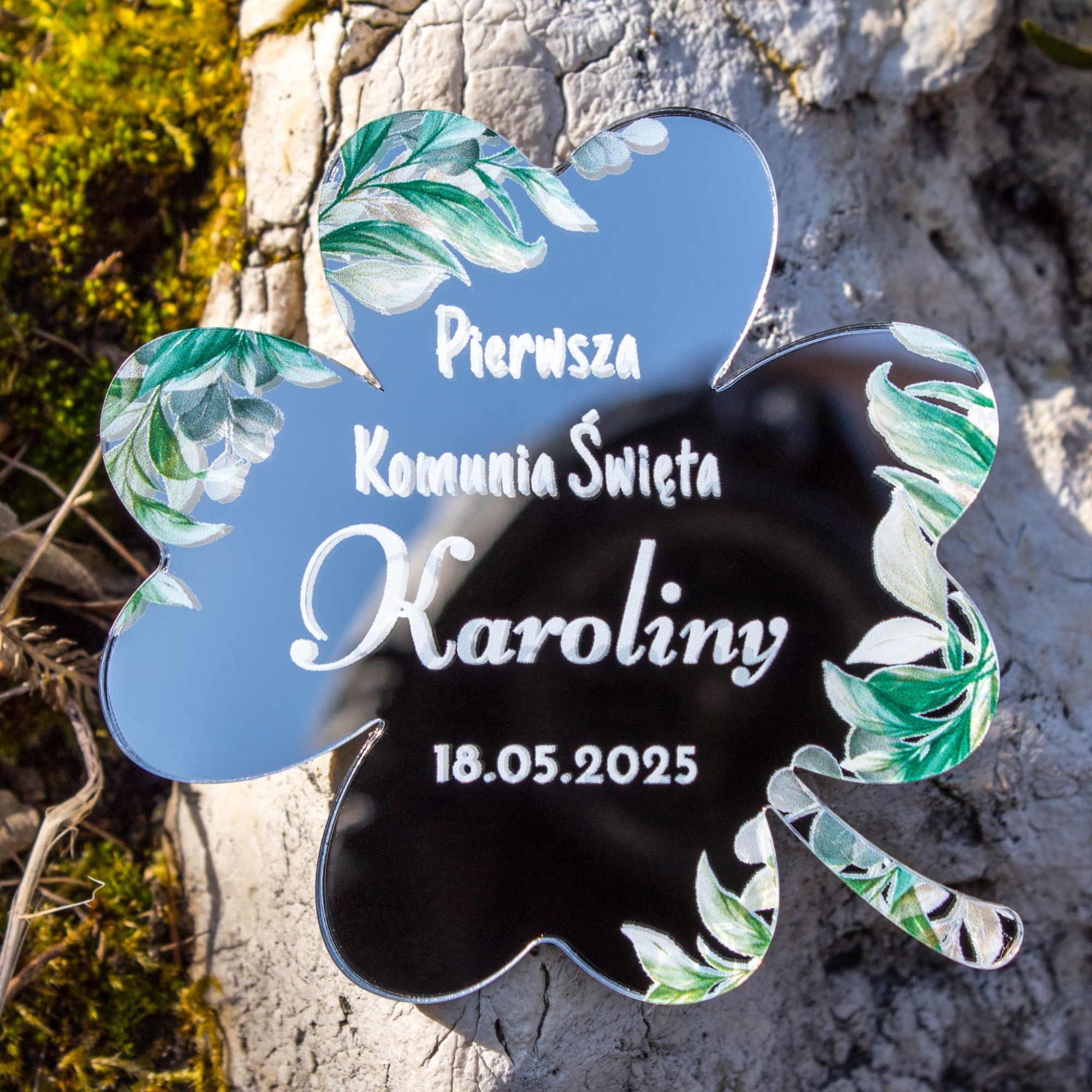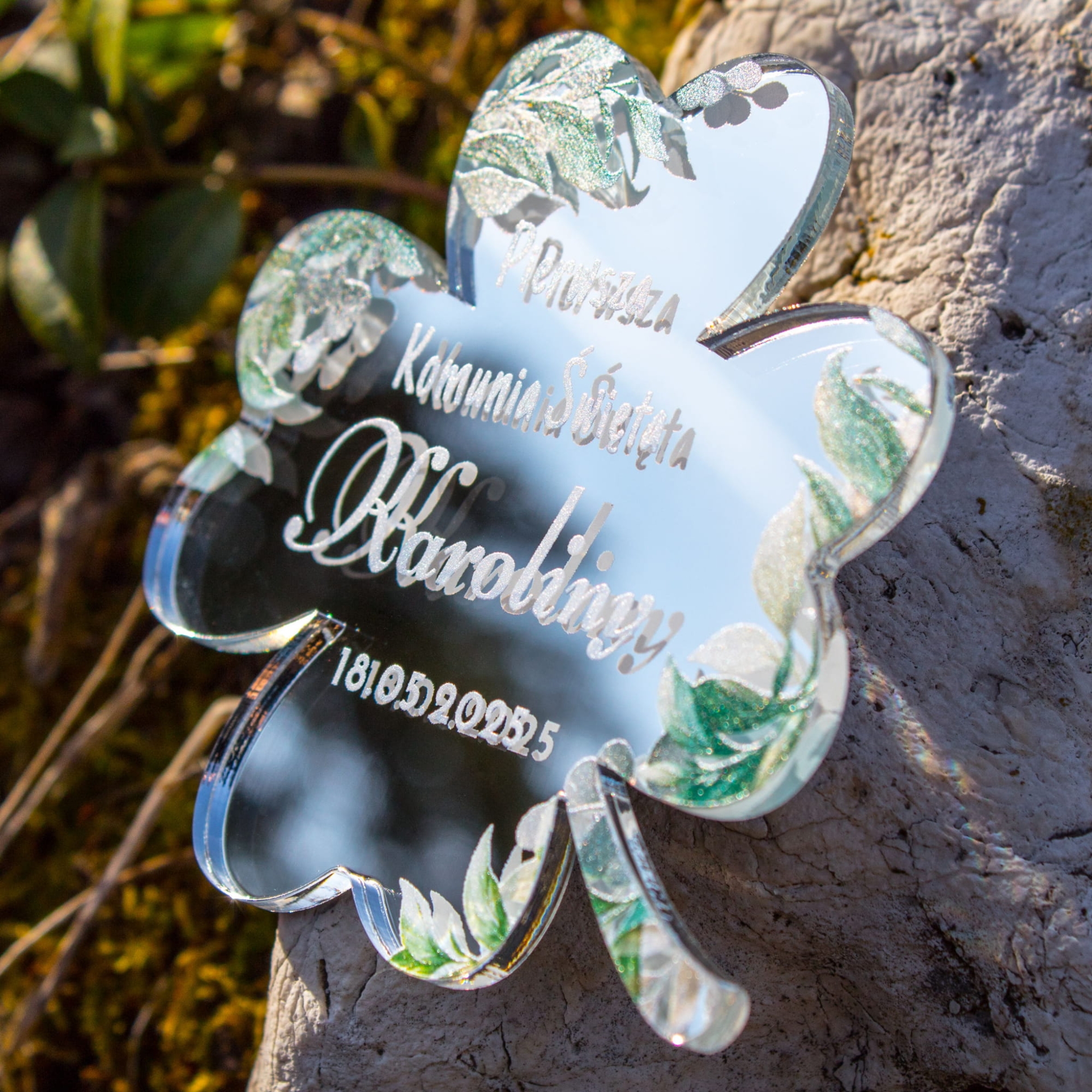 Symbol szczęścia i wdzięczności: Czterolistna koniczyna to znak pomyślności i duchowej harmonii, który doskonale wpisuje się w uroczystość Pierwszej Komunii Świętej.