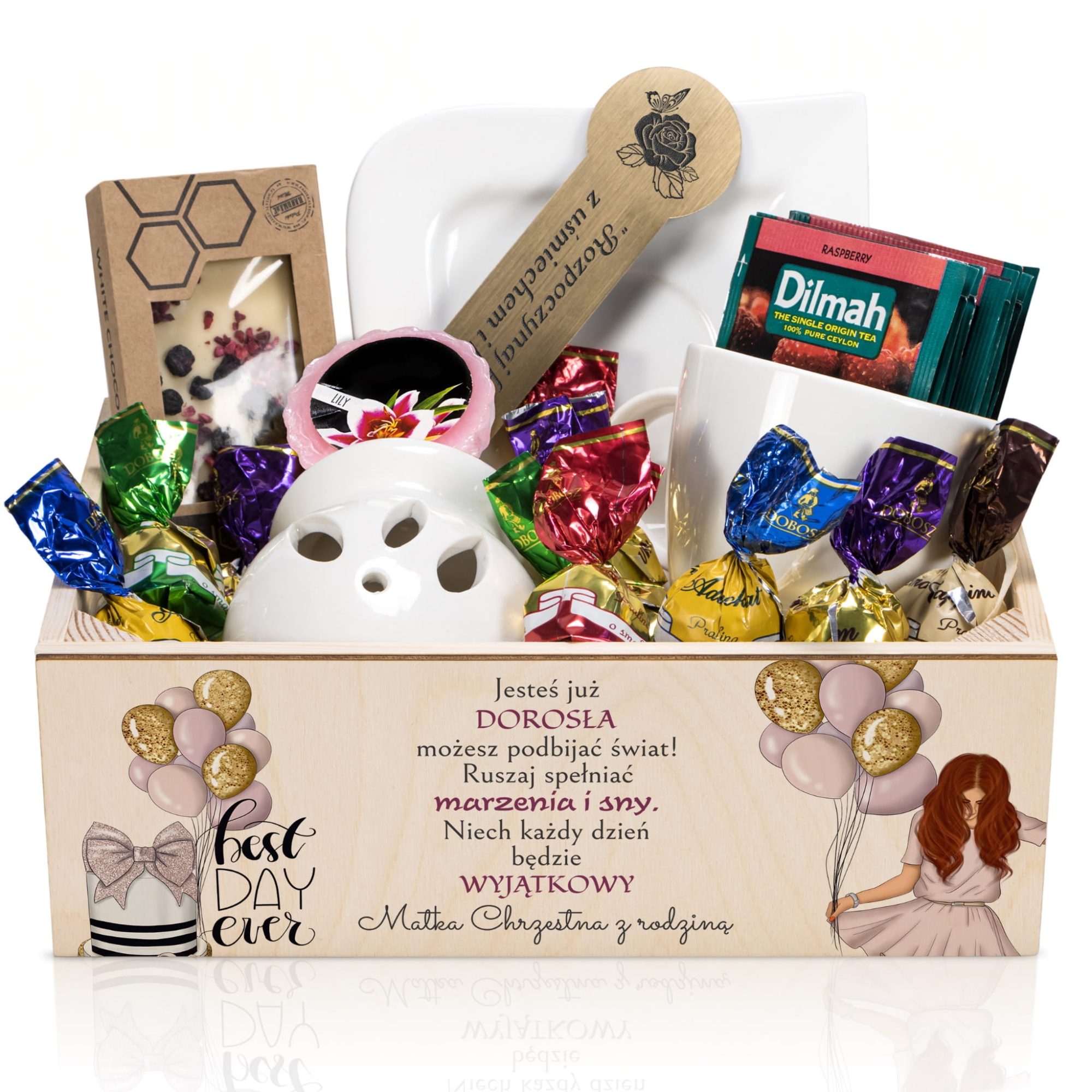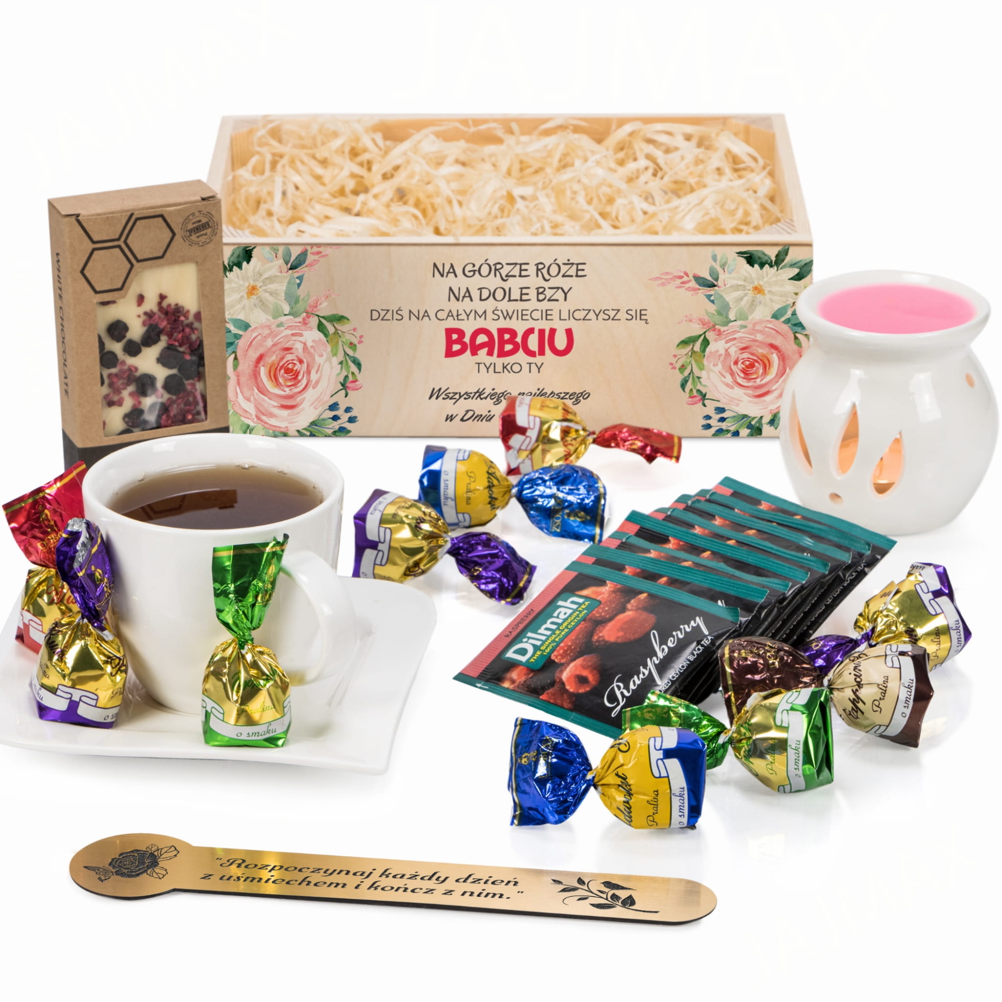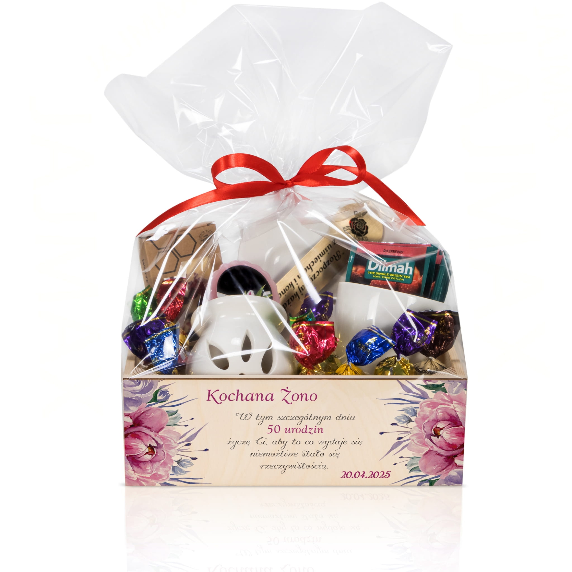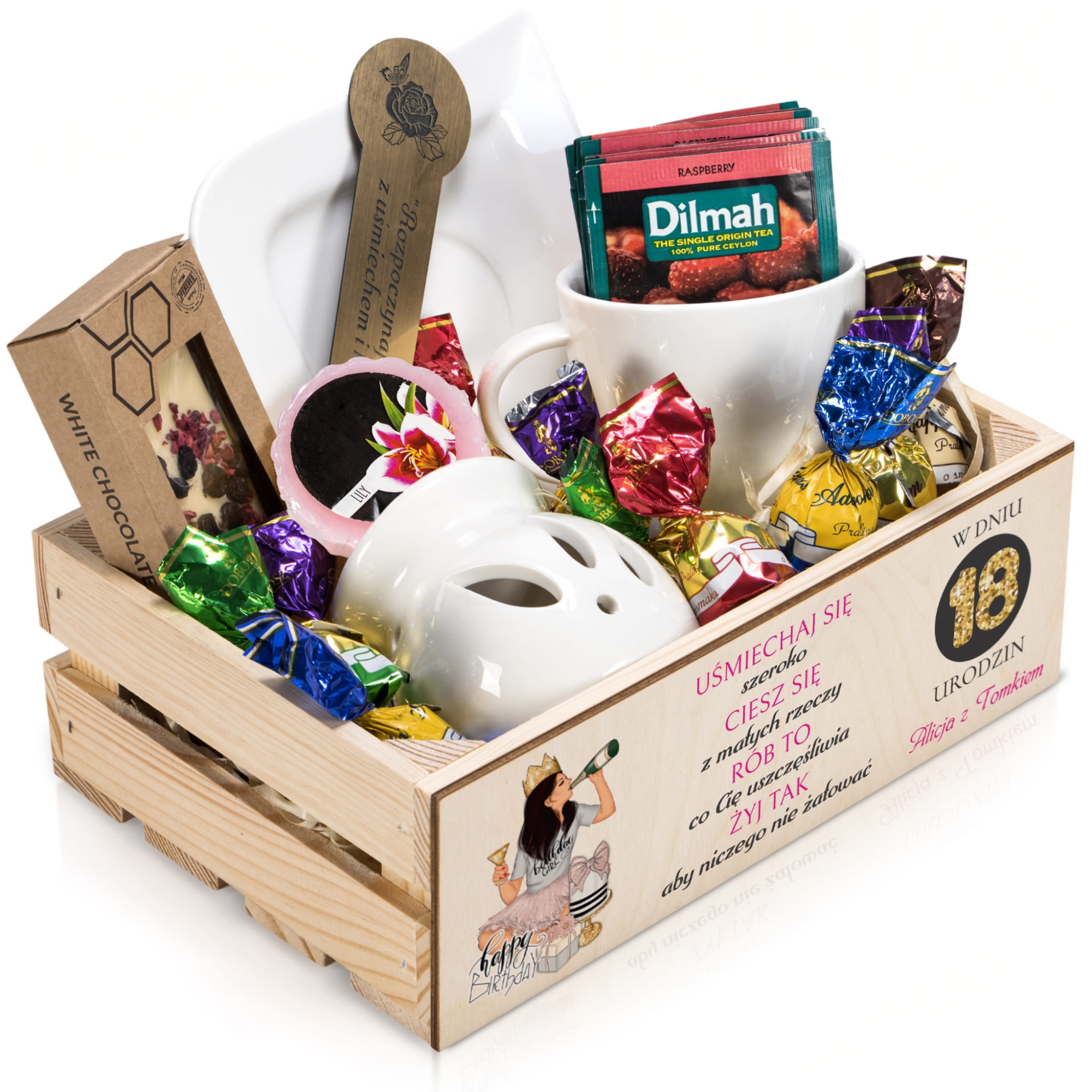 Jeśli przeglądasz kolejne witryny w poszukiwaniu wyjątkowego prezentu urodzinowego lub prezentu imieninowego, mamy dla Ciebie pomysł, który zakończy Twoje poszukiwania. Oryginalny, spersonalizowany kosz prezentowy jako drewniana skrzyneczka ze starannie dobraną kompozycją produktów w zestawie. W naszym koszu prezentowym znajdziesz kilka produktów najwyższej jakości, które razem tworzą elegancką, spójną i użyteczną kompozycję. Są to: porcelanowa filiżanka ze spodkiem, herbata Dilmah, czekolada premium, praliny czekoladowe, zakładka do książki z grawerem, kominek do aromaterapii oraz wosk zapachowy. Prezent z indywidualnymi życzeniami to zawsze świetny pomysł, aby uszczęśliwić obdarowywaną osobę. Doskonale sprawdzi się szczególnie jako prezent dla niej. Będzie to strzał w dziesiątkę jako prezent dla mamy, prezent dla babci, prezent dla cioci, prezent dla siostry, prezent dla przyjaciółki, prezent dla koleżanki z pracy. Jest to dobra propozycja zarówno na prezent na 18 urodziny, prezent na 30 urodziny, prezent na 40 urodziny i każde kolejne. Personalizacji podlega drewniana tabliczka umieszczona na froncie. Specjalnie z myślą o kobietach stworzyliśmy kilka kolorowych projektów graficznych. Podążając za trendami w dekoracji upominków do wypełnienia naszej drewnianej skrzyneczki użyliśmy ekologicznej wełny drzewnej.