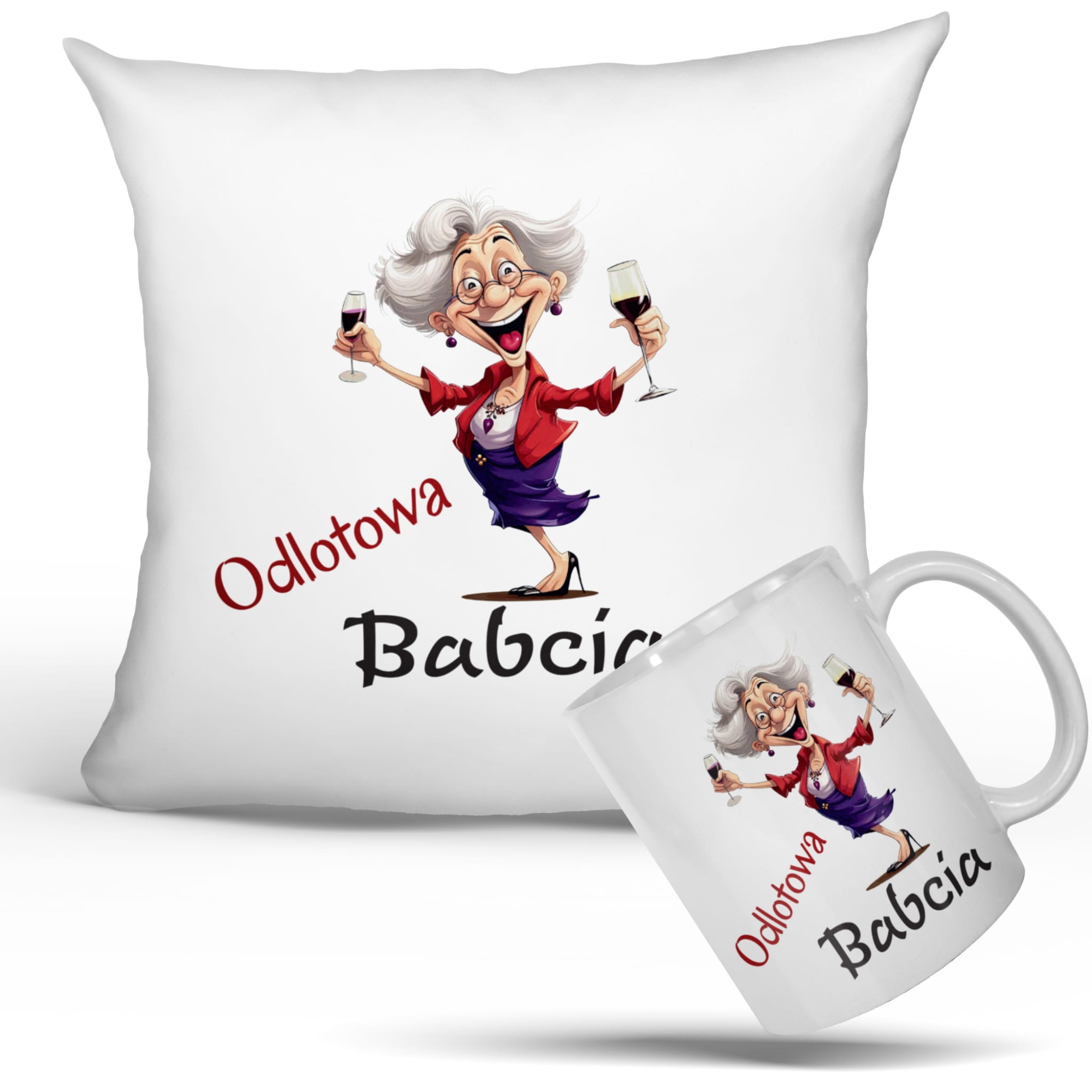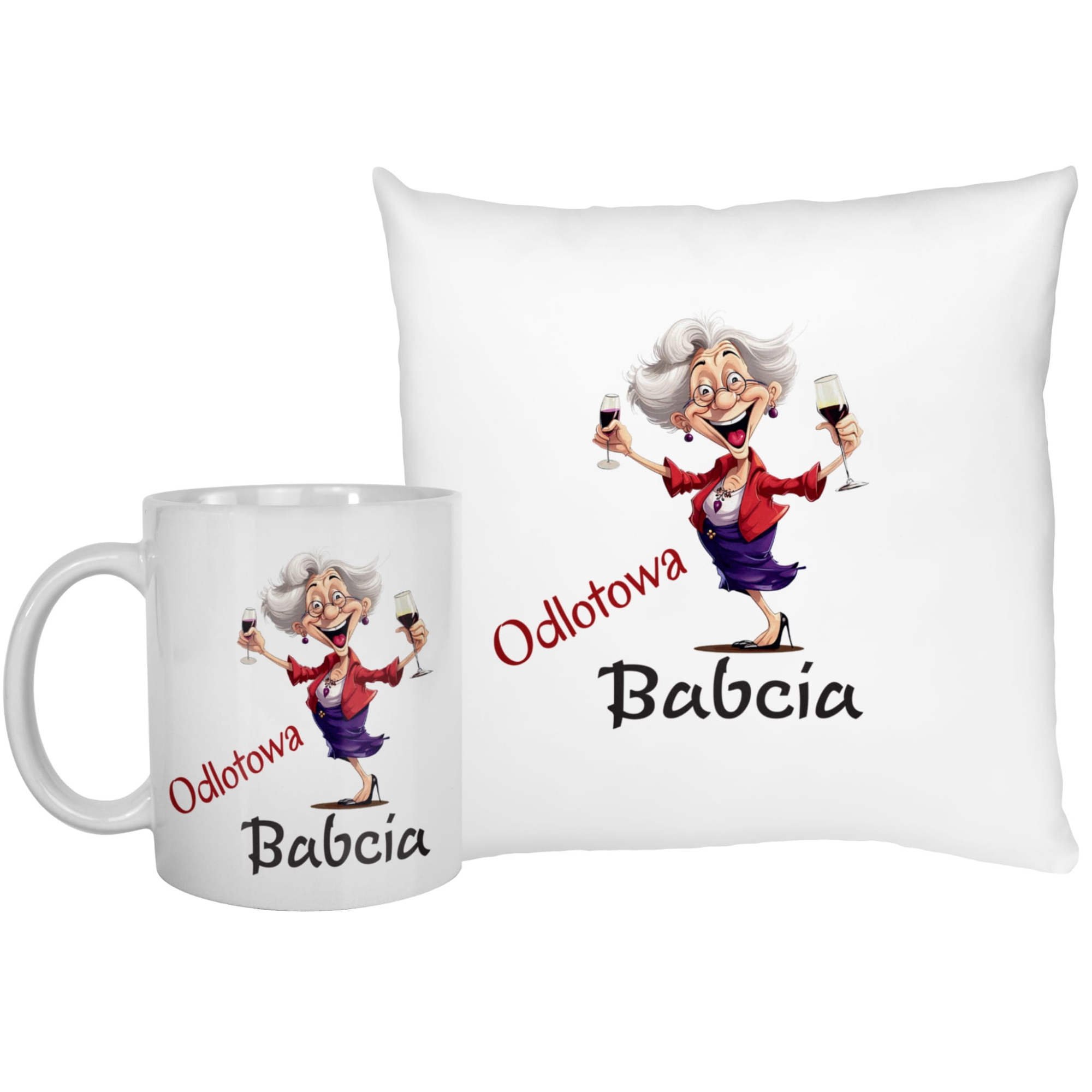 Kubek Dzień Babci i poduszka – zestaw prezentowy „Odlotowa Babcia” na 21 stycznia