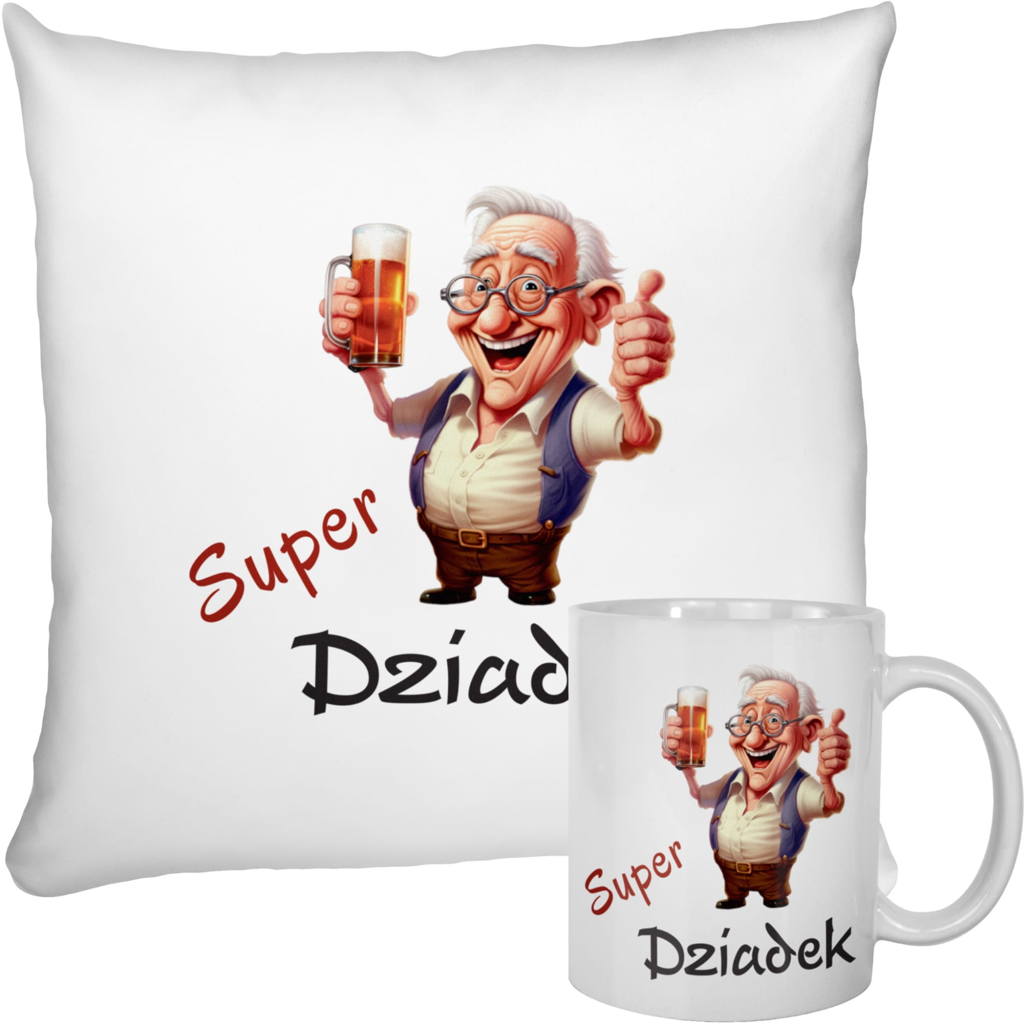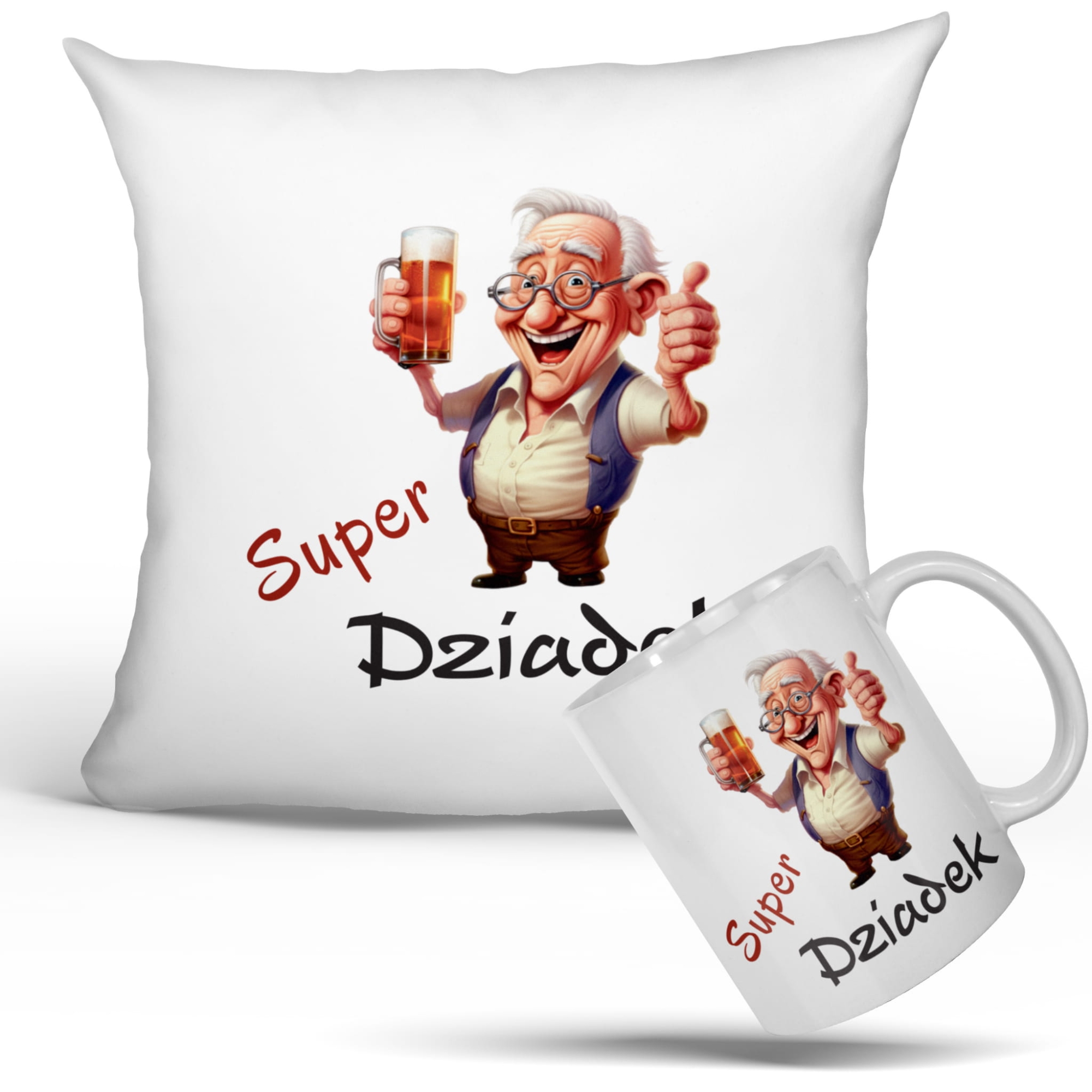 Wyobraź sobie, jak Dziadek rozpakowuje pudełko, a w środku znajduje poduszkę z zabawną ilustracją roześmianego dziadka i dużym napisem Super Dziadek. Zaraz potem odkrywa pasujący kubek z tym samym nadrukiem – już widzisz ten uśmiech? Taki zestaw prezentowy dla Dziadka sprawi, że każda popołudniowa herbata, kawa czy ulubiony napój nabierze wyjątkowego smaku.