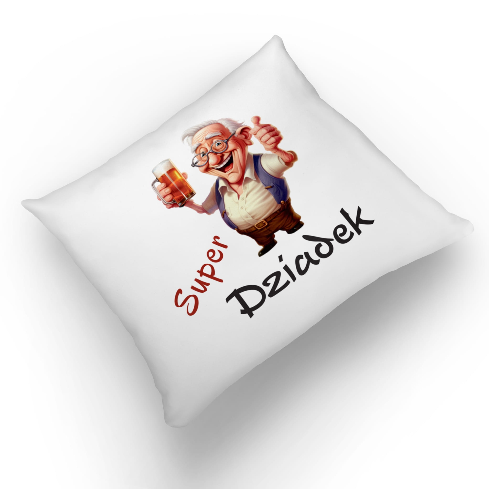 - Poduszka dla Dziadka z nadrukiem – miękka, przyjemna w dotyku i jednocześnie bardzo dekoracyjna. Kolorowy nadruk z uśmiechniętym dziadkiem i napisem „Super Dziadek” dodaje jej charakteru i od razu rzuca się w oczy. Świetnie wygląda na kanapie, fotelu czy łóżku – wszędzie tam, gdzie Dziadek lubi odpoczywać.
