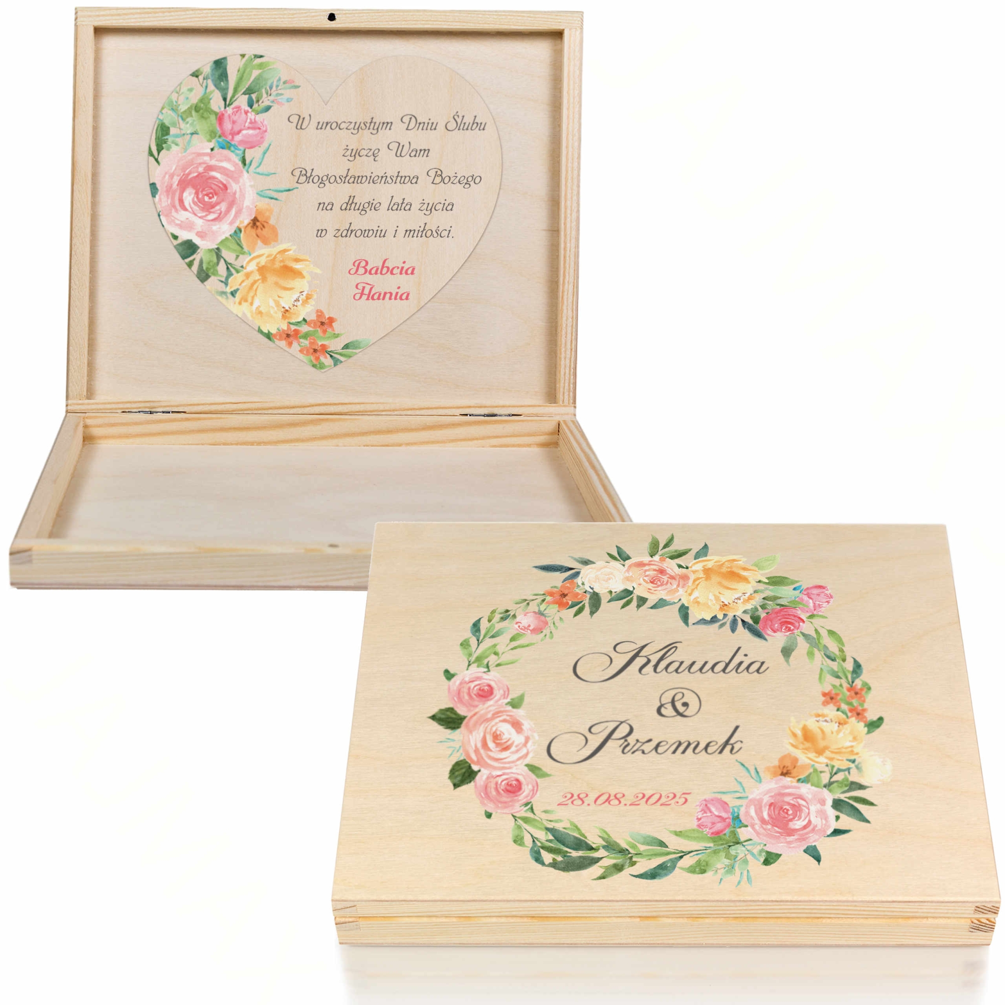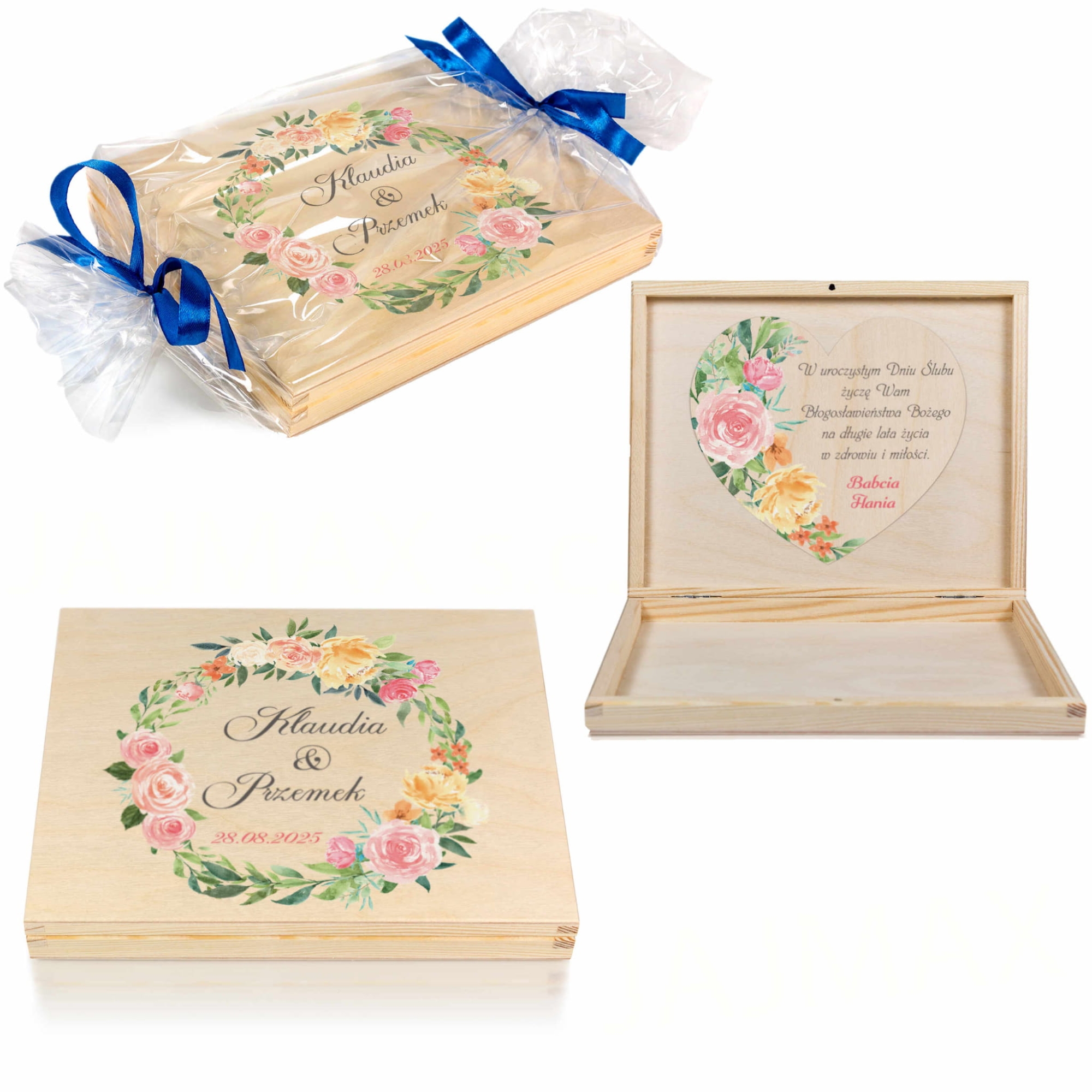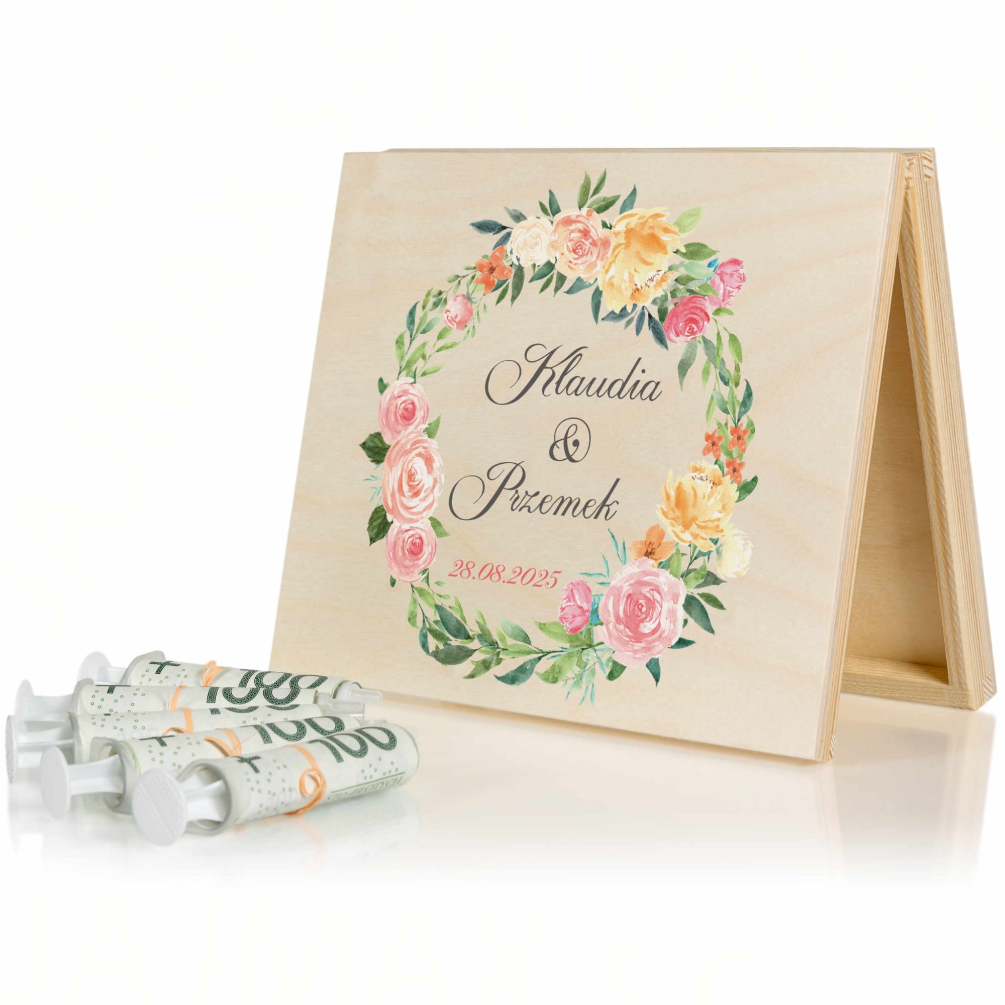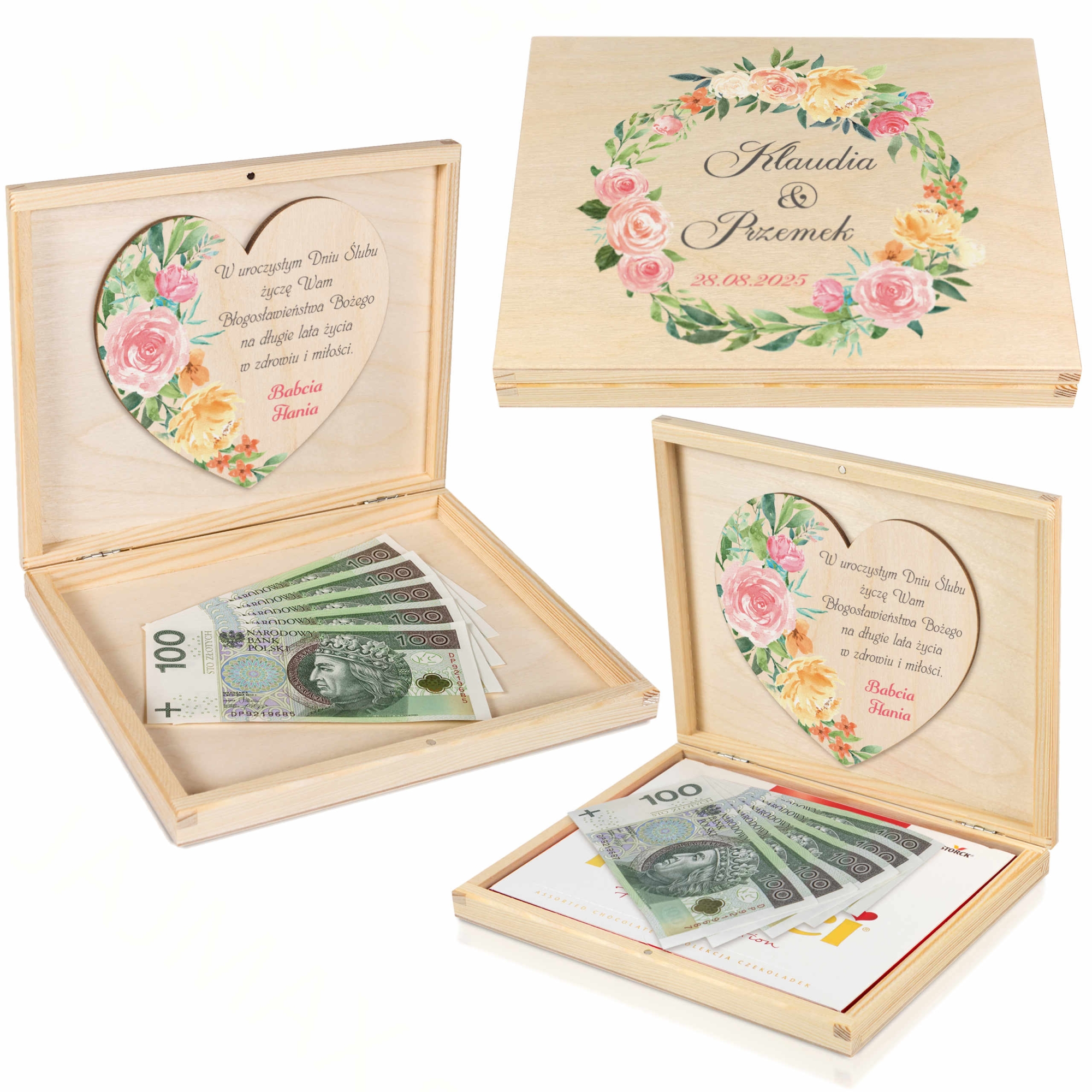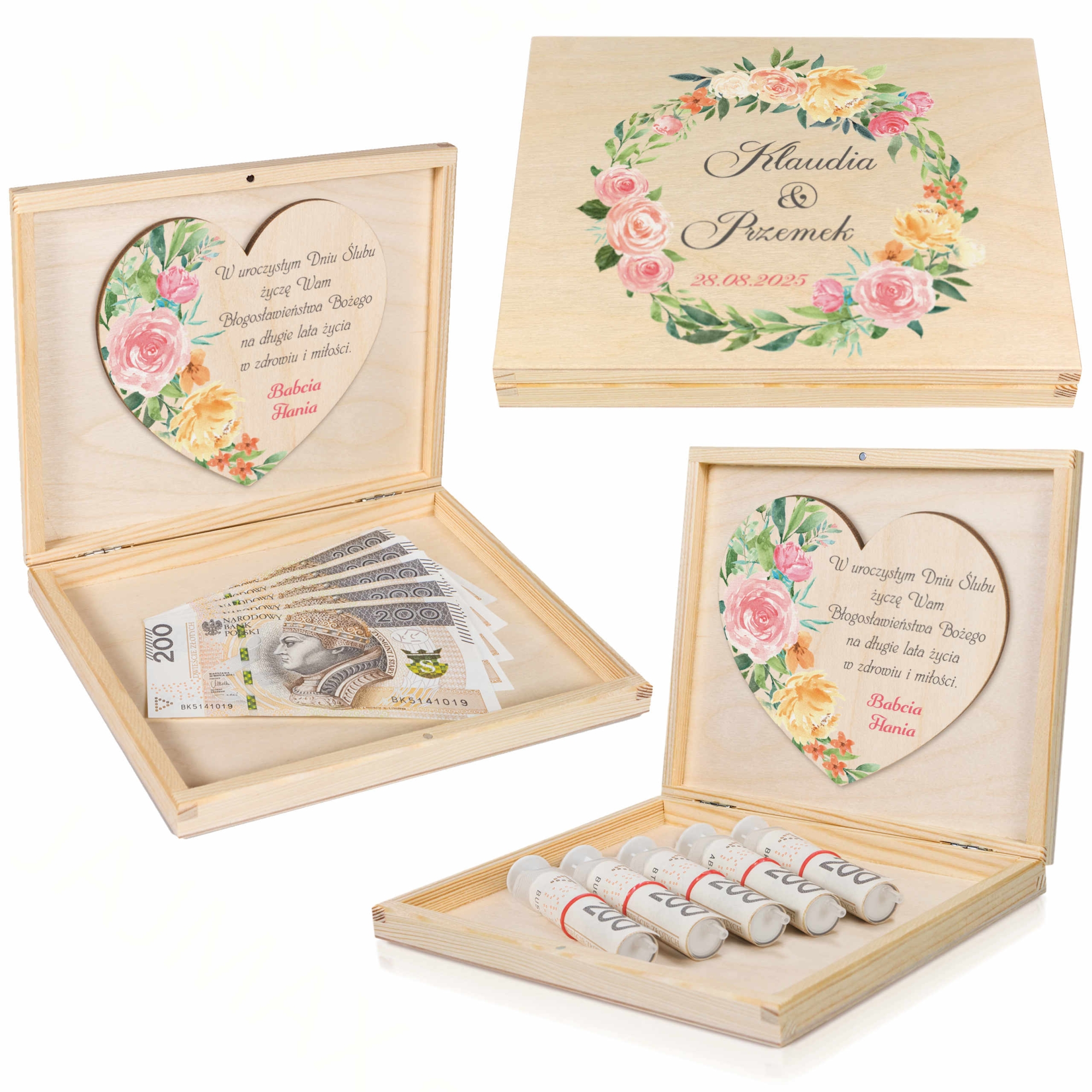 Kwiatowe pudełko z życzeniami NOWOCZESNA KARTKA ŚLUBNA NA PIENIĄDZE