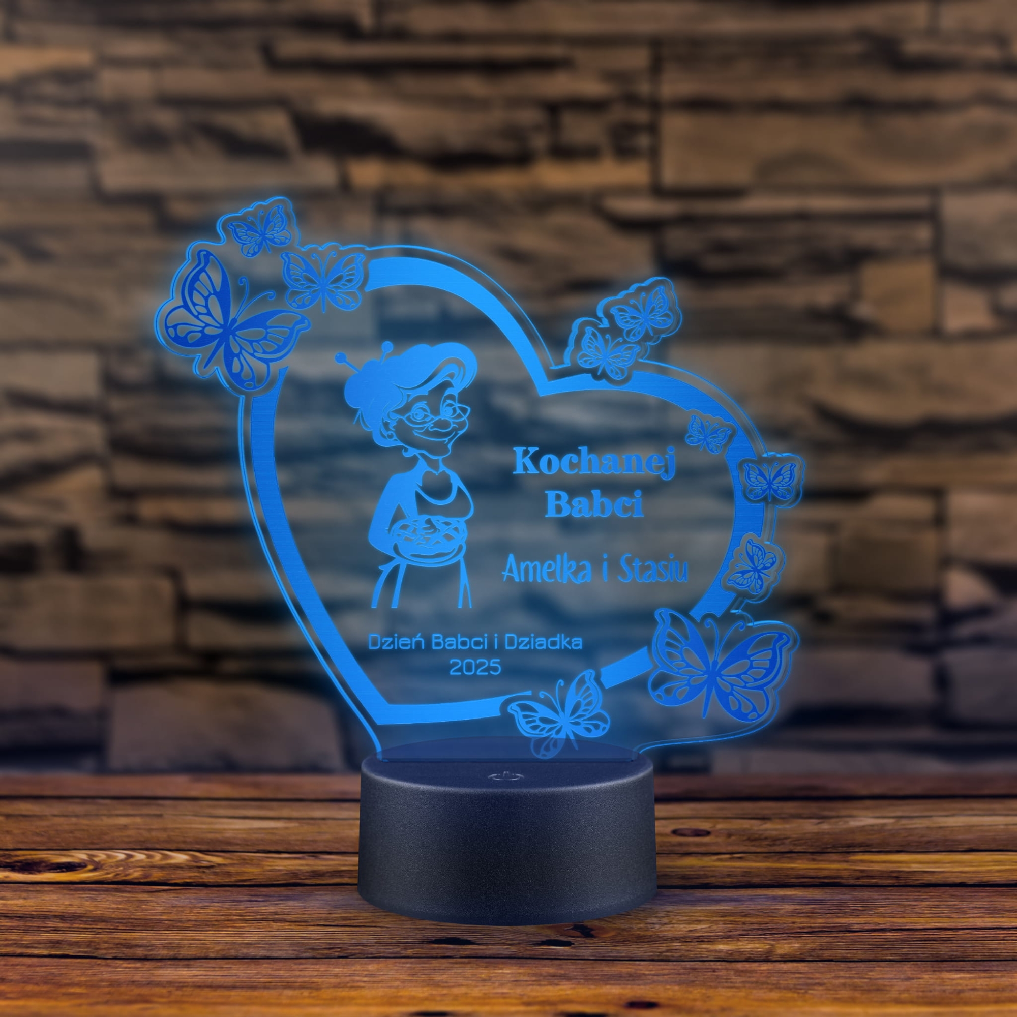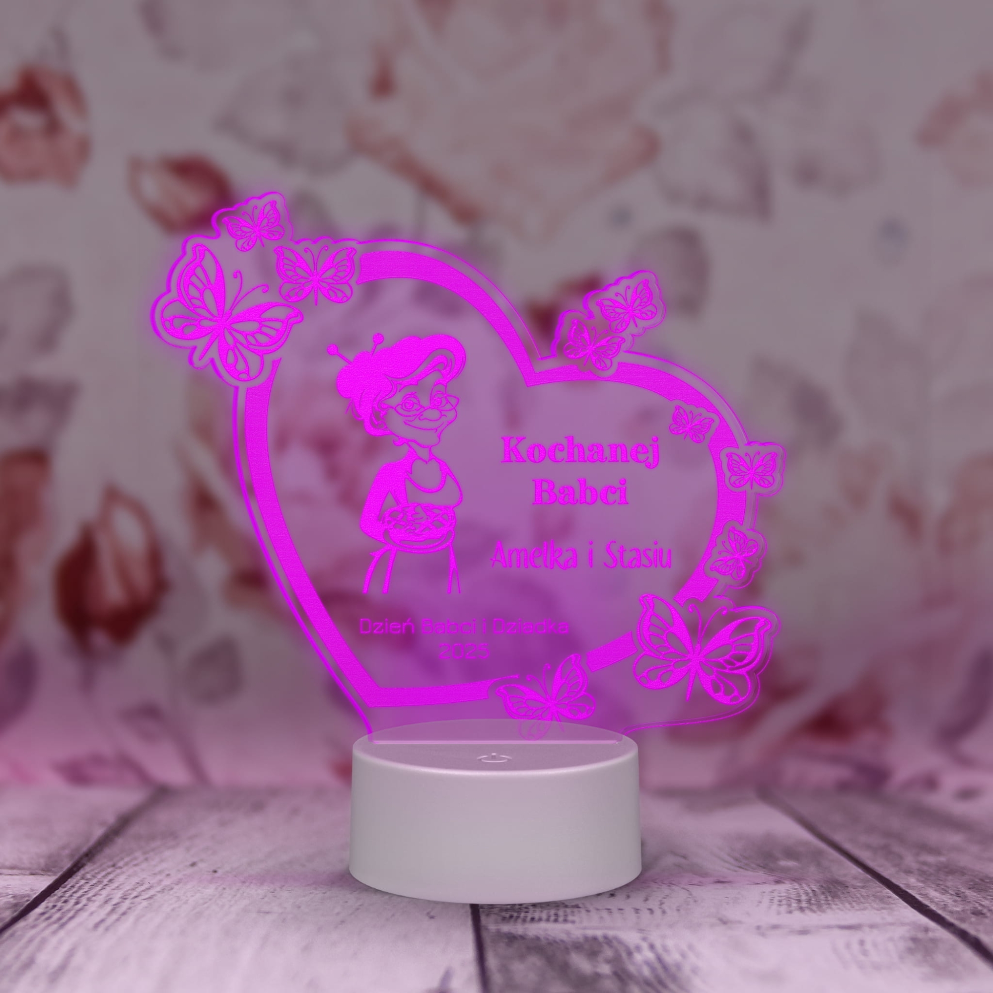 LAMPKA LED Z ŻYCZENIAMI DLA BABCI wyjątkowy prezent od wnuków SERCE Z GRAWEREM lampka prezent dla Dziadka z Twoim podpisem Statuetka LED serce z motylami PREZENT DLA BABCI I DZIADKA GRAWER PREZENT DLA DZIADKA Z PODPISEM ledowa statuetka wielokolorowe serce