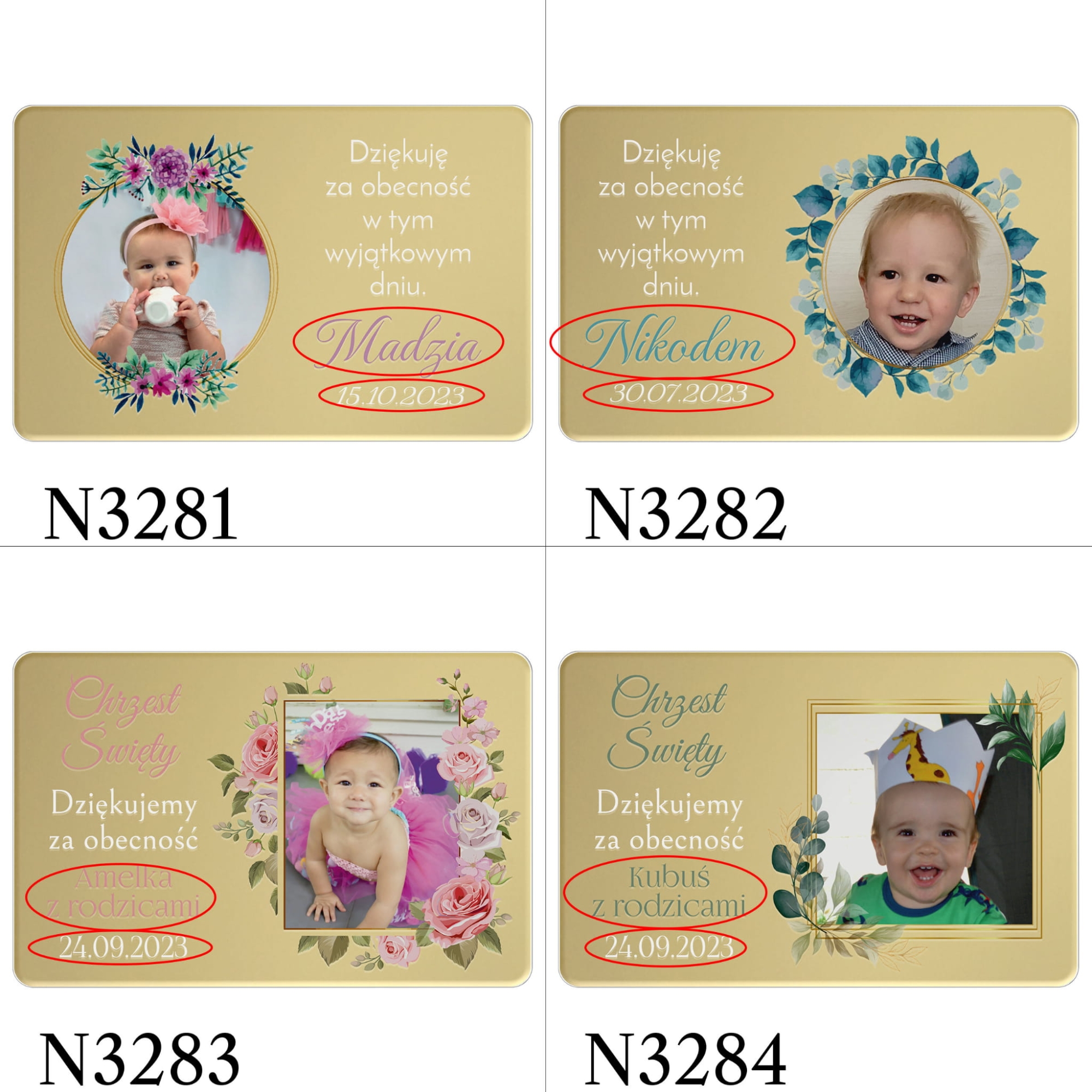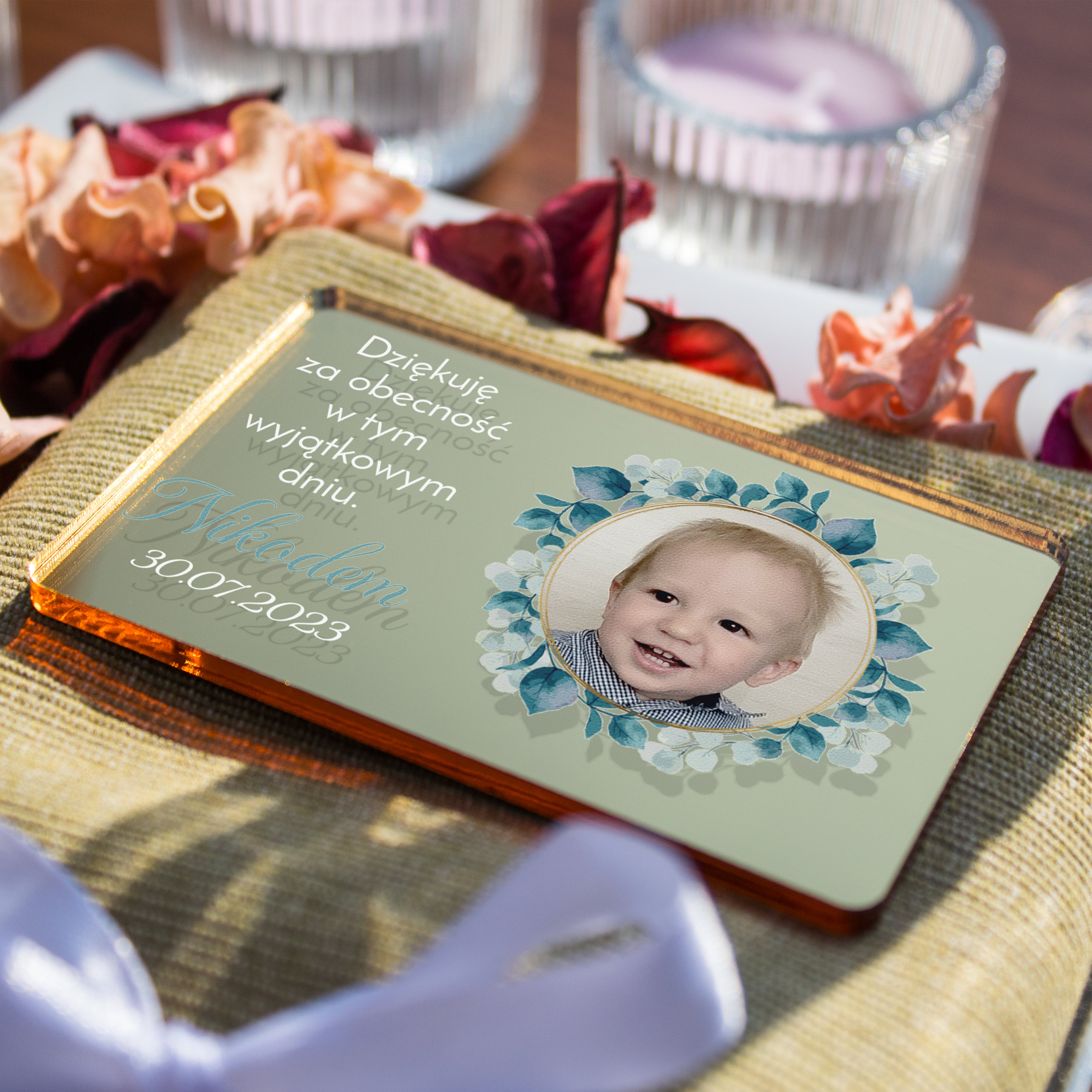 Szukasz niezwykłego sposobu, aby wyrazić swoją wdzięczność wobec bliskich, którzy uczestniczyli w wyjątkowym wydarzeniu jakim jest Chrzest? Nasz lustrzany złoty magnes ze zdjęciem to doskonały wybór! Upominki dla gości na Chrzest to miły gest, dzięki któremu bliscy będą mogli wspominać ten piękny moment za każdym razem, gdy na niego spojrzą. Niech Wasze podziękowania za Chrzest będą wyjątkowe i niezapomniane dzięki naszemu magnesowi ze zdjęciem. Dajcie swoim bliskim piękny upominek, który przypomni im o tych wyjątkowych chwilach i wyrazi Waszą głęboką wdzięczność. Wybierzcie nasz magnes i zobaczcie, jak małe rzeczy mogą tworzyć piękne wspomnienia. Do wyboru kilka motywów dla chłopca i dziewczynki.
