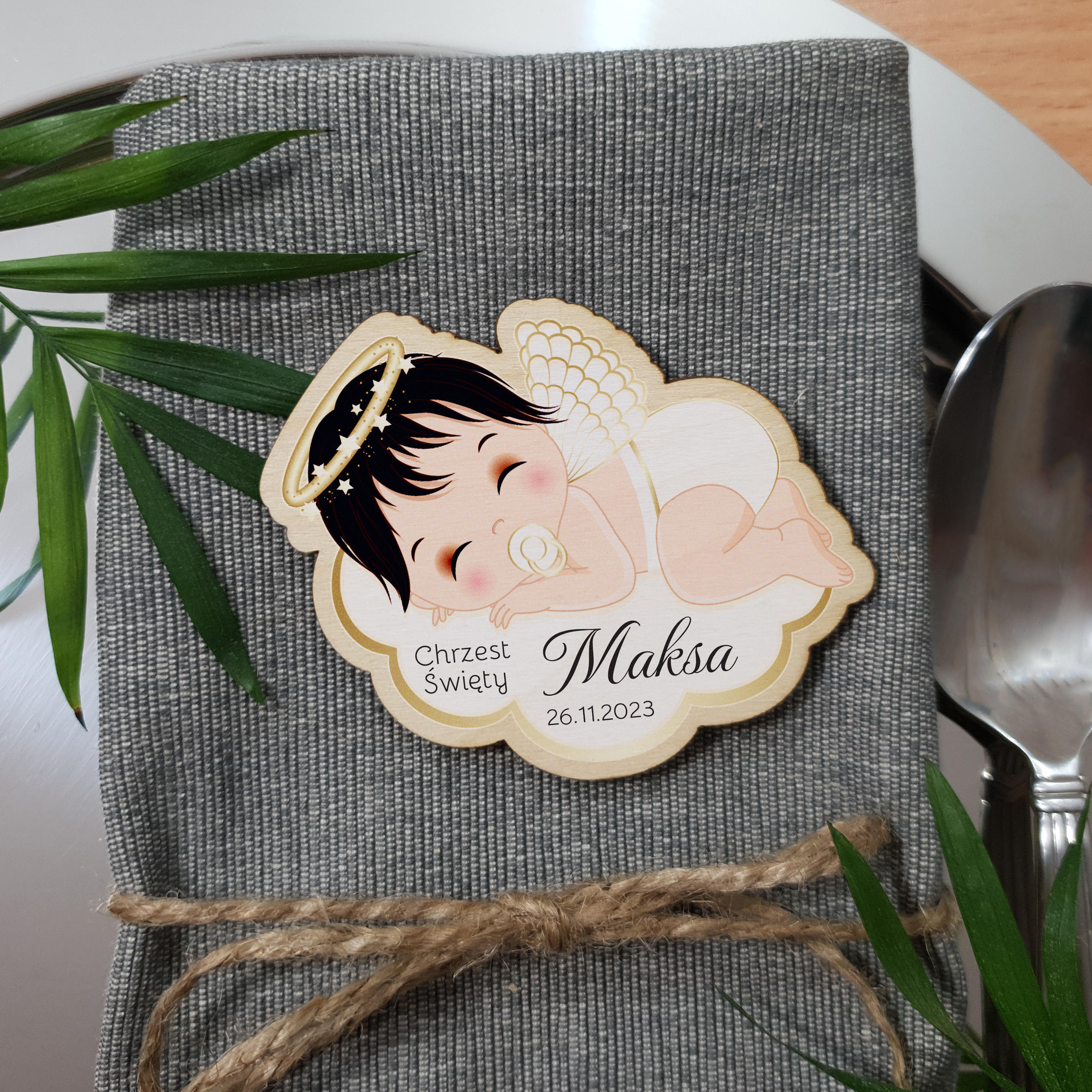 Wyjątkowy Drewniany Magnes bobas aniołek na chmurce z Personalizacją - Idealne Podziękowanie za Udział w Chrzcie Świętym! Zapraszamy do odkrycia naszego niezwykłego magnesu, który jest nie tylko uroczym elementem dekoracyjnym, ale także serdecznym wyrazem wdzięczności za obecność w wyjątkowym dniu Chrztu Świętego! Ten pięknie wykonany aniołek na chmurce przynosi ze sobą zarówno duchową symbolikę, jak i osobisty akcent dzięki personalizacji. Nadruk w postaci imienia dziecka i daty Chrztu sprawia, że te podziękowania dla gości za przybycie na Chrzest są szczególne. Delikatny złoto-biały aniołek bobas spoczywający na puszystej chmurce symbolizuje opiekę i błogosławieństwo. To nie tylko pamiątka z ważnego dnia, ale również piękny element, który może urozmaicić każde wnętrze.