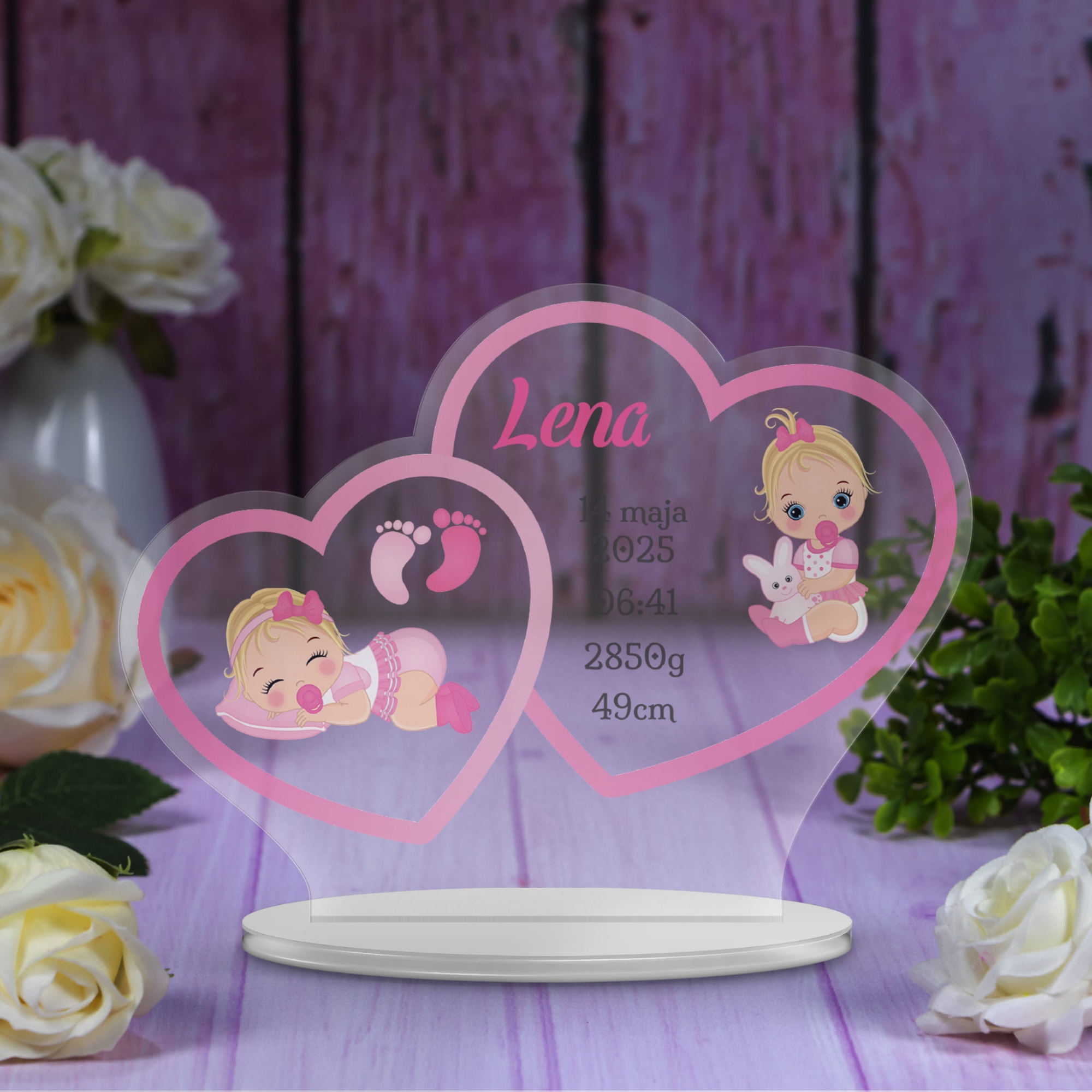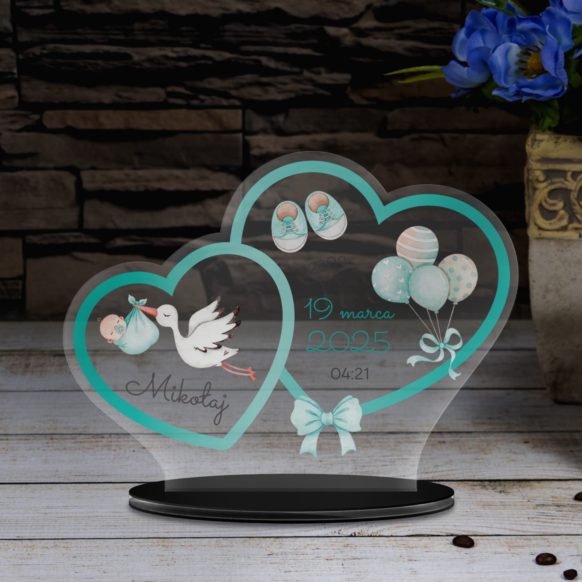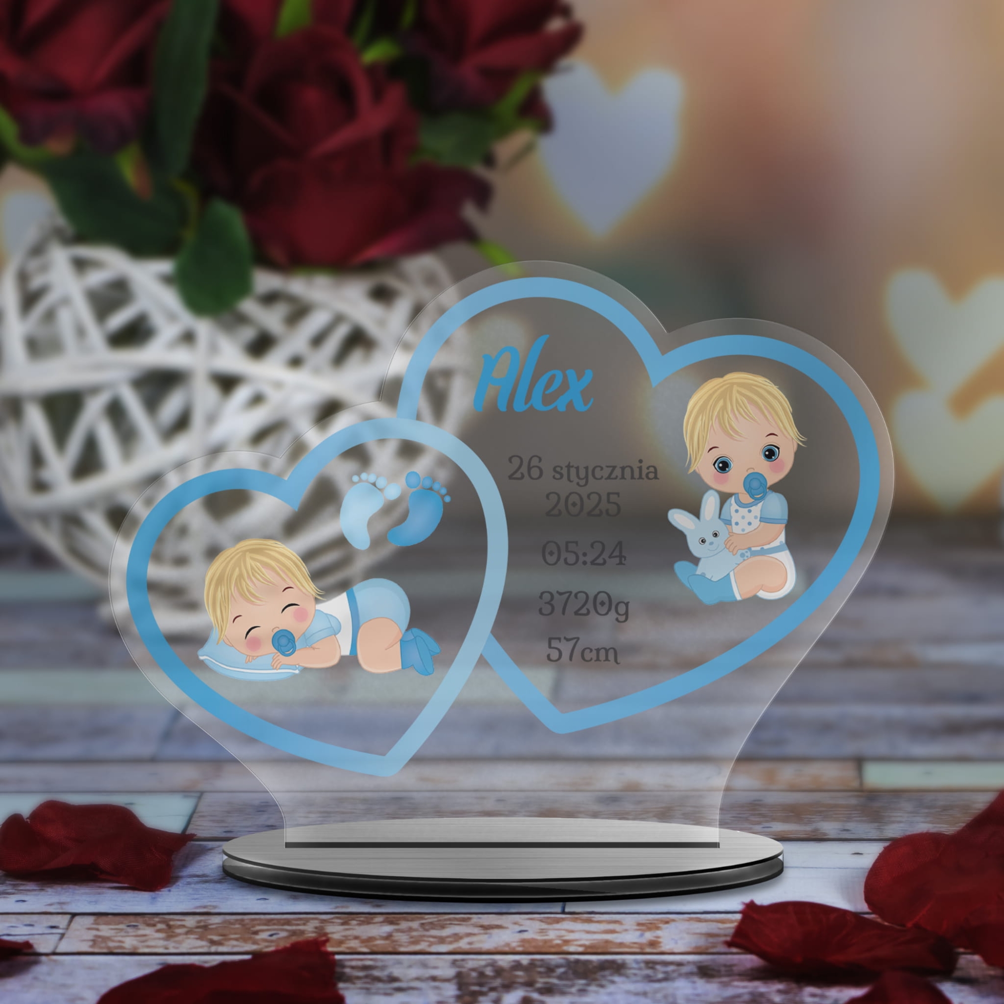 Statuetka akrylowa to piękna ozdoba do pokoju dziecięcego. Nasza statuetka jest niezwykła bo kryje w sobie wszystkie najważniejsze informacje z dnia narodzin dziecka. Na statuetce w zależności od motywu umieścimy np. imię dziecka, datę i godzinę narodzin, wagę i wzrost, imiona rodziców. Taka metryczka będzie szczególna zarówno dla dziecka jak i dla opiekunów. Statuetka w kształcie dwóch serc wykonana jest ze szkła akrylowego, natomiast nadruk wykonany jest za pomocą techniki cyfrowej najwyższej jakości. Metryczka dla dziecka to świetny pomysł na prezent dla dziewczynki i pomysł na prezent dla chłopca. Do wyboru kilka pięknych motywów graficznych, które z pewnością przypadną do gustu każdemu dziecku. Świetnie sprawdzi się jako prezent na urodziny dla dziecka lub prezent pod choinkę dla dziecka.