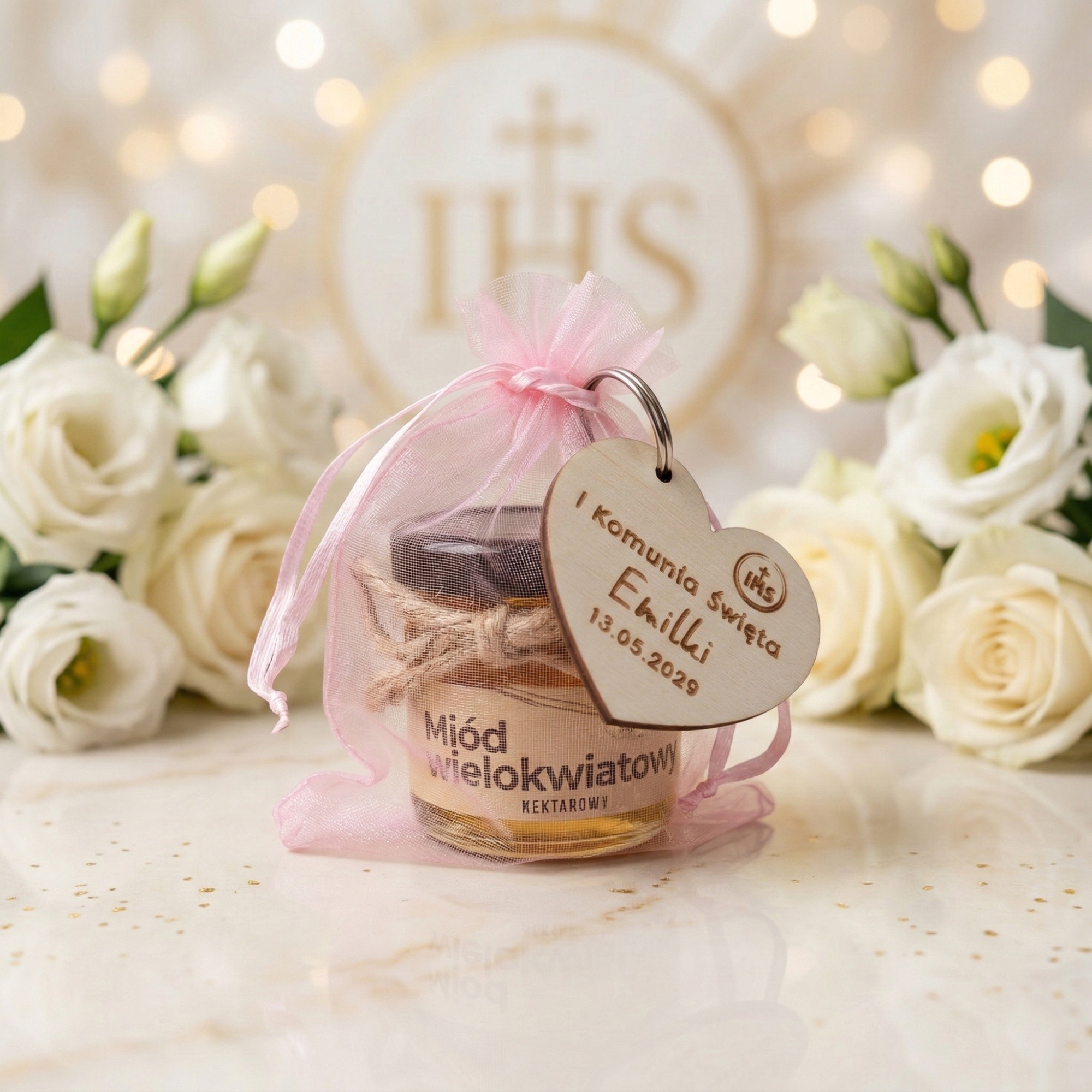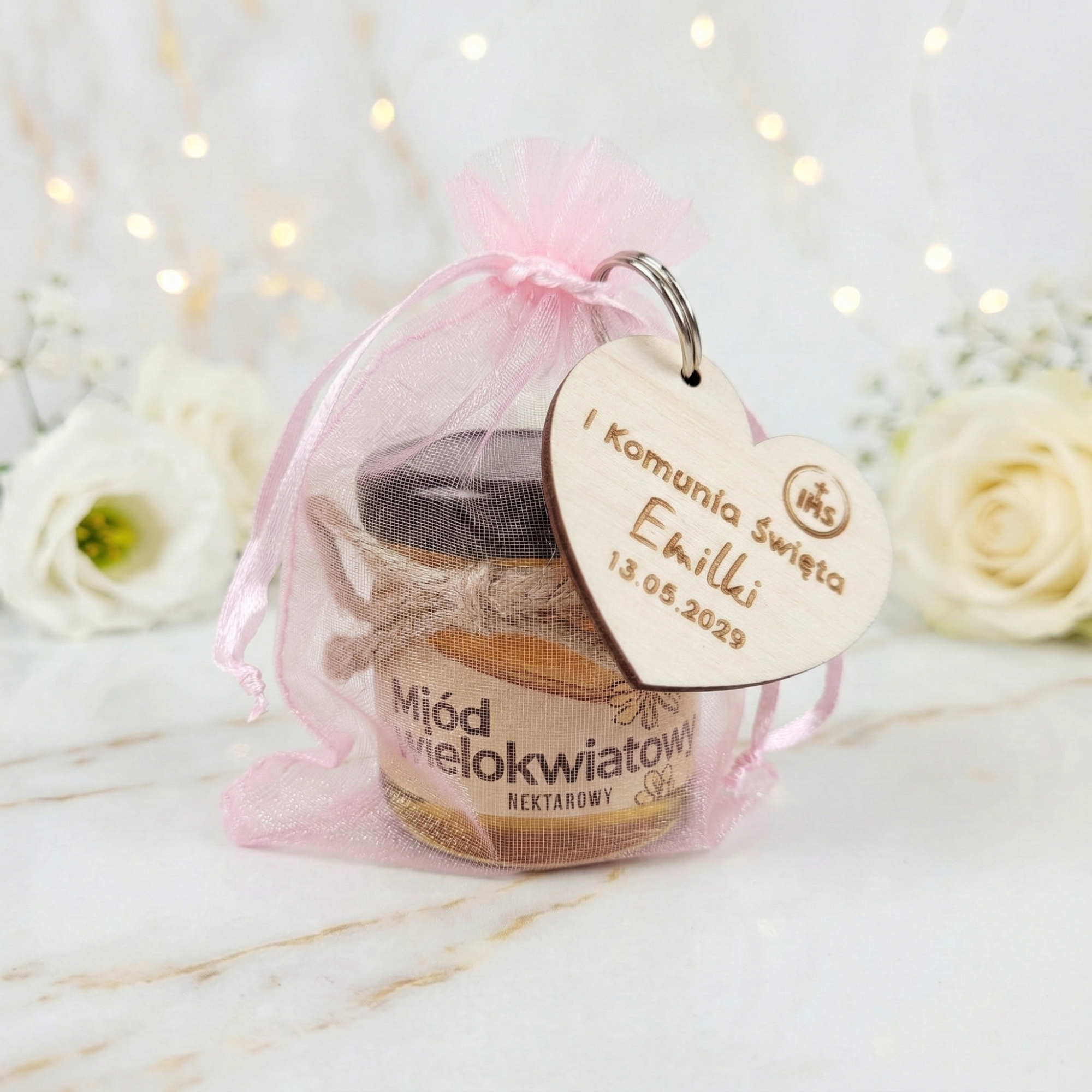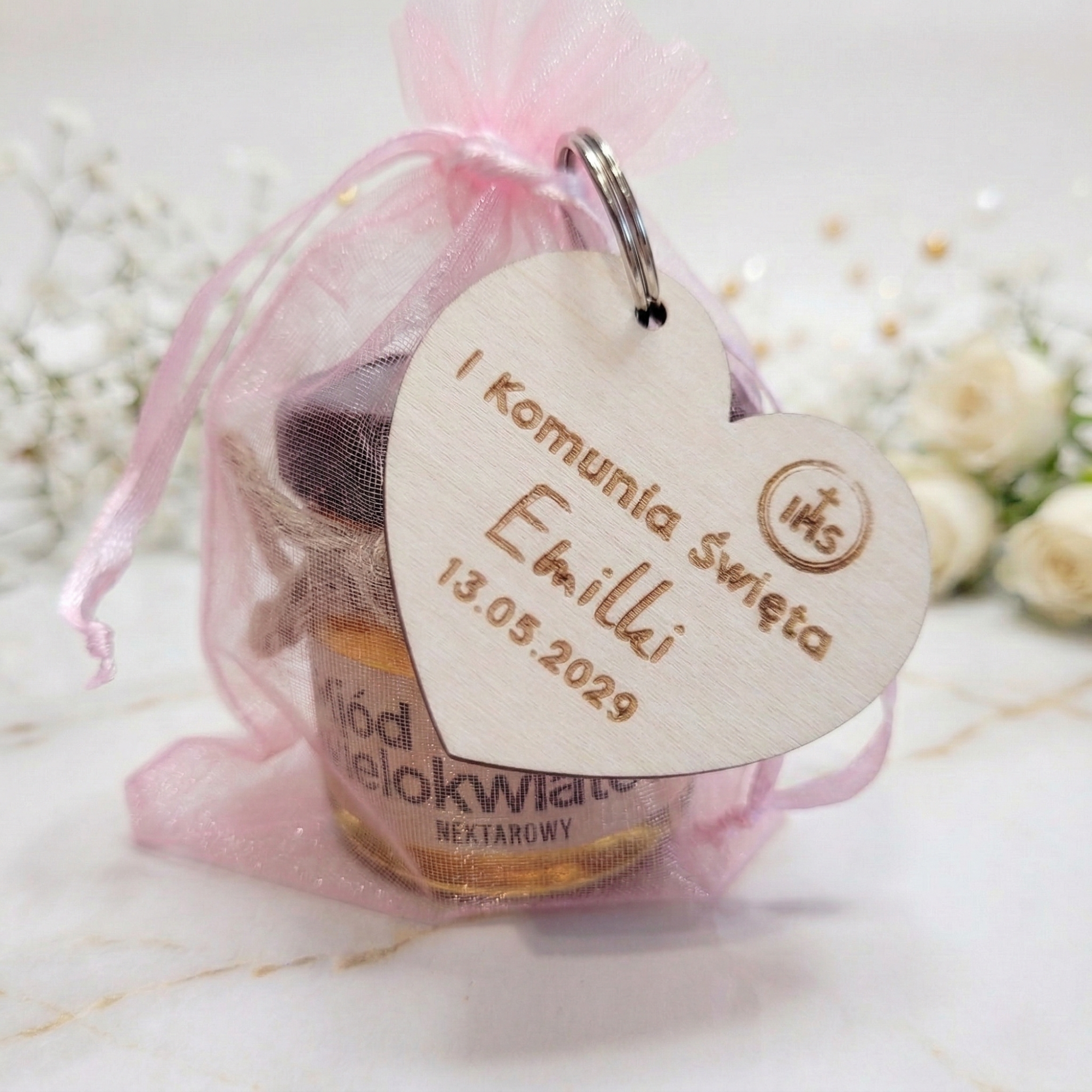 Miodzik z breloczkiem serce – wyjątkowe podziękowania na komunię