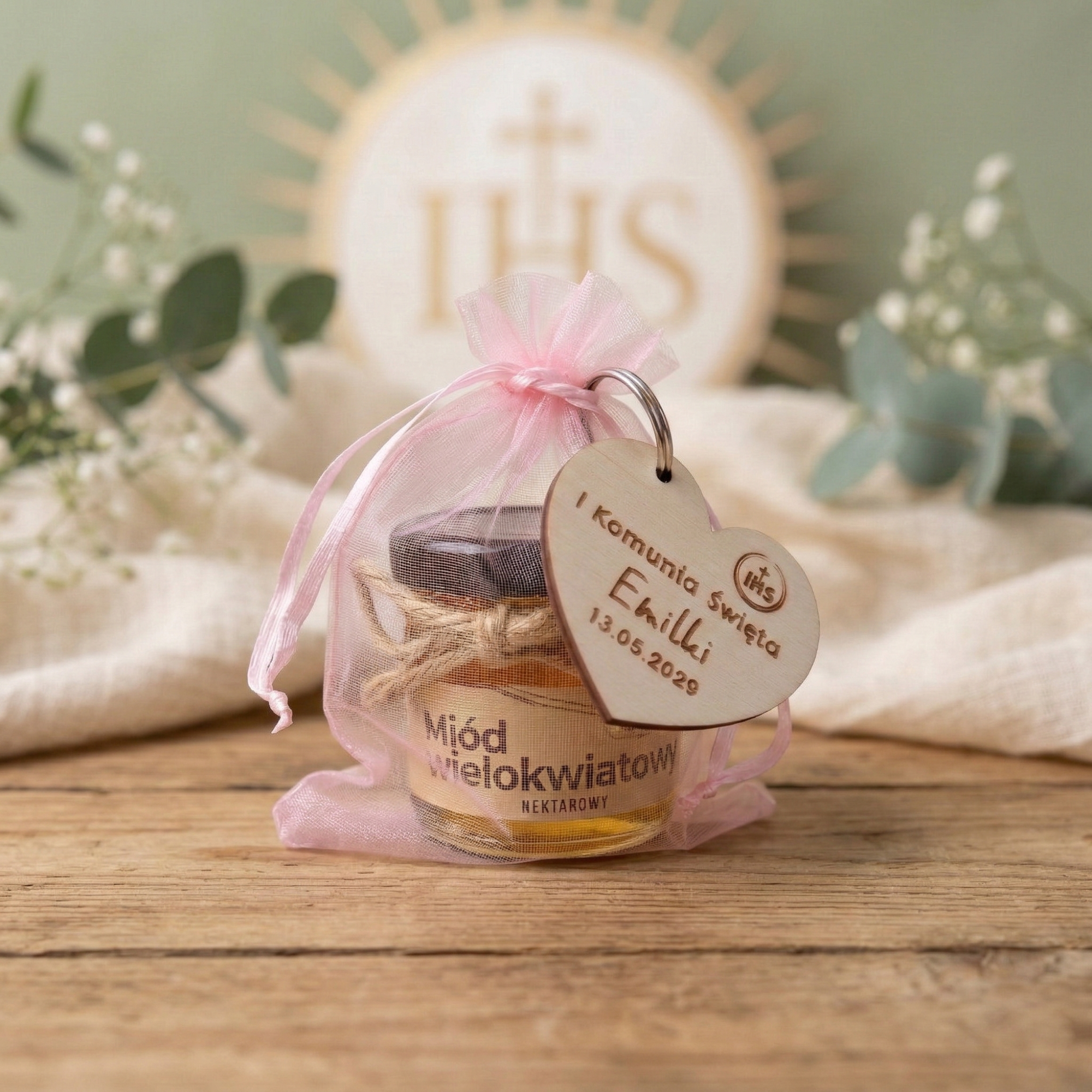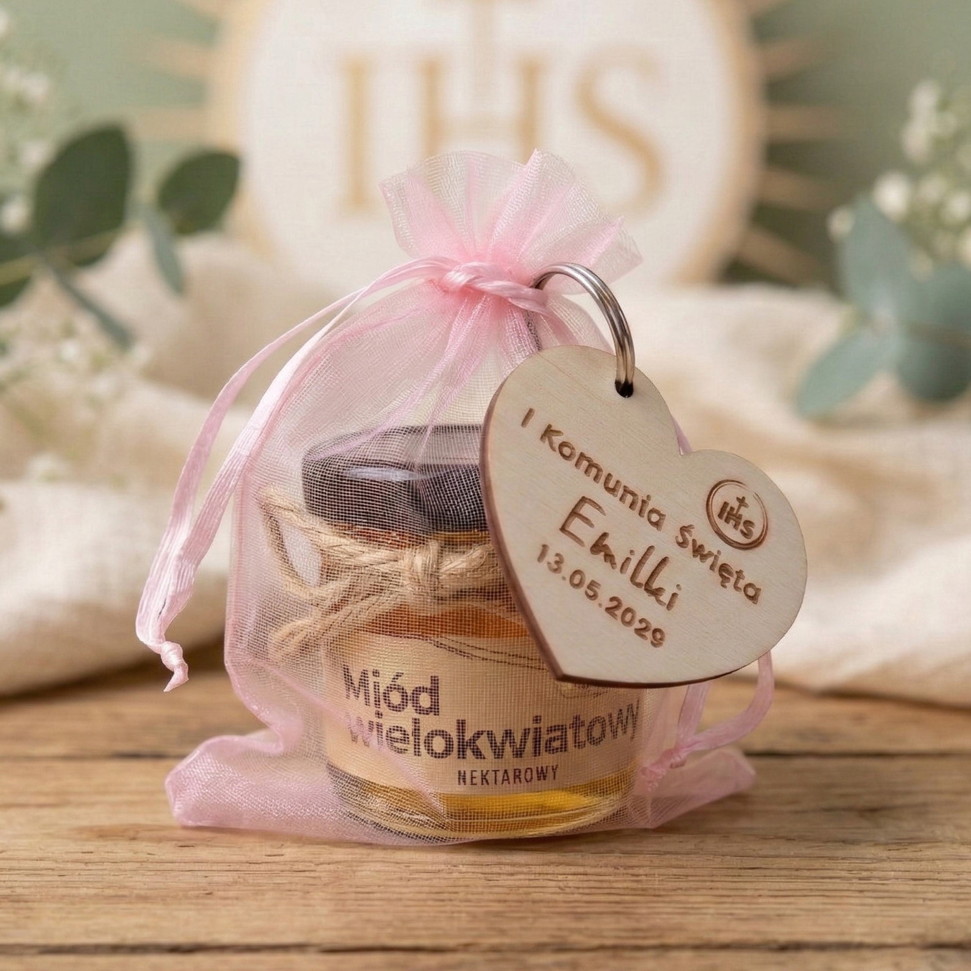 Słodki upominek dla gości na Komunię drewniany breloczek z grawerem w zestawie z miodem