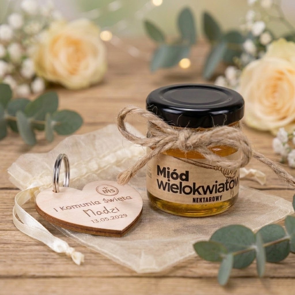Podaruj coś więcej niż zwykły upominek – podaruj miodzik i breloczek serce, które połączą słodką przyjemność z trwałą pamiątką. Niech naturalny miód i personalizowany breloczek przypominają gościom o wyjątkowej uroczystości Pierwszej Komunii Świętej i Twojej wdzięczności za ich obecność.