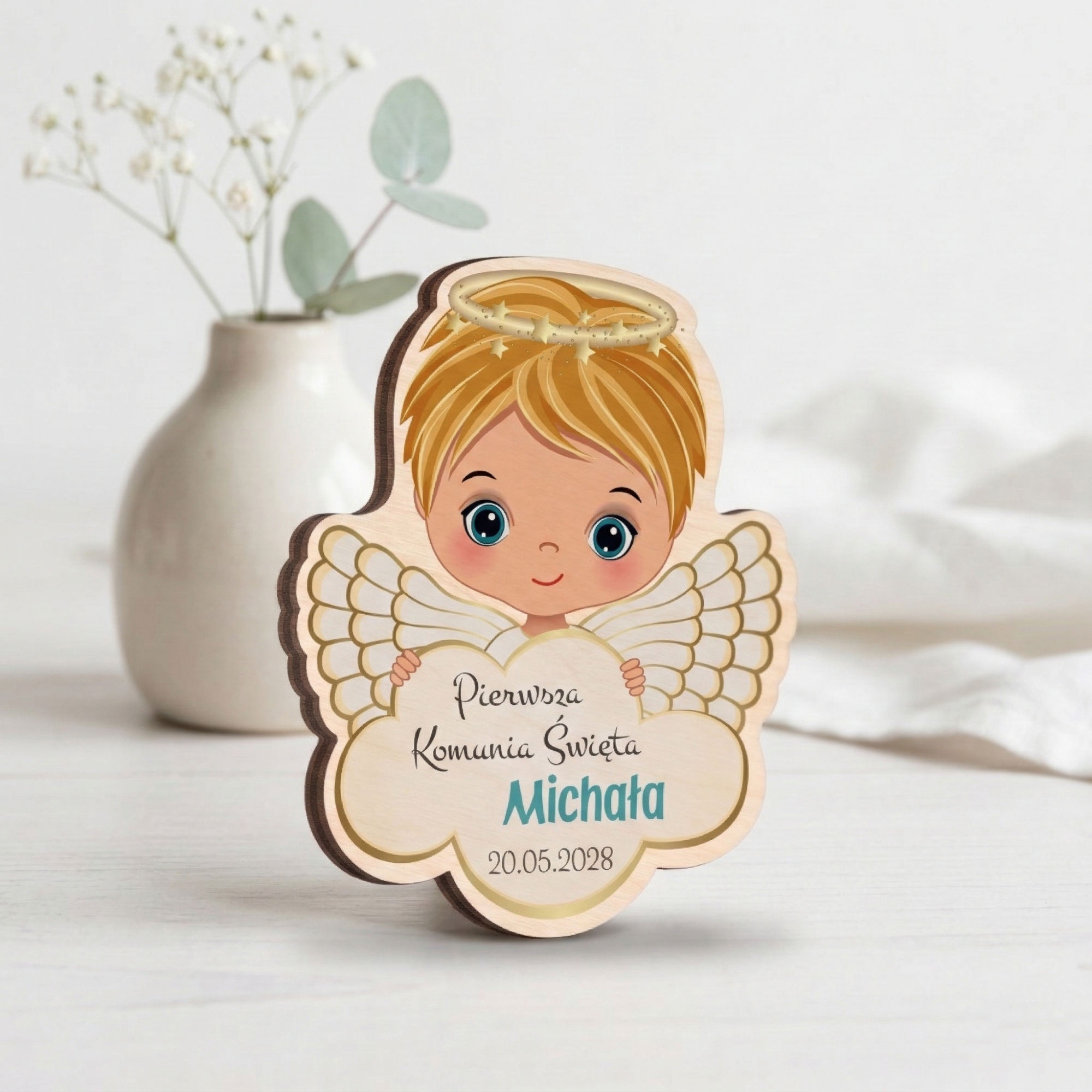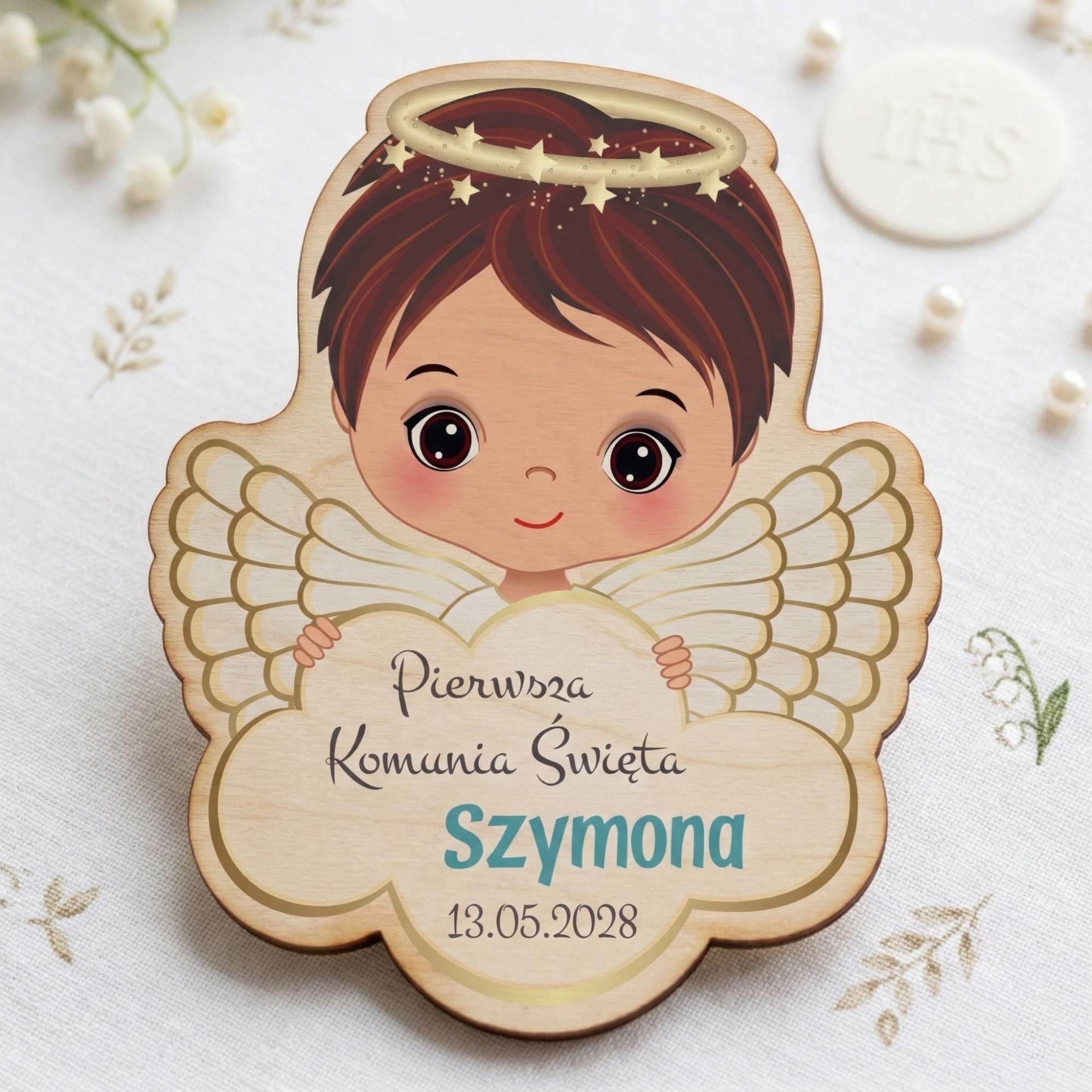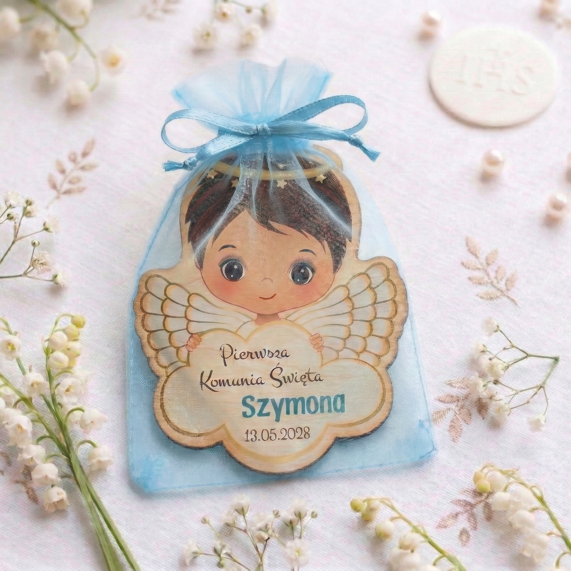 A cóż to za uśmiechnięty młody katolik spogląda na bliskich prosto zza chmurki? Tak, to dumny parafianin, który właśnie przyjął Sakrament Pierwszej Komunii Świętej. Magnes na lodówkę komunia to uroczy gest wdzięczności dla rodziców chrzestnych, dziadków i innych członków rodziny, którzy zaszczycili dziecko swoją obecnością w tym jakże ważnym dla każdego katolika dniu. Aniołki podziękowania komunijne to personalizowany prezent z dwoma motywami do wyboru – dla chłopca lub dziewczynki. Podaruj magnes na lodówkę komunia wszystkim zaproszonym gościom. Dzięki drobnym gestom sprawisz, że każdy z nich poczuje się wyróżniony i wyjątkowy.