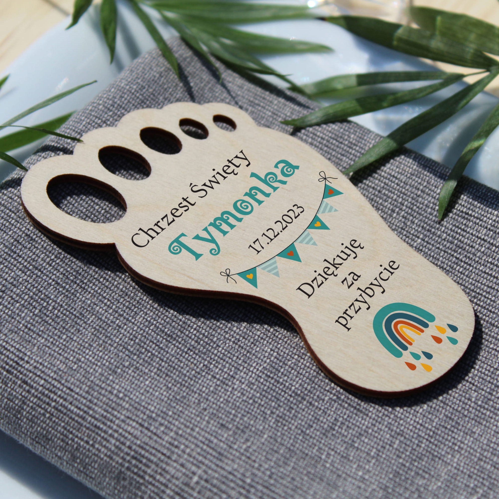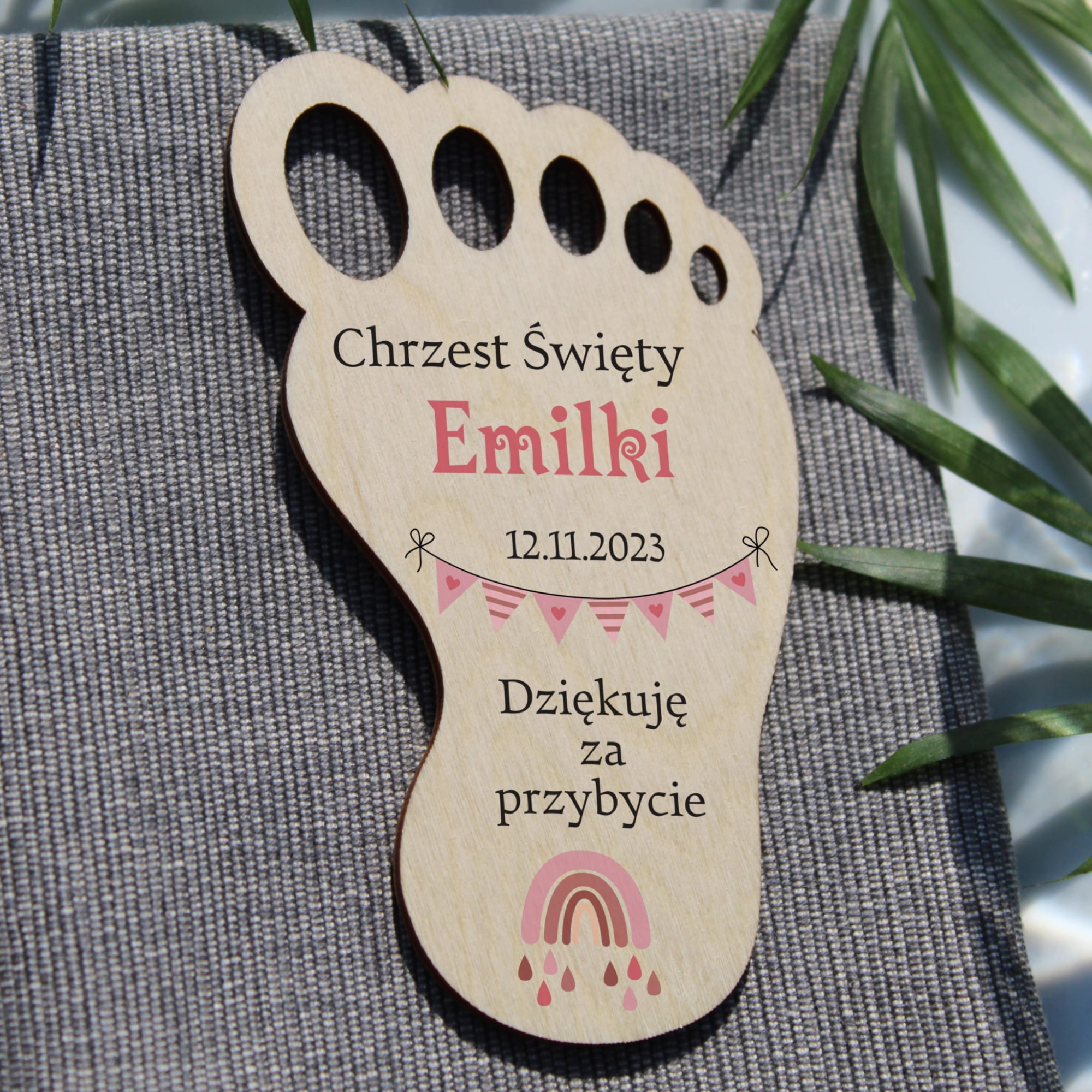 Wyraź wdzięczność swoim gościom za obecność podczas Chrztu Świętego Waszego synka w wyjątkowy sposób. Wybierz nasz magnes stópka od chłopca z personalizacją w postaci imienia dziecka i daty Chrztu. Stópka z kolorowym nadrukiem w niebieskich tonach idealnie podkreśli płeć malucha przyjmującego sakrament Chrztu Świętego. Jednocześnie symbolizować może zarówno dziecko jak i jego przyjęcie do wspólnoty kościoła. Magnes można umieścić na lodówce, lub innym metalowym przedmiocie, aby codziennie przypominać sobie o tym pięknym dniu i o ludziach, którzy podzielili się nim z Wami.