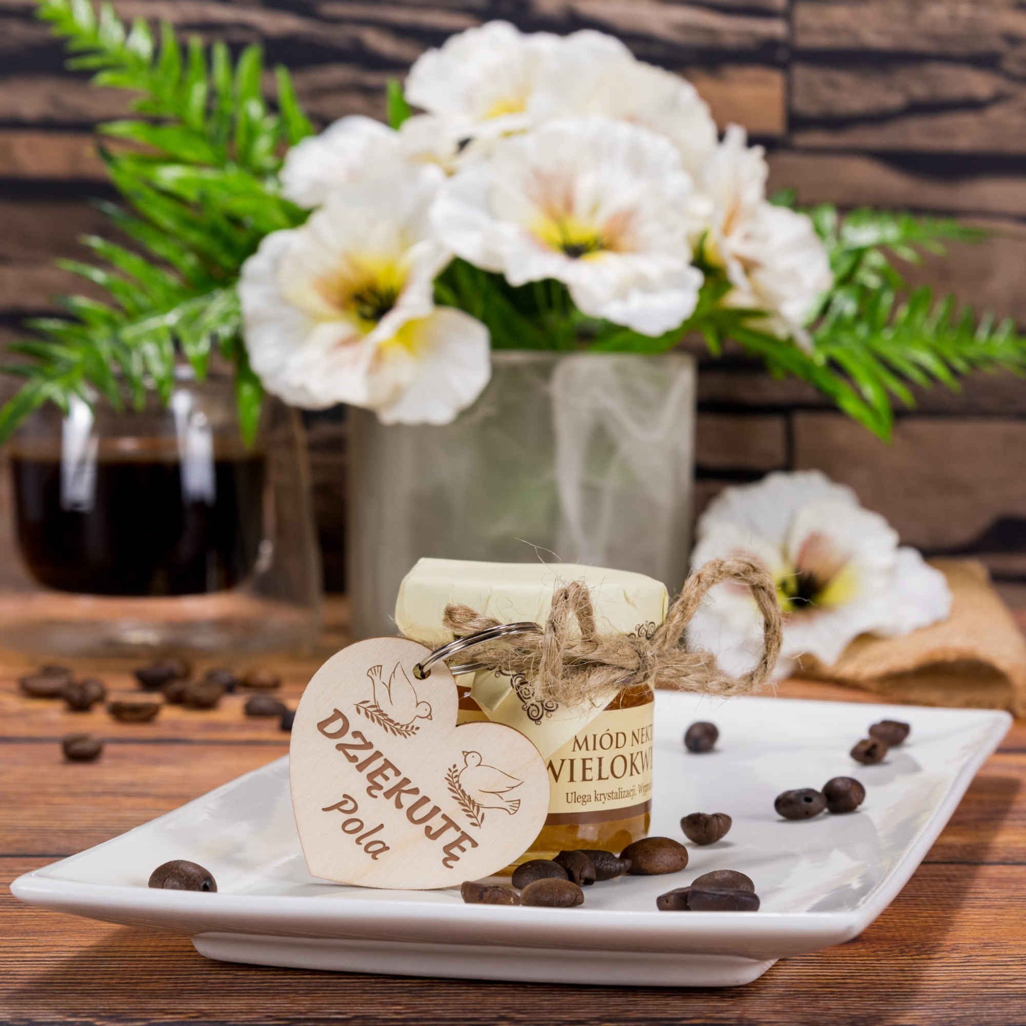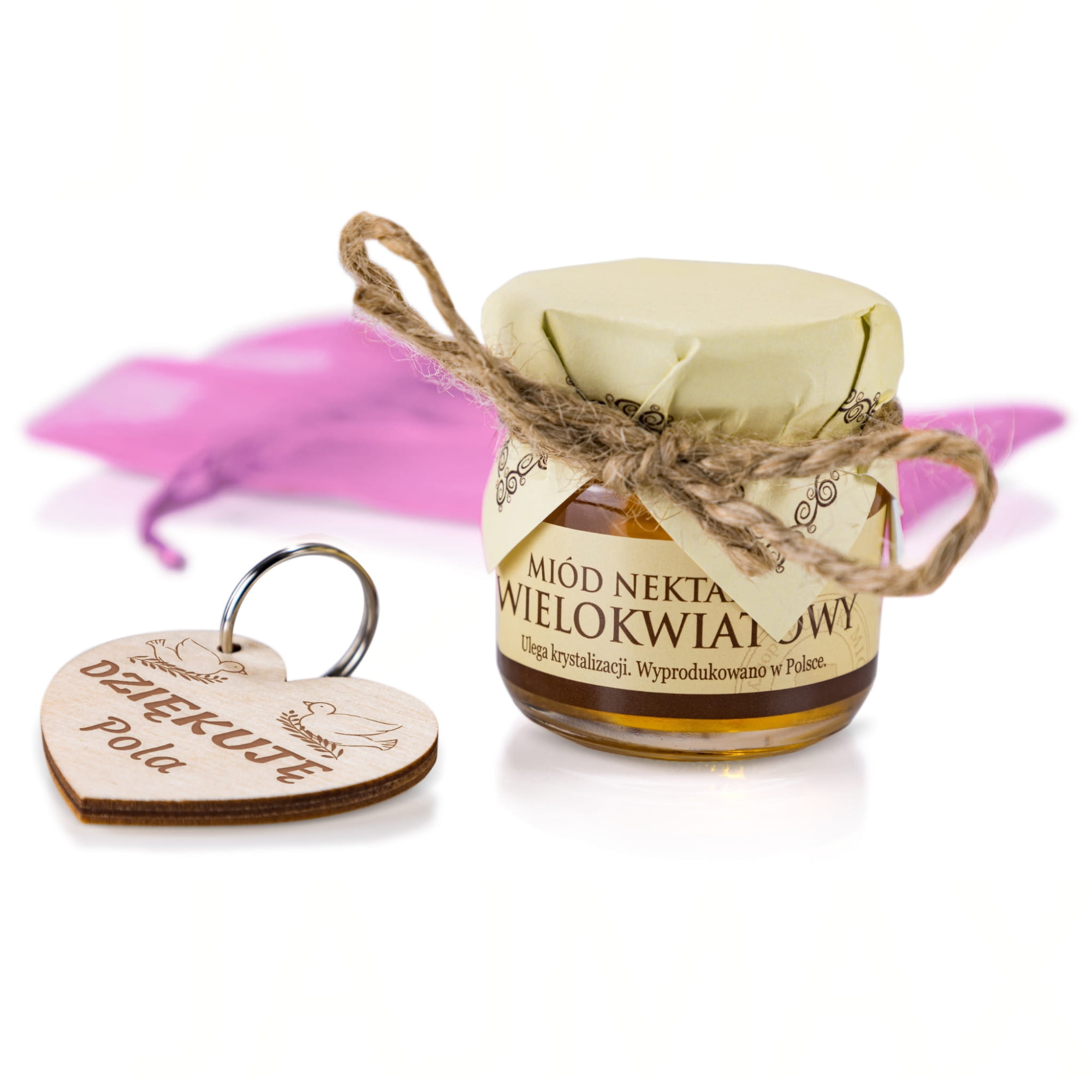 Miód i breloczek z grawerem klasyczne podziękowanie dla gości Komunii