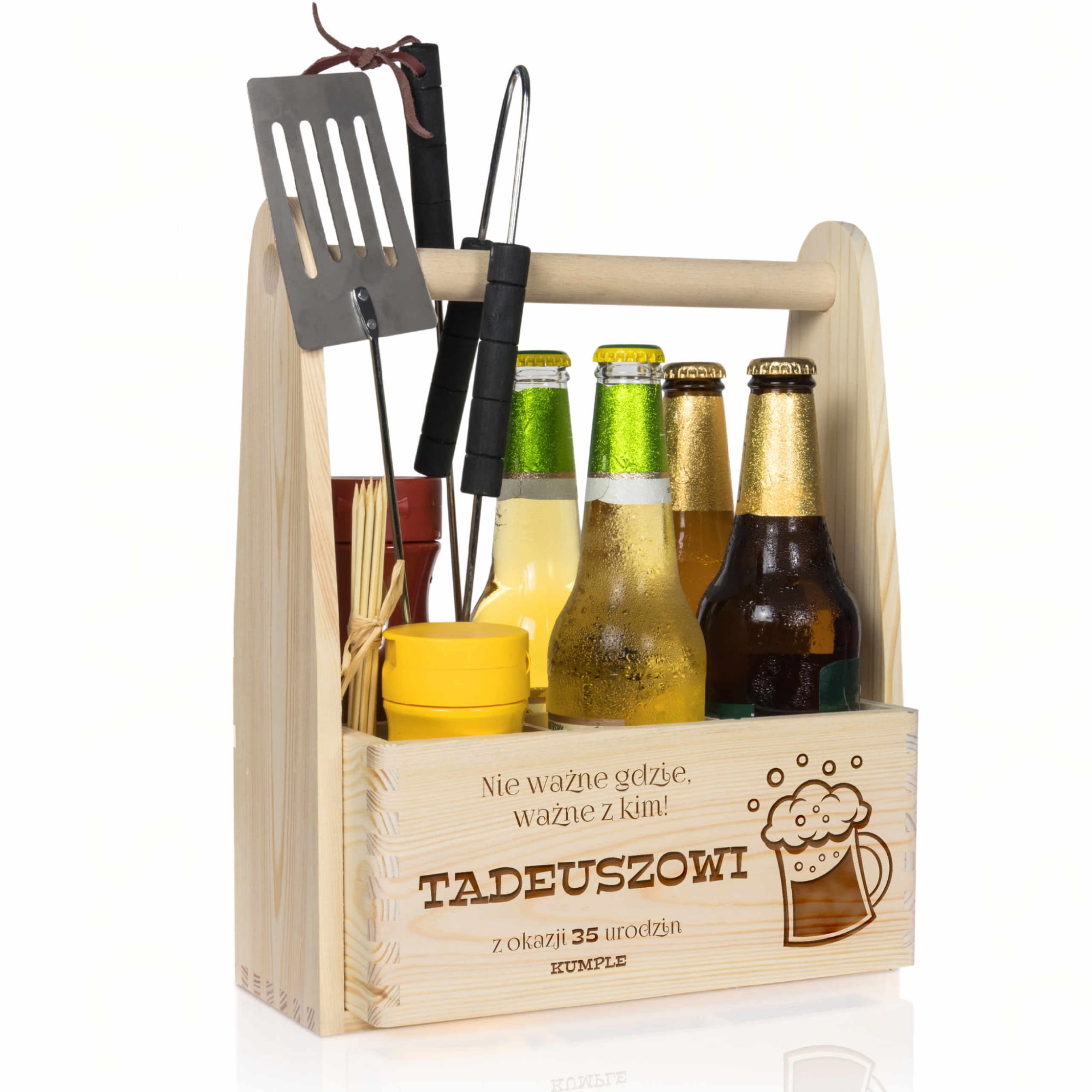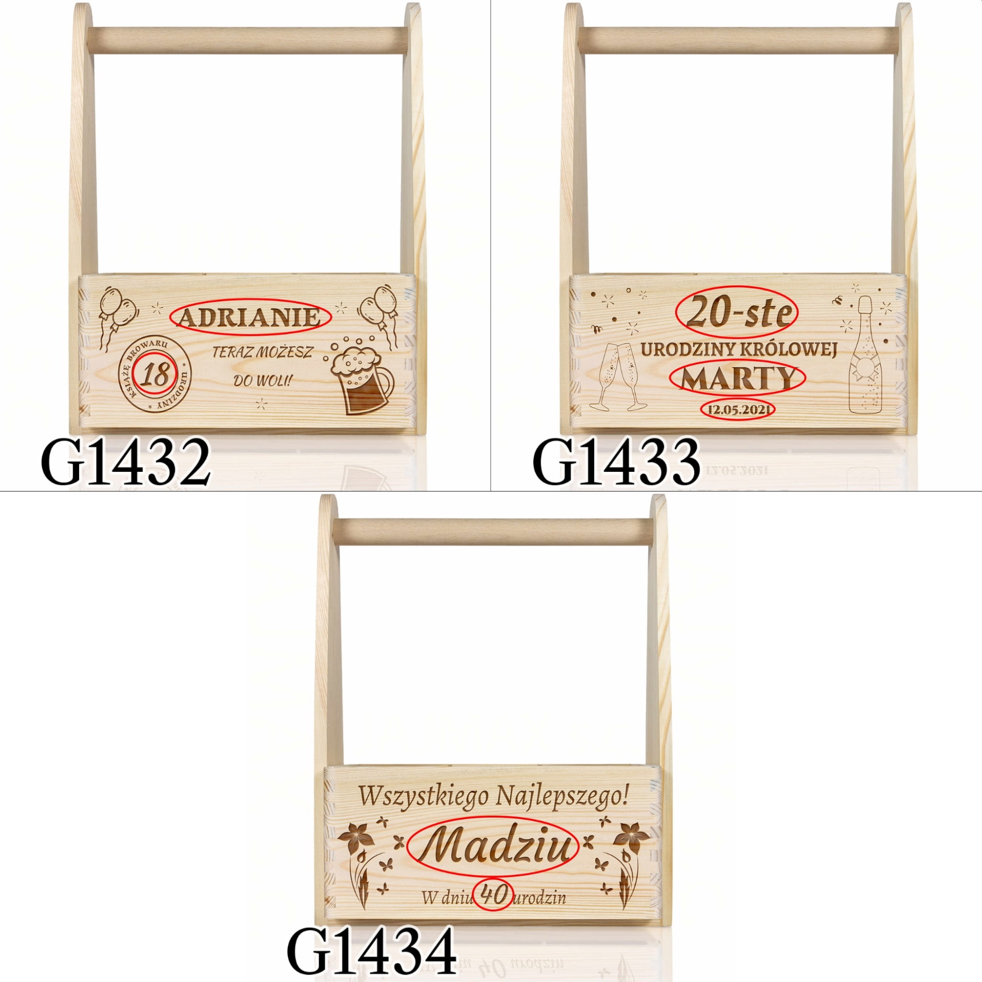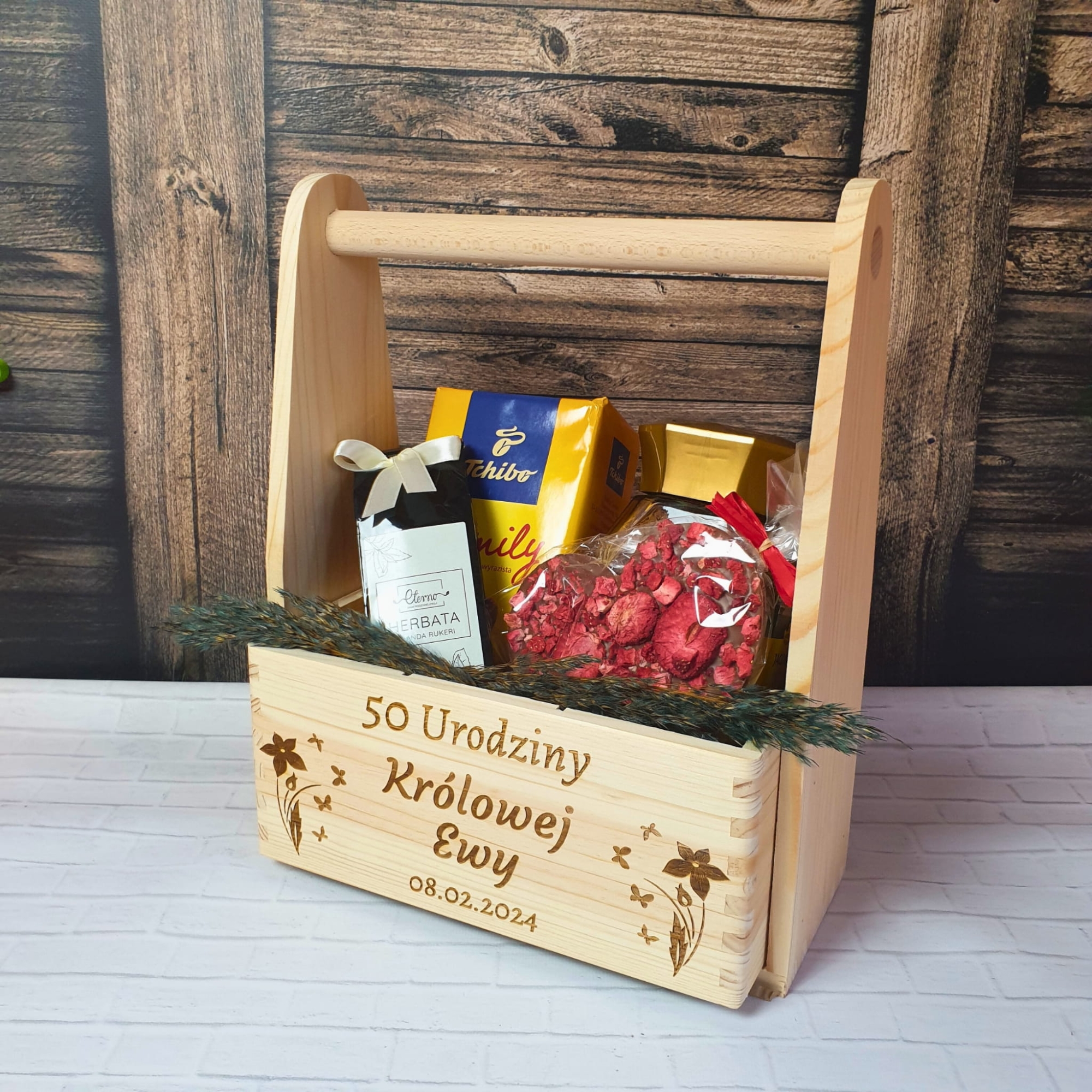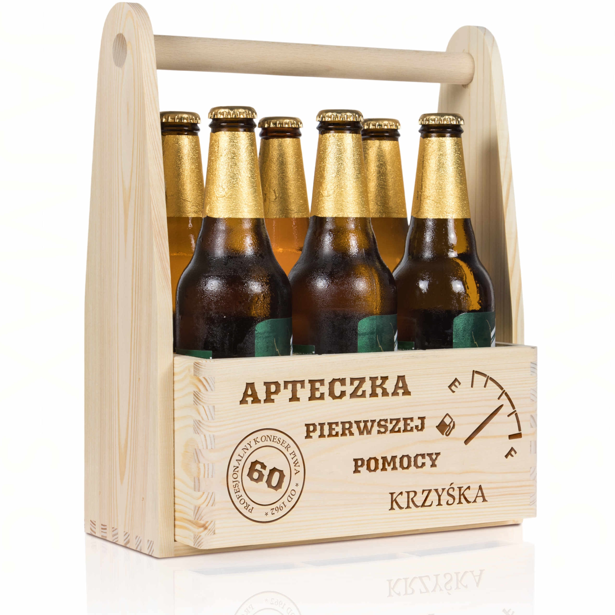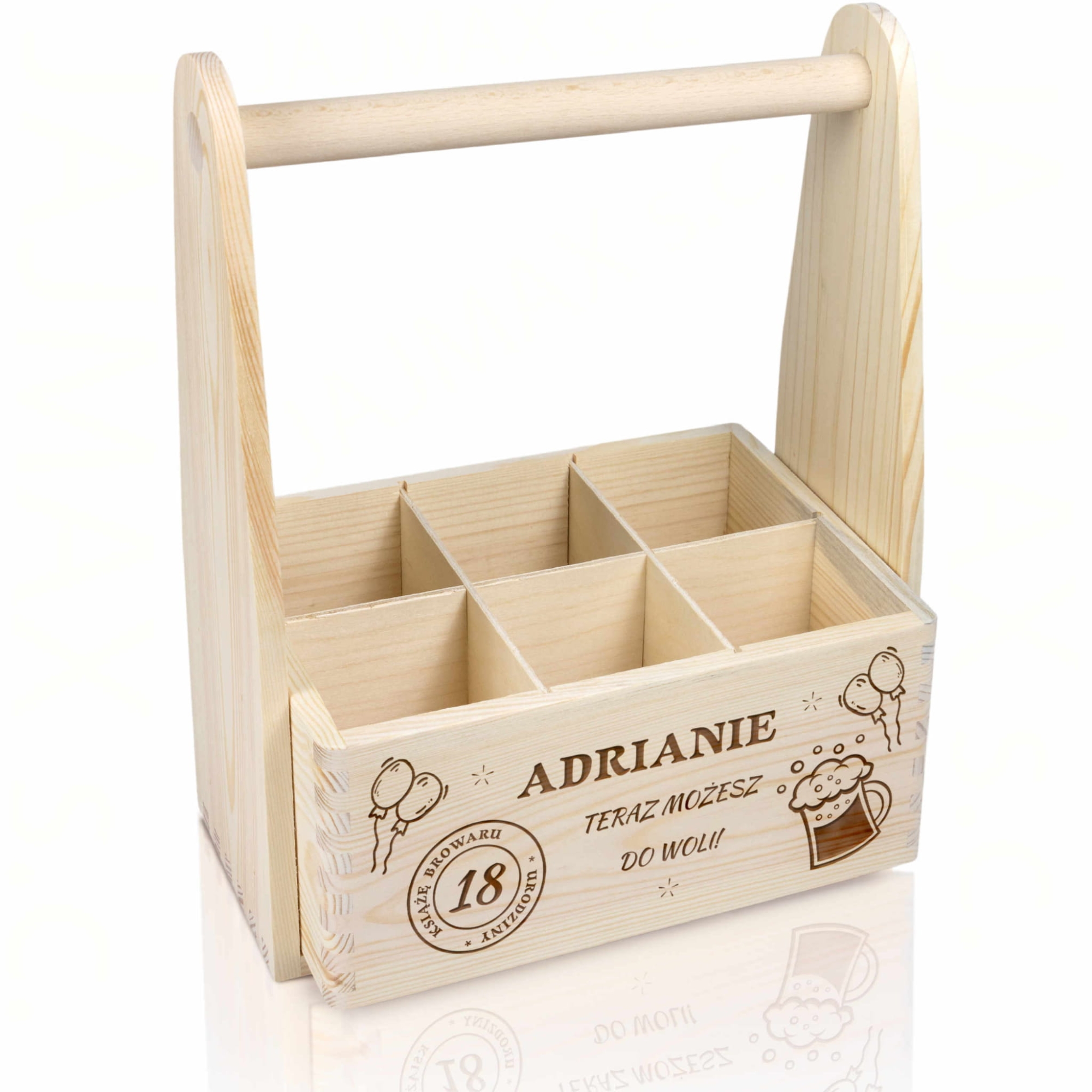 Jeśli szukasz pomysłowego i wyjątkowego upominku na urodziny lub na imieniny mamy dla Ciebie prezent idealny. Drewniane nosidło to świetny pomysł na prezent dla Niej i pomysł na prezent dla Niego. Dzięki wyciąganym przegródkom możesz podarować w nim nie tylko 6 butelek ulubionego trunku, ale także zrobić piękny kosz prezentowy. Dla kobiety świetnie sprawdzi się jako doniczka na kwiaty lub kosz na np. kawę, czekoladę, wino. Dla mężczyzny sprawdzi się jako skrzynka na narzędzia, nosidło na zestaw grillowy. Nasze nosidło posiada solidną, drewnianą rączkę. Indywidualny grawer wykonujemy na froncie nosidła, do wyboru kilka motywów graficznych dla Niej i dla Niego. To świetna propozycja na prezent na osiemnastkę lub kolejne 30 urodziny, 40 urodziny, 50 urodziny ....