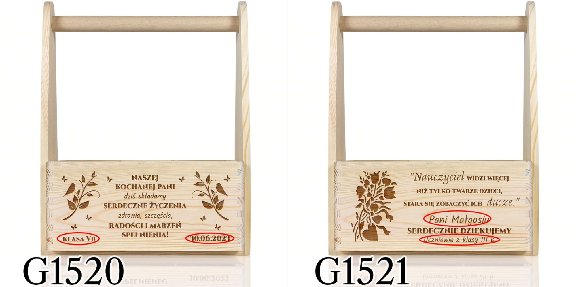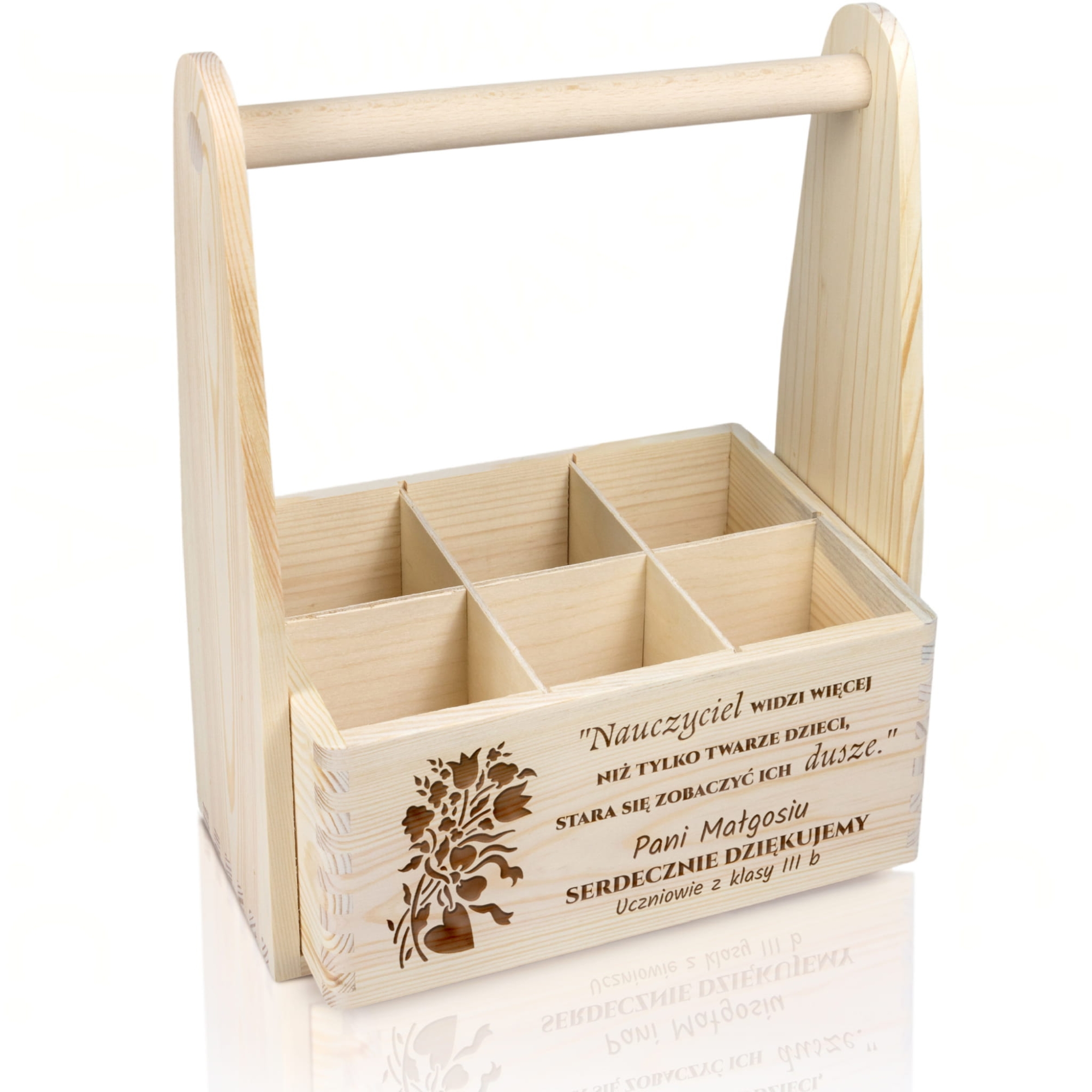 Personalizowane nosidło z Twoją dedykacją to świetny pomysł na prezent dla nauczyciela w ramach podziękowań. Drewniane nosidełko na kwiaty będzie stanowić świetną alternatywę dla tradycyjnych bukietów. Dzięki indywidualnemu grawerowi upominek stanie się wyjątkowy. Naturalne drewniane nosidło może stanowić również świetną bazę do stworzenia kosza prezentów. W ten oryginalny sposób możesz podarować nauczycielowi zarówno kwiaty, jak i wino, kawę, czekoladki ... co tylko zechcesz.