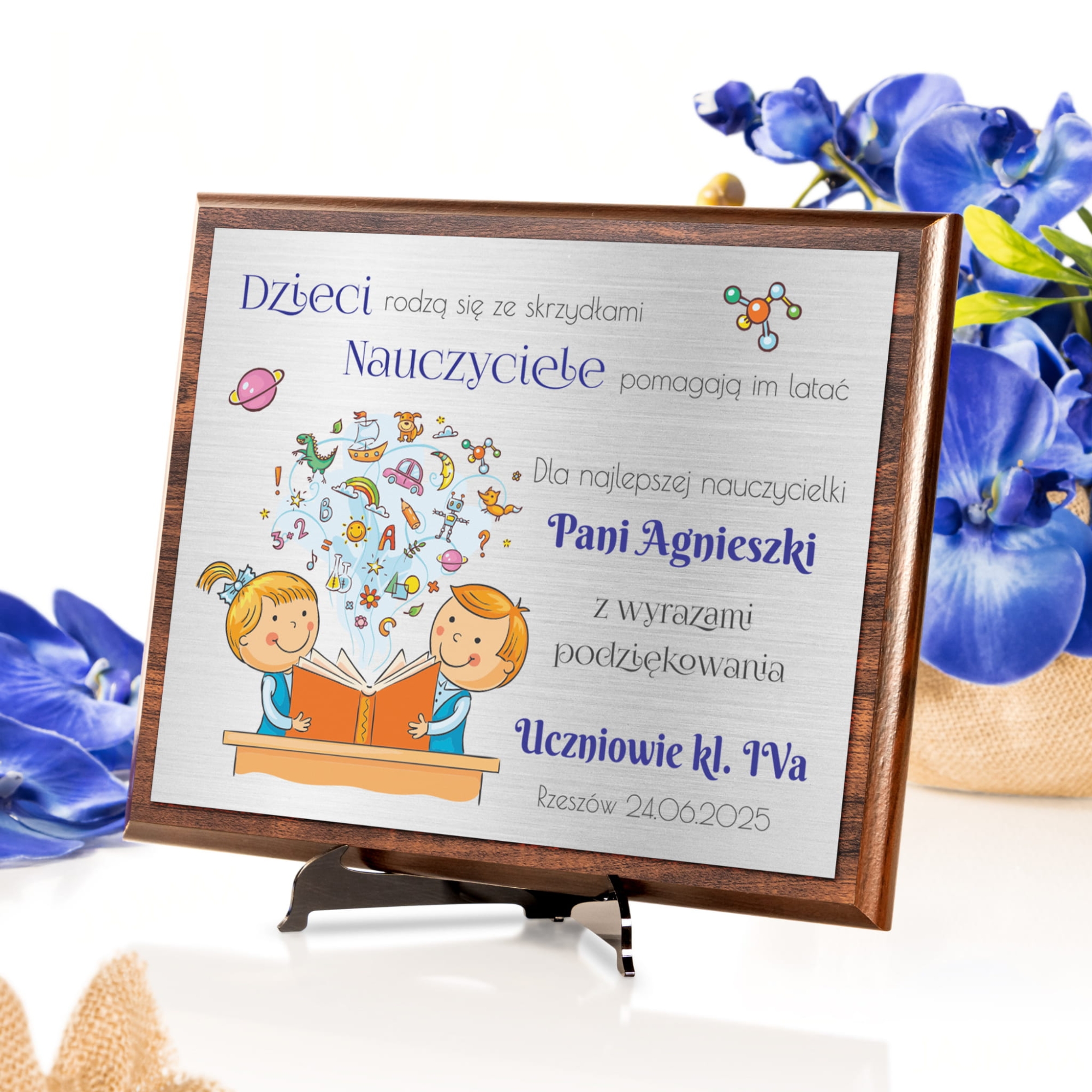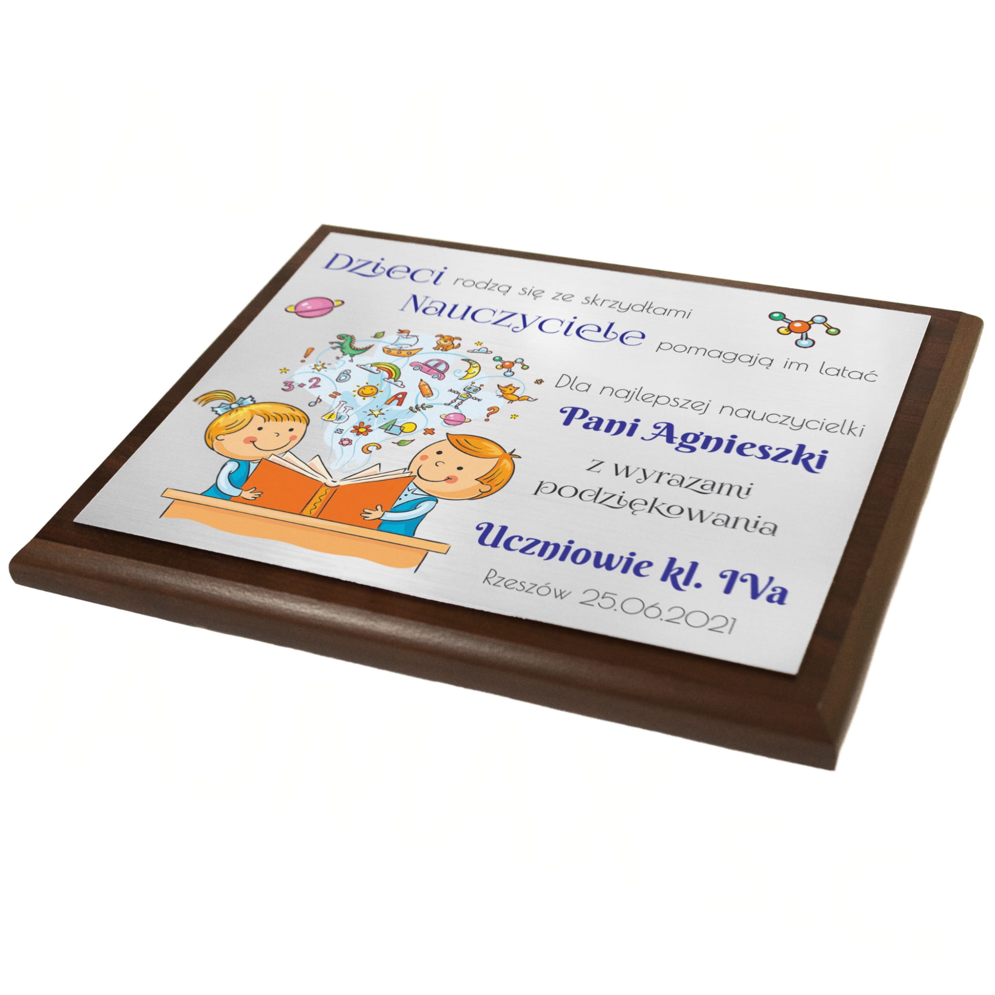 Drewniany obrazek ze srebrnym laminatem upominek dla nauczyciela