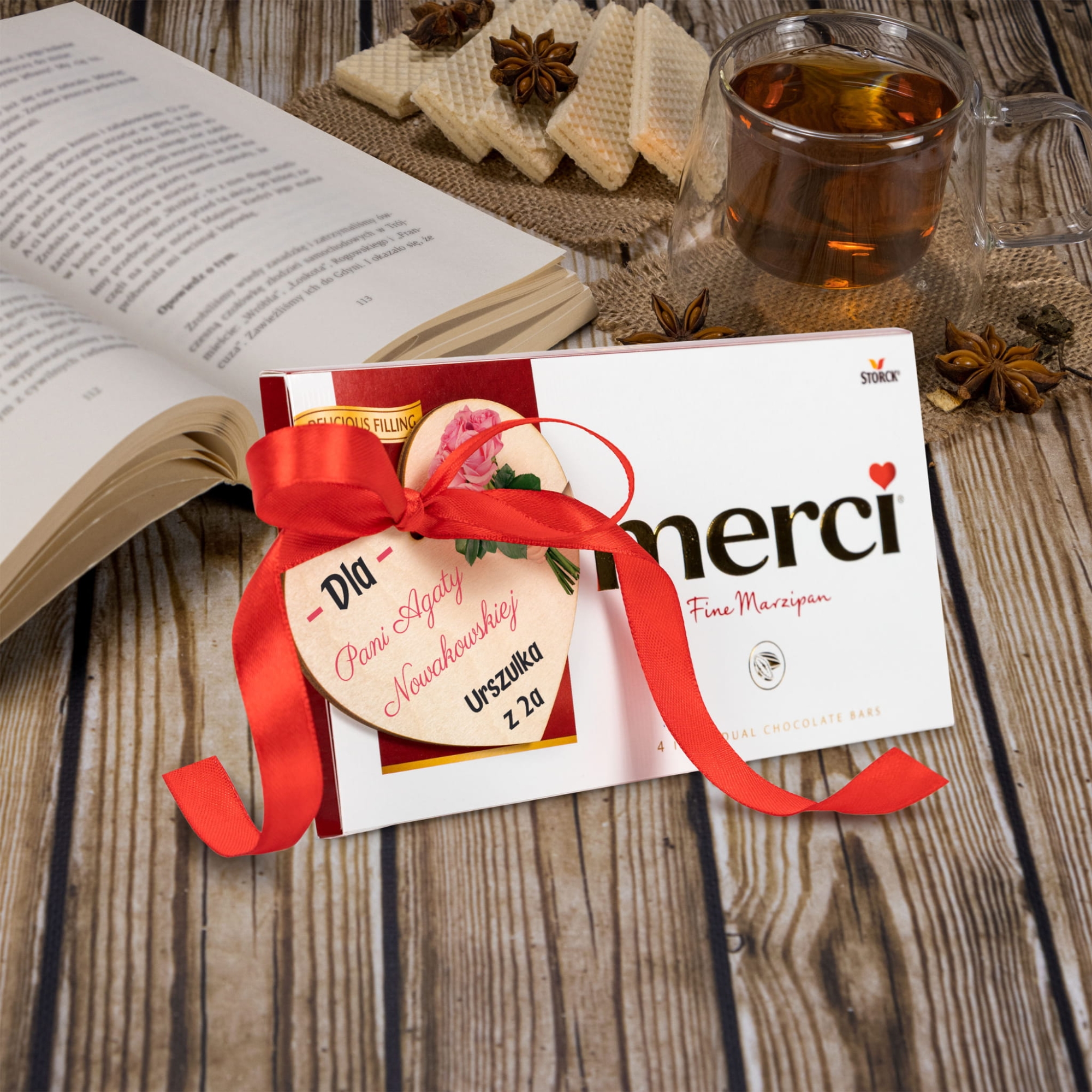 | Zawartość zestawu: | czekolada Merci 100 g, drewniane serce z taśmą dwustronną i wstążką |