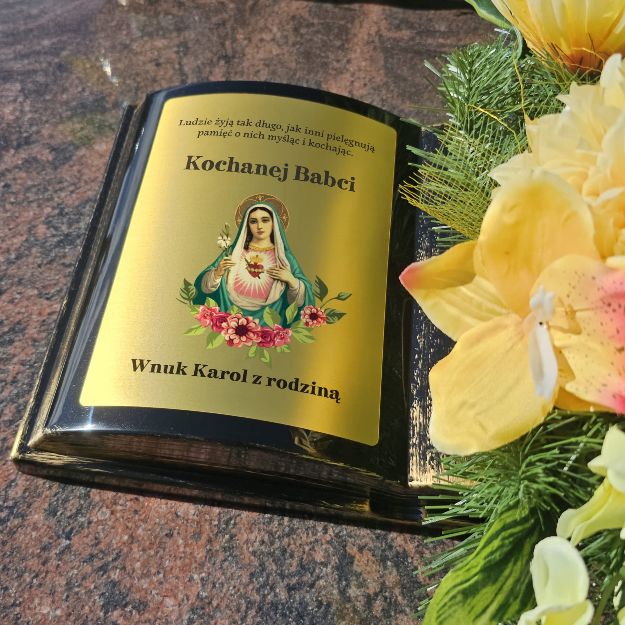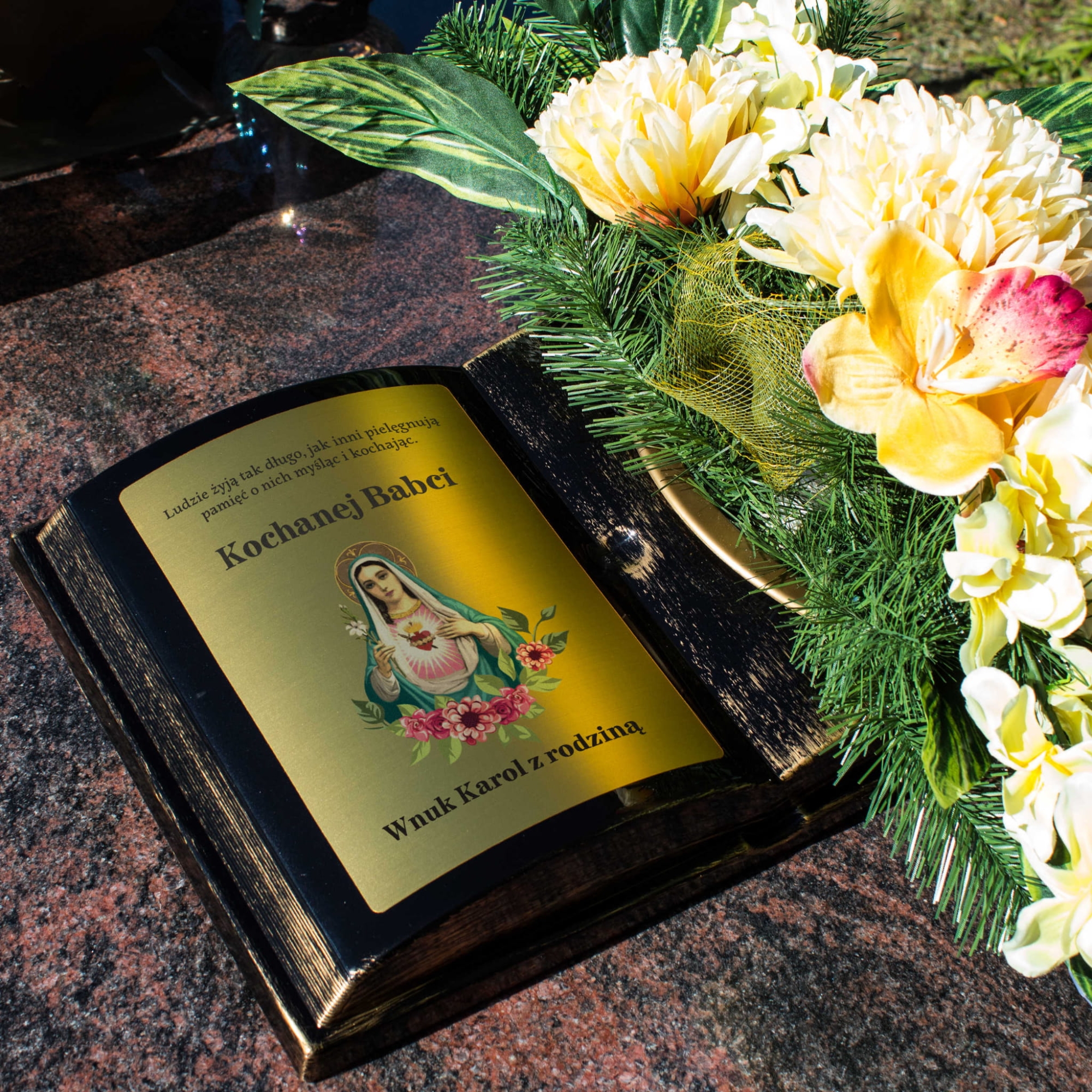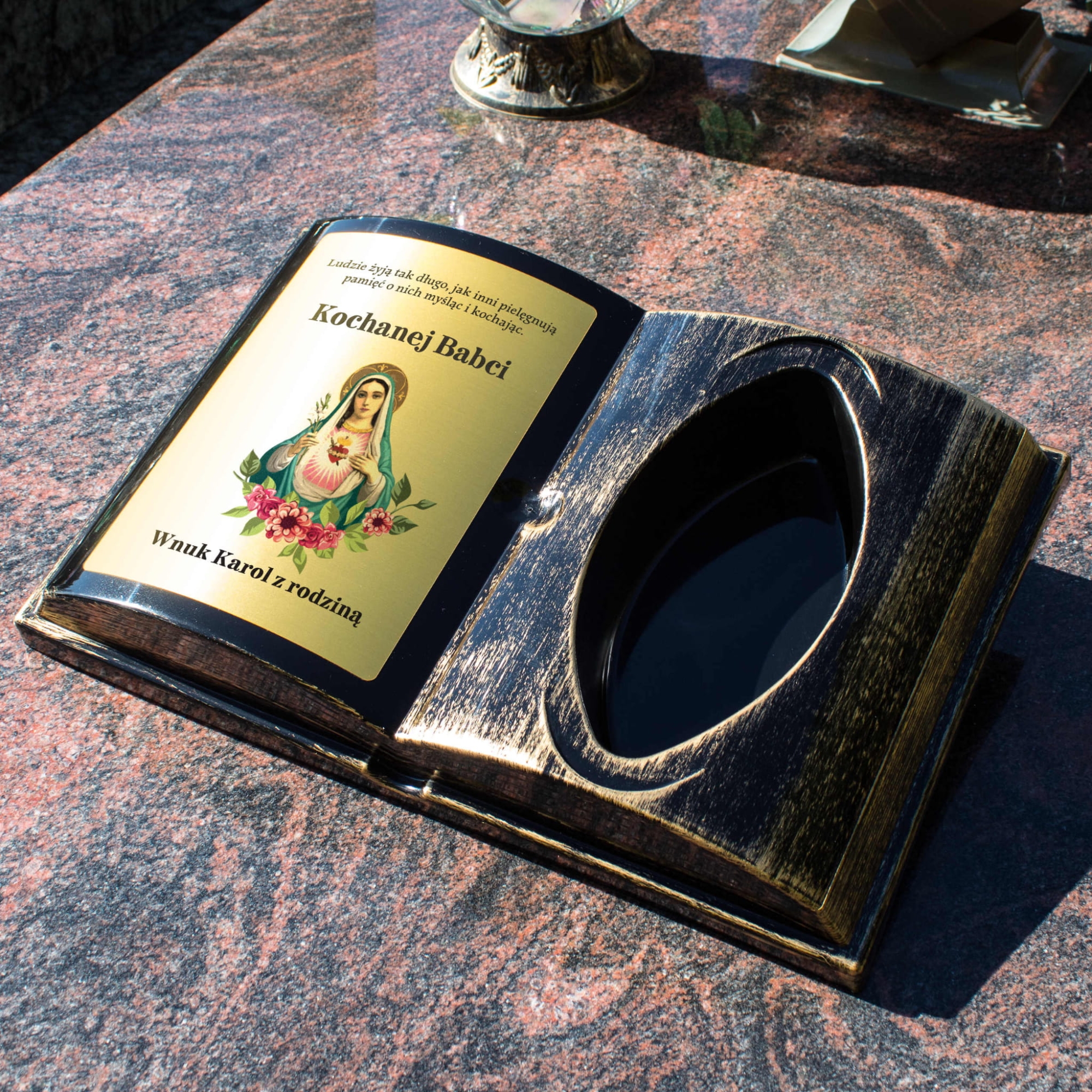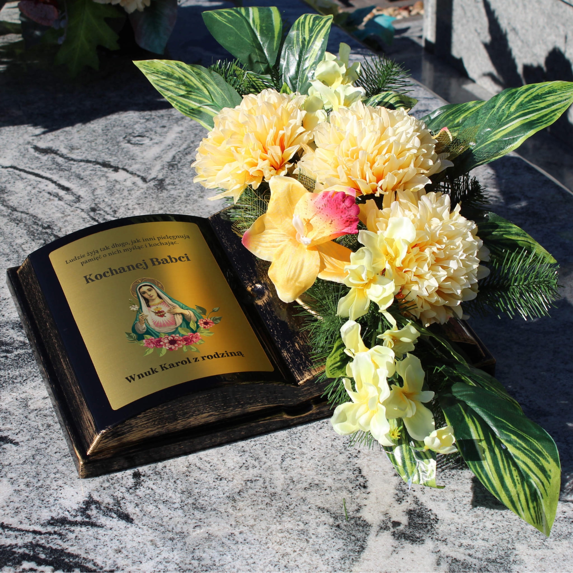 OZDOBA NAGROBNA donica księga z Matką Boską z personalizacją stroik