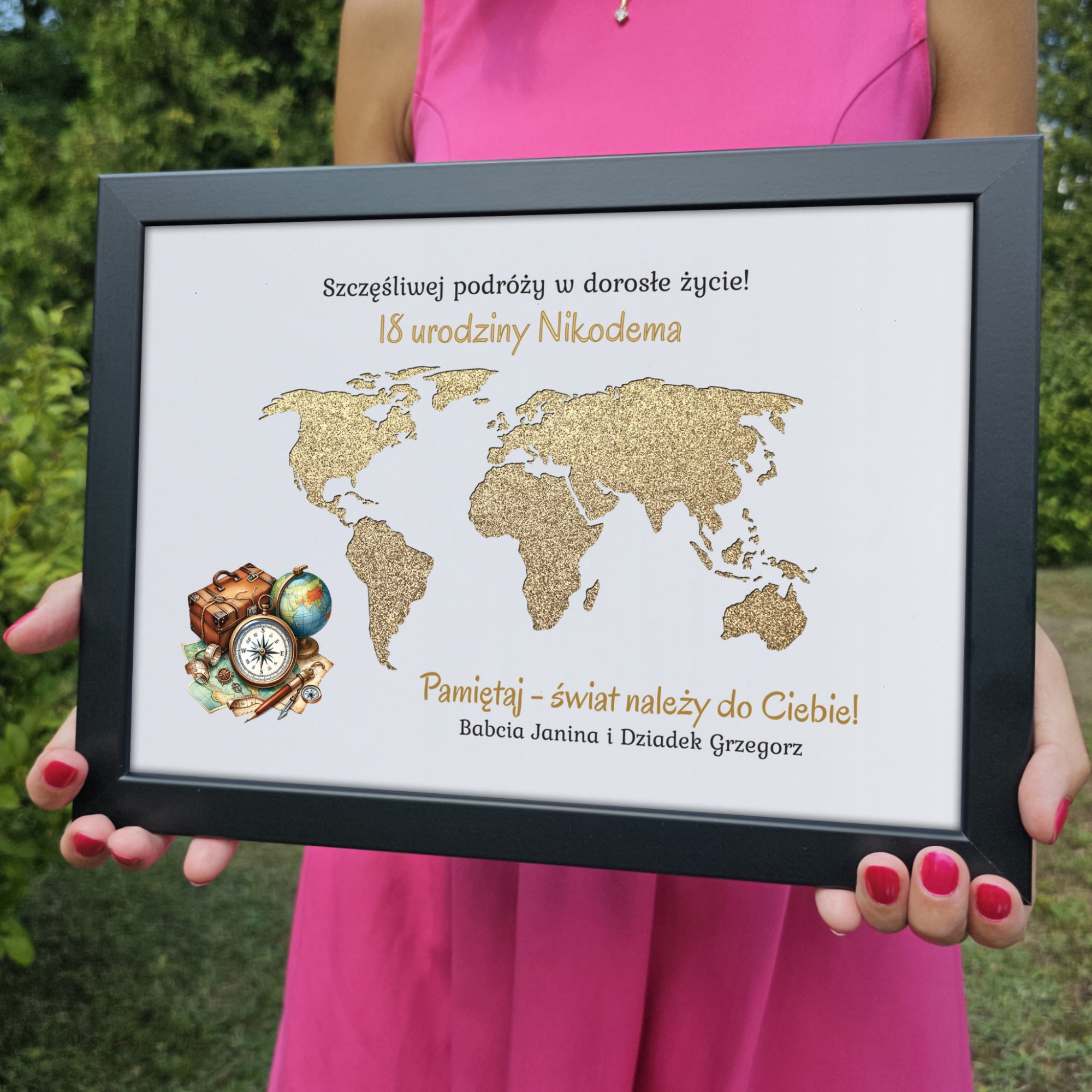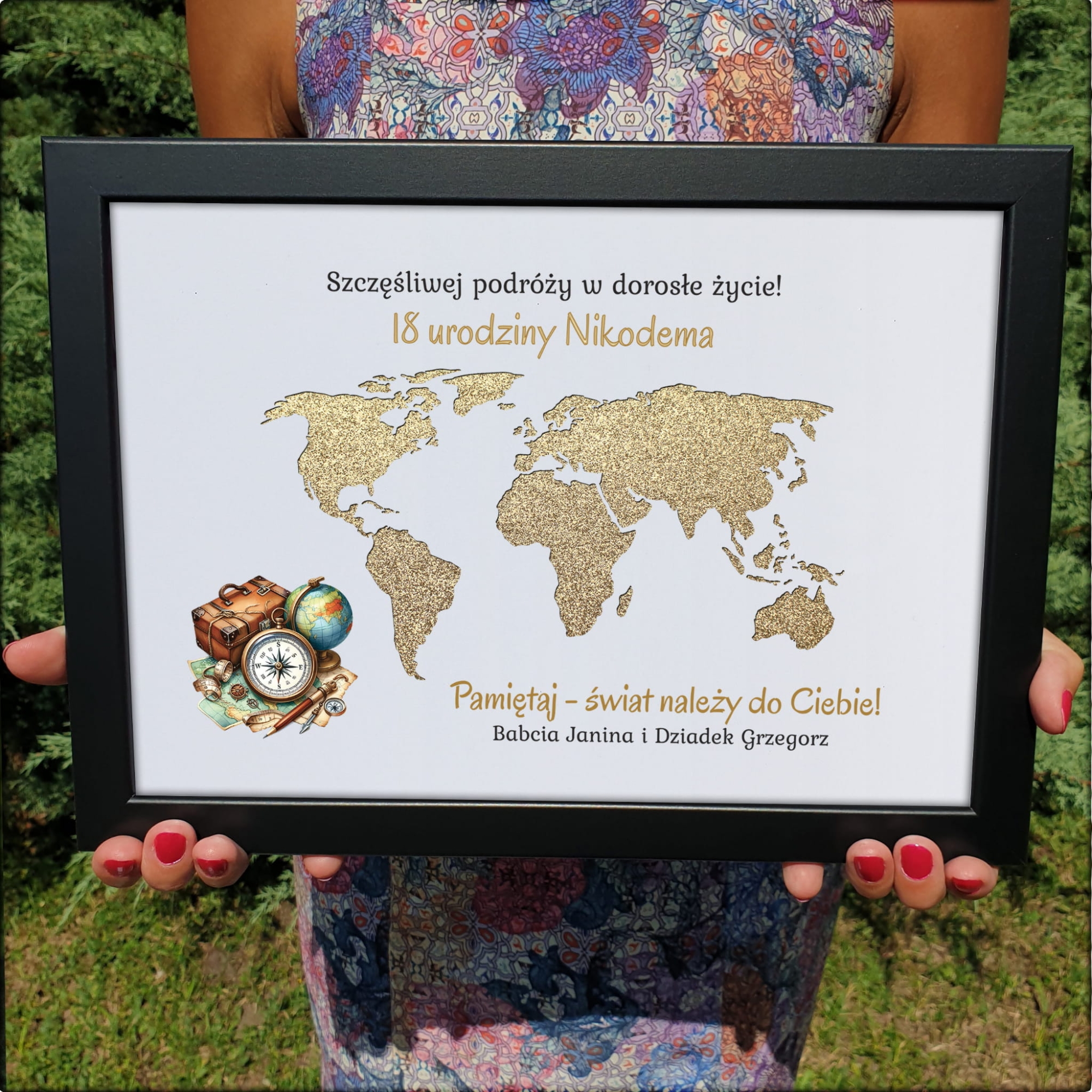 Czarna ramka A4 upominek na 18te urodziny z podpisem mapa świata