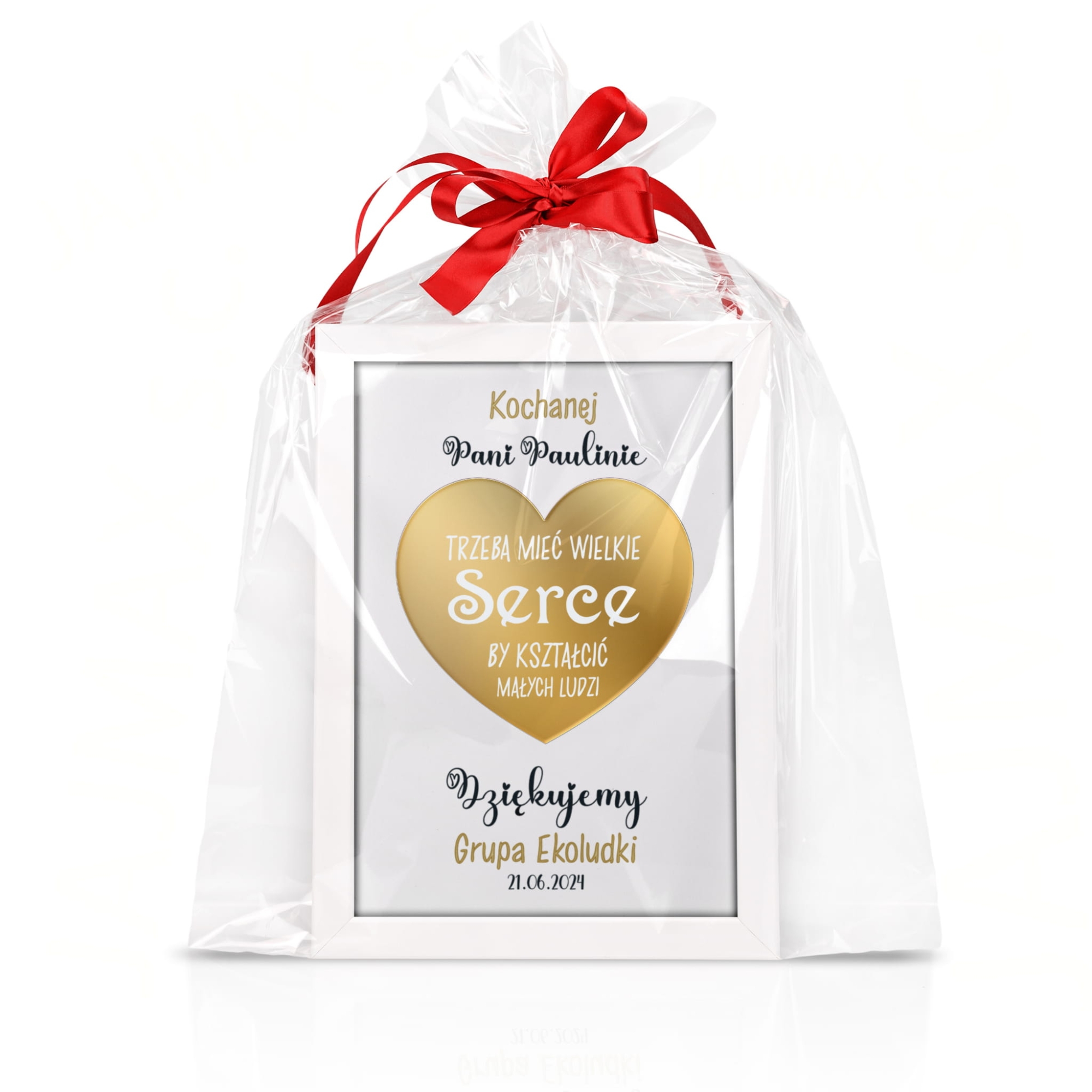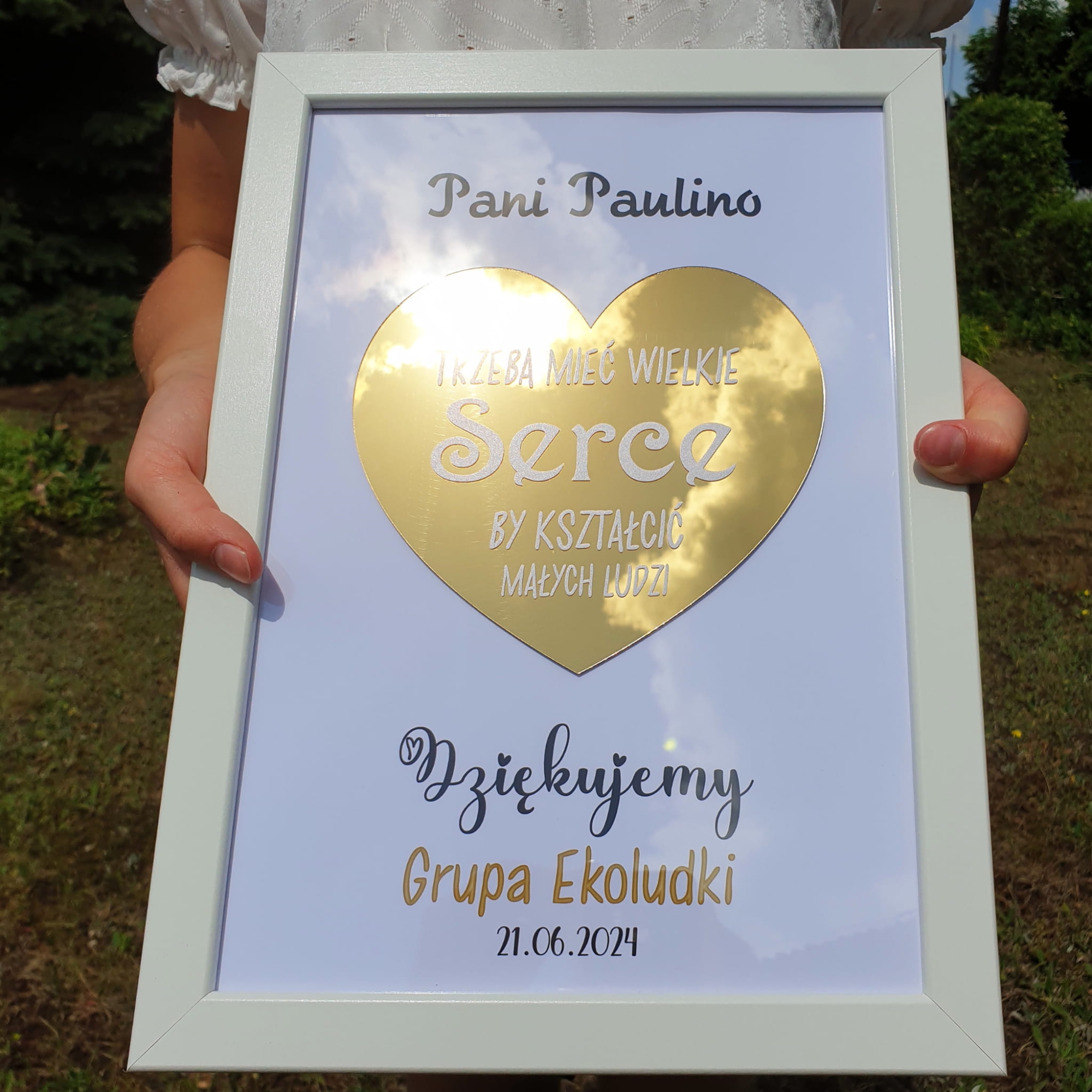 Na środku znajduje się złote lustro w kształcie serca z napisem: „Trzeba mieć wielkie serce, by kształcić małych ludzi”. Poniżej personalizowana dedykacja z imieniem nauczyciela, nazwą klasy i datą uroczystości. Całość zamknięta w estetycznej ramce, gotowej do wręczenia.